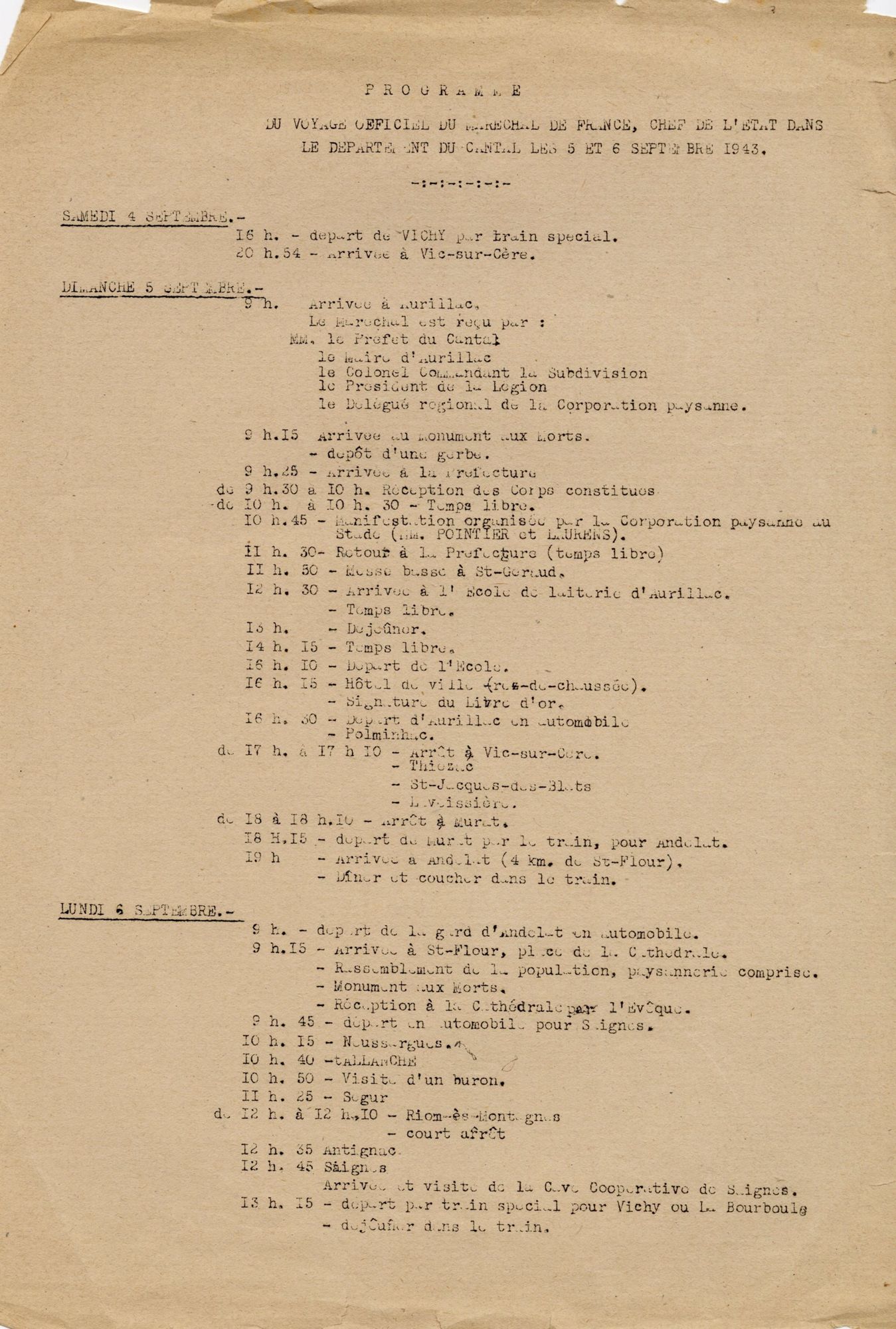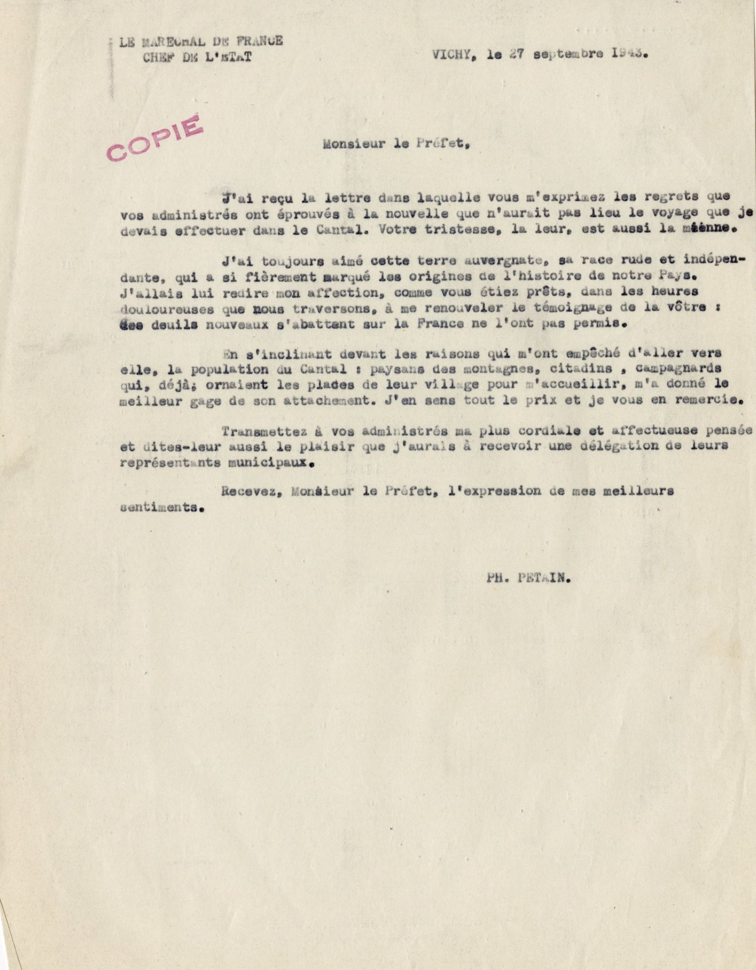 Le 4 septembre 1943, le préfet Homo adresse au Maréchal sa peine et, malgré tout celle de ses administrés après l’annulation du voyage, lui rappelant que c’est la troisième fois que le chef de l’Etat reporte sa visite dans le Cantal.