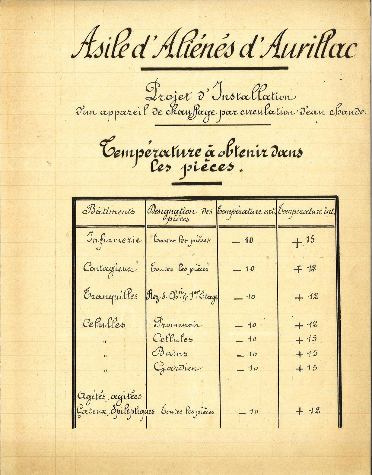 Le document présenté ce mois-ci, et découvert lors du classement des archives anciennes de l’hôpital d’Aurillac, est un tableau de la température à obtenir dans les différentes pièces de l’asile d’aliénés suite à l’installation d’un système de chauffage central. Ainsi, les températures intérieures prévues en période de froid (température extérieure de - 10° C) varient de 12° à 15° C selon les pièces : 15° C pour l’infirmerie, les bains, les cellules et le logement du gardien mais seulement 12° C pour les bâtiments accueillant des malades. On peut noter que les différents bâtiments sont affectés en fonction de la pathologie des patients qu’ils accueillent : « contagieux », « tranquilles », « agités », « gâteux » ou « épileptiques ». On remarque aussi que la terminologie employée a fortement évolué depuis la fin du XIXe siècle avec les progrès de la psychiatrie.