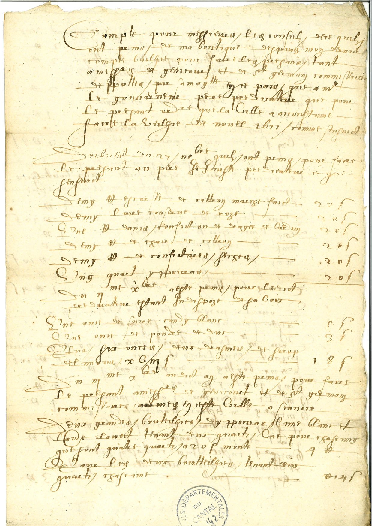 Depuis le XIIIe siècle, la ville d’Aurillac a obtenu le droit de s’administrer de manière autonome et pour partie affranchie de la tutelle du seigneur abbé de Saint-Géraud. Dans la partie sud de l’actuel territoire français, cette administration communale d’Ancien Régime est désignée sous le terme de consulat. En 1611, les consuls aurillacois sont au nombre de trois : Jean Chanut, François Ganthier et Jacques Verdier. Comme il semble être de coutume à la lecture du texte, ils offrent divers présents pour Noël : « Pour M[onsieu]r le lieutenant général ung pain de sucre Pezant deux livres et demy Deux boyttes de dragée pezant 1 [livre] Ung quart yppoccras », « A m[onsieu]r le prédicateur 1 quart yppoccras », « A mess[ieur]s de Textoris, Cambefort Casses Et Savy audicteurs de comptes, ung Quart a chascung », « A mess[ieur]s Castel juge Contrastin pro[cureu]r Et Borie greffier de la ville ung quart A chascung », « A m[essieu]r Destannes advocat pour partie des services Randus à la ville ung quart yppocrras Deux boyttes de dragée ». Ce document, comme plus généralement l’étude des comptes consulaires, révèle un principe de gestion essentiel mis en exergue par les historiens : les consuls consacrent une grande partie de leur budget aux libéralités. Il peut s’agir, comme ici, d’honorer et de remercier des personnages importants et influents, utiles au pouvoir. Le don est un instrument de conservation du pouvoir. D’autant plus, que depuis 1584 et une ordonnance d’Henri III, les consuls sont élus dans les derniers jours de décembre, communément le vendredi d’après Noël. Les fêtes de Noël sont une occasion supplémentaire pour les consuls de faire preuve de prodigalité.