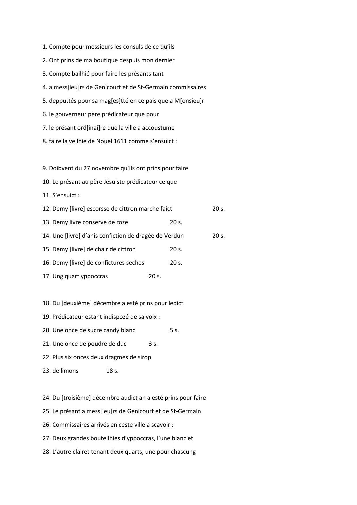Ce texte est un parfait exemple de cette « politique du présent ». Il tient aussi le compte des « présants tant a mess[ieu]rs de Genicourt et de St-Germain commissaires depputtés pour sa mag[es]tté en ce pais que a M[onsieu]r le gouverneur père prédicateur ». Le père Jésuite se voit offrir le 27 novembre : « Demy [livre] escorsse de cittron », « Demy livre conserve de roze », « Une [livre] d’une confection de dragée de Verdun », « Demy [livre] de chair de cittron », « Demy [livre] de confictures seches » et « Ung quart yppoccras ». Les conserves de roses, le plus souvent de Provins, étaient une préparation médicinale employée pour son pouvoir astringent dû au quercitrin et au tanin. Les dragées, quant à elles, auraient été créées par un apothicaire de Verdun, en 1220, afin de faciliter le transport des amandes en les enrobant de sucre et de miel. Enfin, l'hypocras est une ancienne boisson à base de vin, sucrée et aromatisée aux épices. Et comme « ledict Prédicateur estant indispozé de sa voix », les consuls lui offrent à nouveau le deux décembre : « Une once de sucre candi blanc », lequel était utilisé en thérapeutique dès le XIe siècle comme pectoral, une « once de poudre de duc », mélange de cannelle, gingembre, cardamone, girofle et sucre, ainsi que du « sirop de limone ». Cette apparente générosité n’est sans doute pas désintéressée. On sait par ailleurs, que depuis plusieurs années, les consuls aurillacois cherchent à obtenir des jésuites qu’ils acceptent de diriger le collège de la ville fondé au XVIesiècle[2]. Ces présents sont un moyen d’entretenir de bonnes relations avec les jésuites.