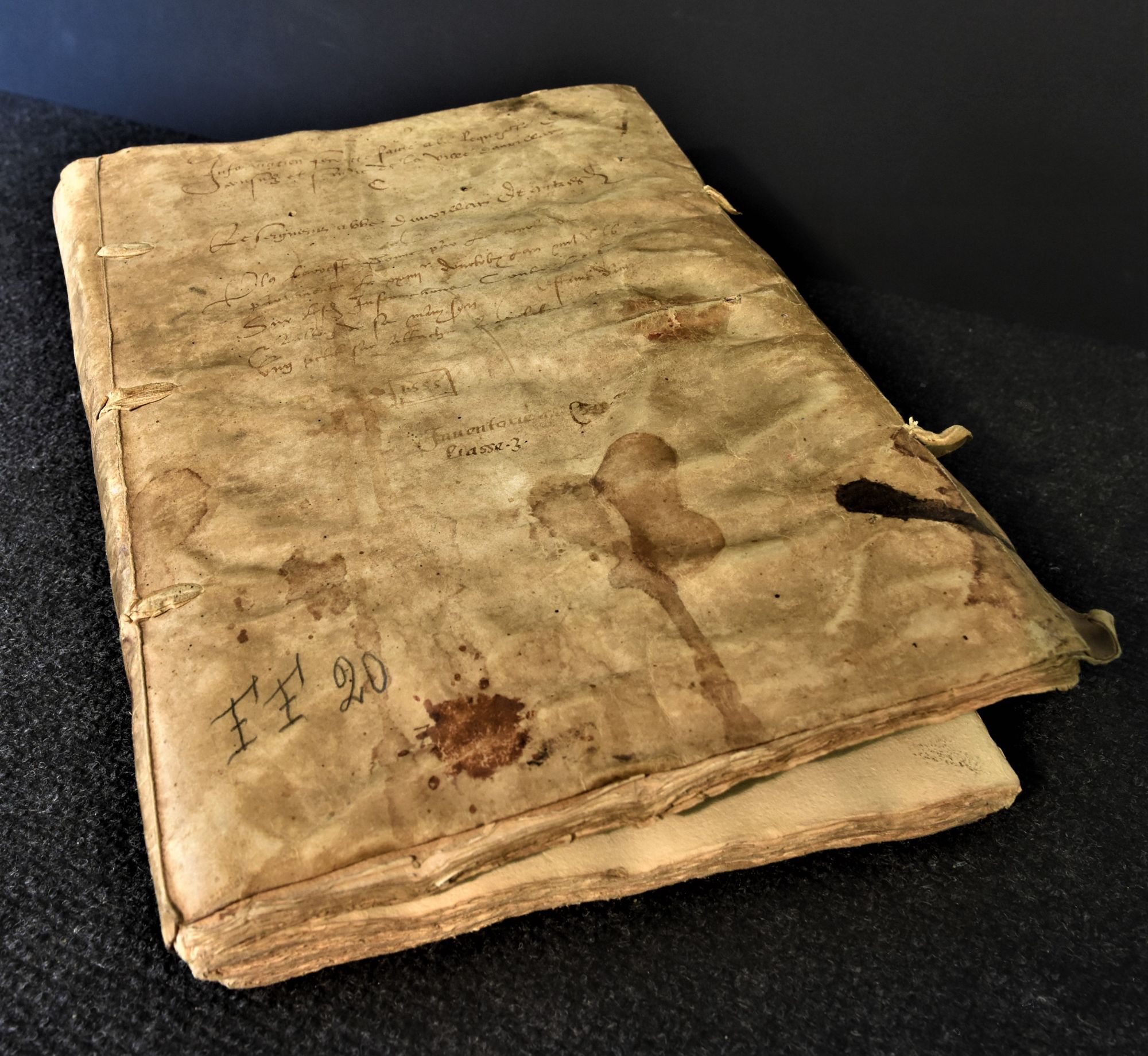 Ce document, extrait des archives communales de la ville d’Aurillac et désormais conservé aux Archives départementales, est connu sous l’appellation d’enquête ou d’instruction secrète[1]. Il s’agit en réalité d’une information judiciaire ouverte à la demande des consuls de la ville d’Aurillac contre le seigneur abbé de Saint-Géraud et autres ecclésiastiques. Il se présente sous la forme d’un manuscrit composé de cinq cahiers papier reliés ensemble par quatre lanières en parchemin et recouvert d’un autre parchemin, pour un total 156 folios manuscrits.