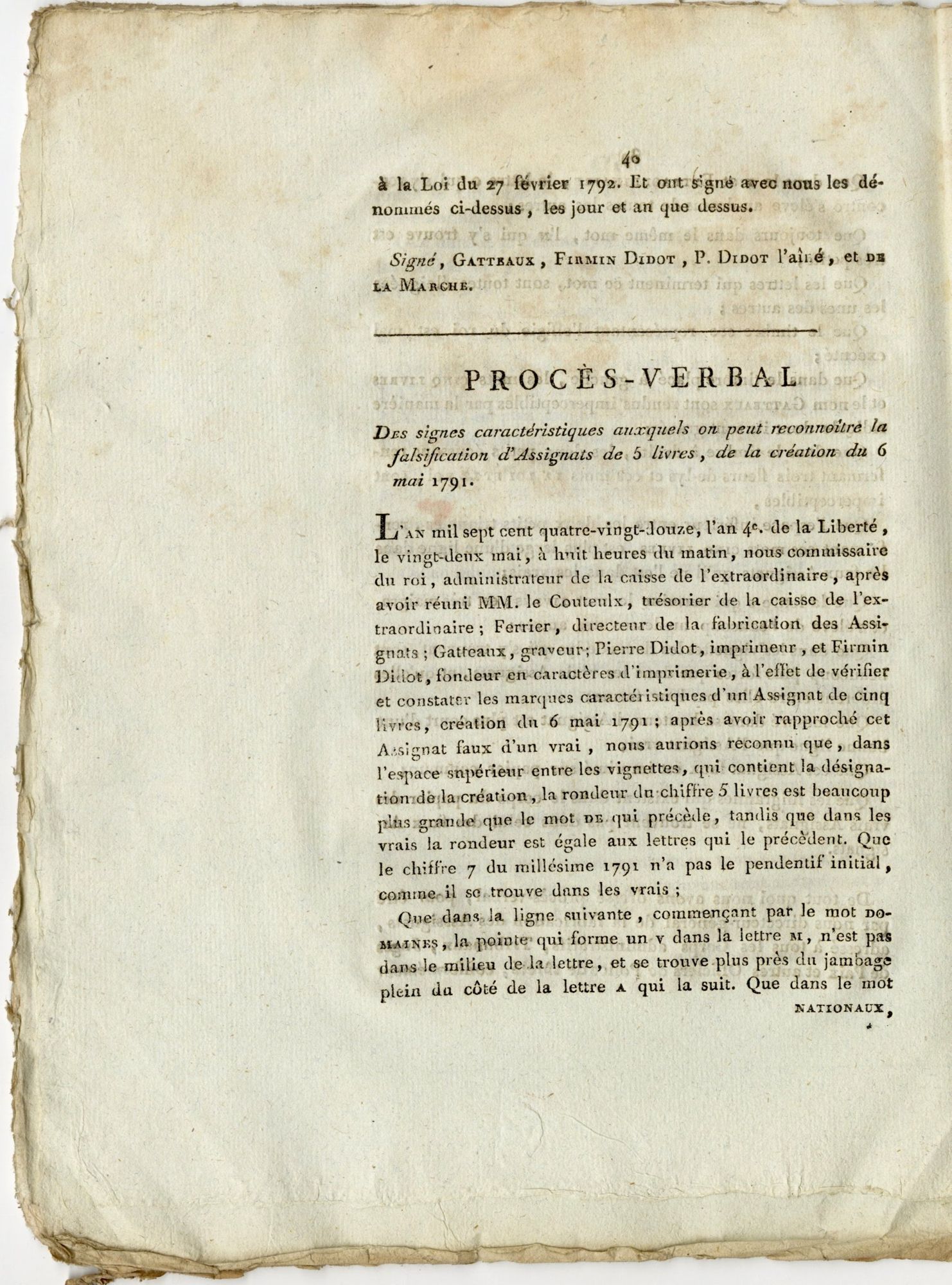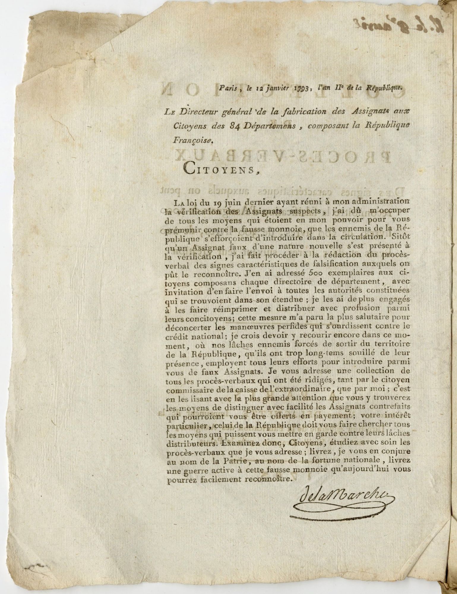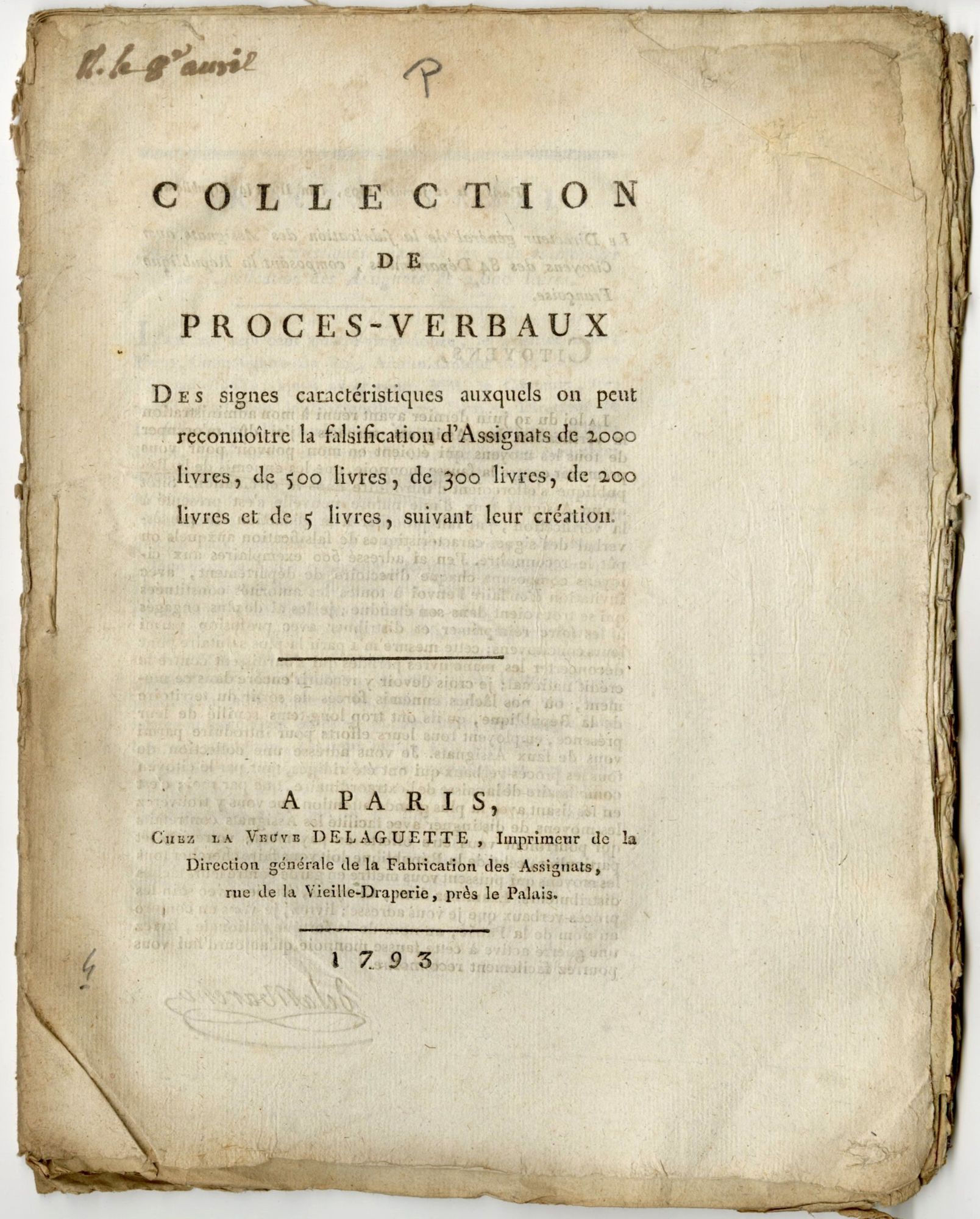 De plus, les assignats sont facilement falsifiables et les faussaires très nombreux. Si beaucoup de faux sont assez grossiers et facilement décelables, il en va autrement des faux imprimés à l’étranger pour le compte des royalistes. Une grande quantité de faux assignats, fabriqués en Belgique, en Hollande, en Allemagne, en Suisse et en Grande-Bretagne, avec la complicité du gouvernement britannique, alors l’un des principaux ennemis de la France, circulent dans le pays. La lutte contre la contrefaçon devient une priorité pour la République. En 1793, la Direction générale de la Fabrication des Assignats publie une « collection de procès-verbaux des signes caractéristiques auxquels on peut reconnoître la falsification d’Assignats ». En préambule, le directeur général Delamarche, rappelle : « j’ai dû m’occuper de tous les moyens qui étoient en mon pouvoir pour vous prémunir contre la fausse monnoie, que les ennemis de la République s’efforçoient d’introduire dans la circulation. Sitôt qu’un Assignat faux d’une nature nouvelle s’est présenté à la vérification, j’ai fait procéder à la rédaction du procès-verbal des signes caractéristiques de falsification auxquels on pût le reconnoître ». Il souhaite une diffusion la plus large possible de cette collection de procès-verbaux qui doit donner « les moyens de distinguer avec facilité les Assignats contrefaits ».