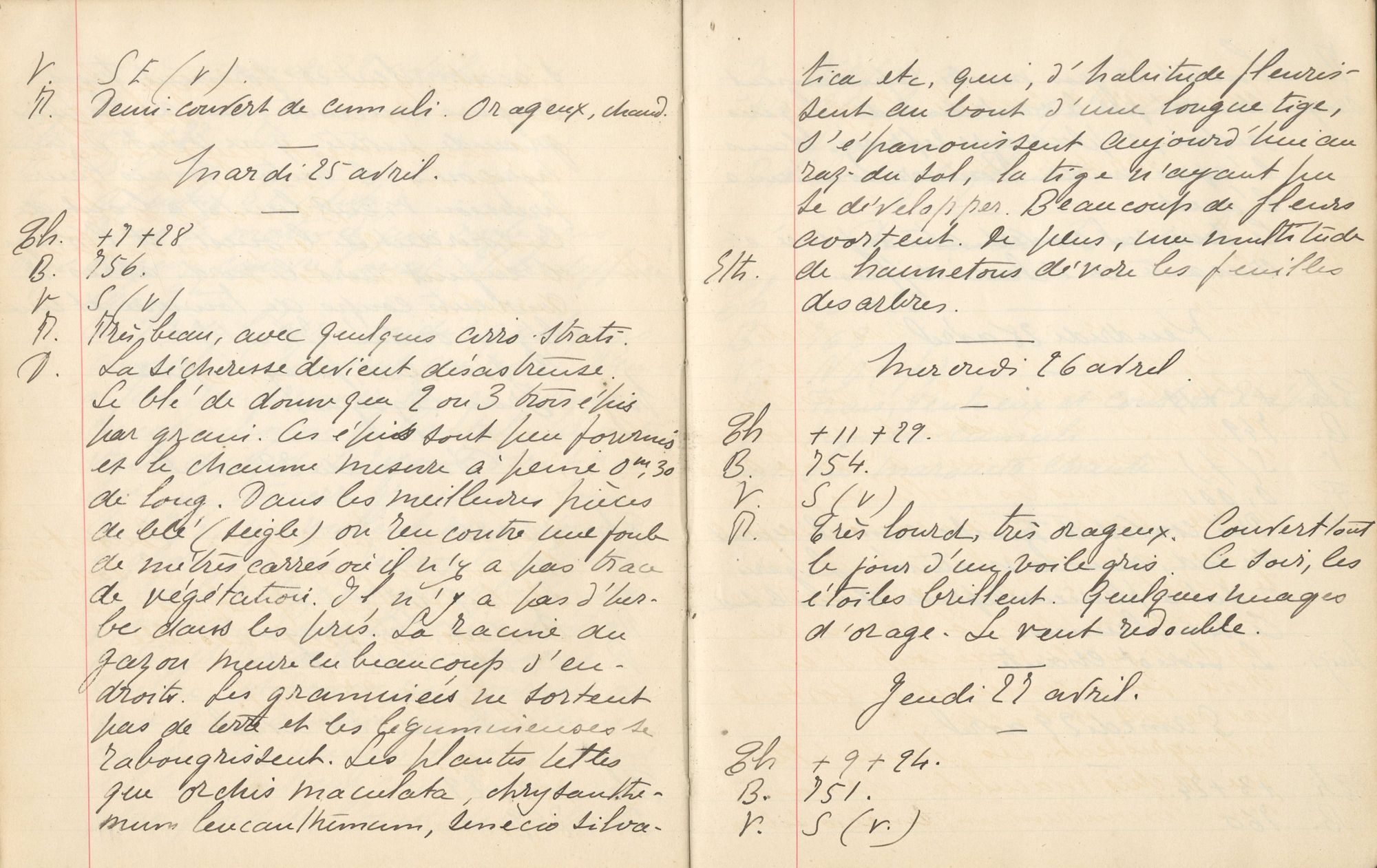 Pierre Marty ne se contente pas de remplir les cartes d’observations à destination de la commission météorologique, il consigne aussi ses relevés hebdomadaires dans des carnets personnels, en les enrichissant de nombreuses annotations[4]. Plus riches et plus éloquentes que de simples relevés, elles permettent d’avoir le ressenti d’un témoin direct des évènements. Pour le mois d’avril, il note « Ce mois est remarquable par sa grande chaleur et surtout par sa grande sécheresse ». Car non seulement le temps est sec mais il est aussi très chaud avec un maximum de 32° relevé le 22 avril. Les relevés s’effectuent avec deux thermomètres à maxima et à minima disposés au nord, à une certaine distance des murs, et protégés de la pluie et du soleil par un abri. Il s’agit donc bien de températures sous abris assez comparables aux relevés météos actuels. Sur la période 1981-2010, le record pour un mois d’avril à Aurillac est de 26,5°. Ce mois d’avril 1893 est historique et les conséquences pour l’agriculture sont catastrophiques. Le 25 avril, Pierre Marty écrit « La sécheresse devient désastreuse. Le blé ne donne que 2 ou 3 épis par grains. […] Il n’y a pas d’herbe dans les prés ». Et si comme nous l’avons vu, le mois de mai est plus humide, l’accalmie est de courte durée. Le mois de juin « est remarquable par la persistance de la sécheresse, qui brûle sur pied presque tous les foins ». Il relève 11 jours avec une température maximale égale ou supérieure à 30°, dont 36° le 11 juin. A la fin du mois d’août : « La sécheresse est épouvantable. Elle tarit les mares et cause des dysenteries. Les sources même qui jamais ne baissaient sont taries […]. La rivière est presque à sec. Le regain est résorbé. La fleur de blé noir est brûlée ».