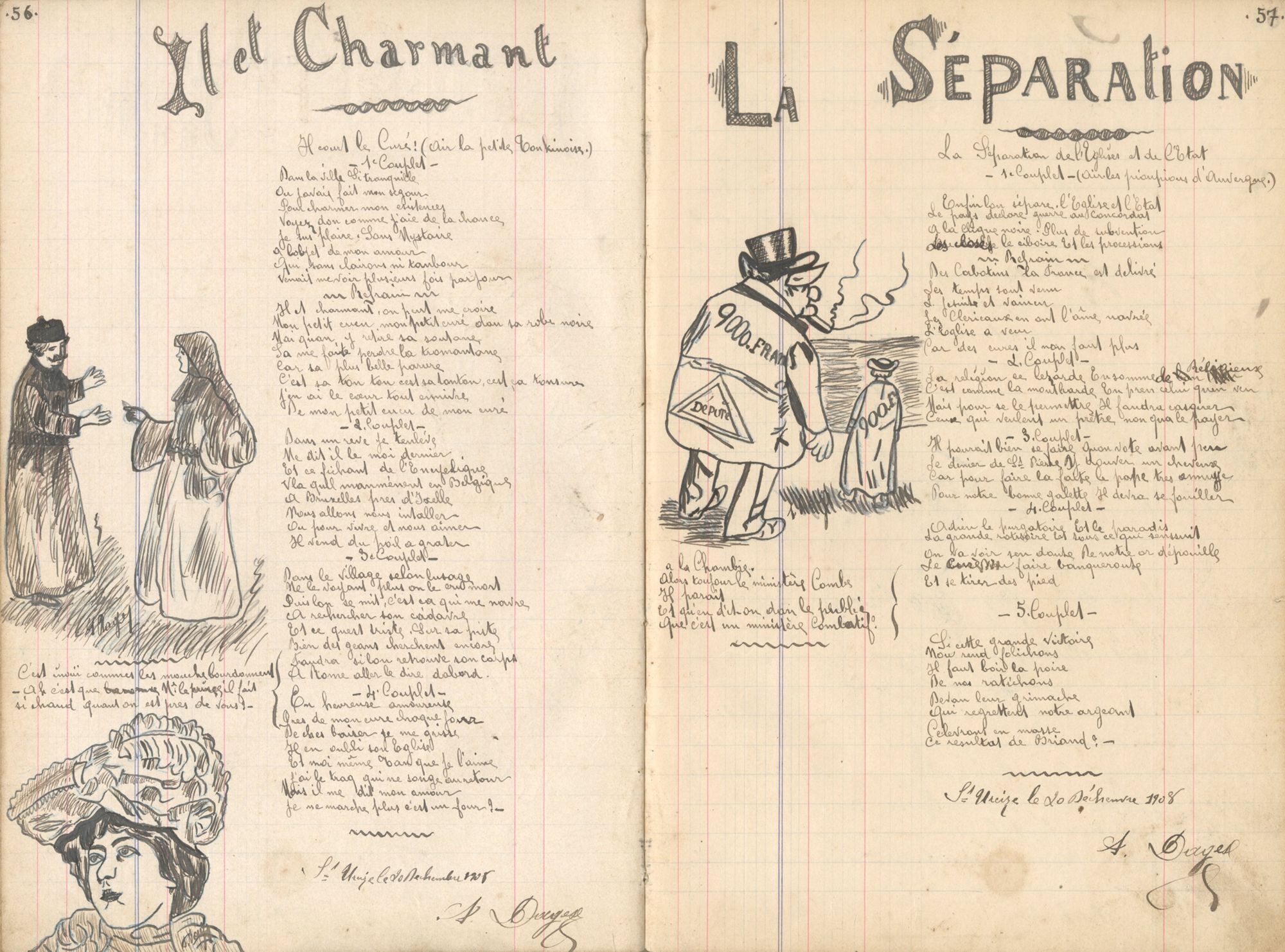 Dans un tout autre genre, les premières pages de ce registre contiennent une importante collection de chansons populaires. Entre décembre 1906 et décembre 1908, notre cantonnier a ainsi recopié les paroles de 57 chansons, tout en les accompagnant, pour chacune d’entre elles, d’illustrations parfois grivoises, le plus souvent humoristiques, et non dénuées d’un certain talent. En ce sens, ce document est un véritable témoignage de cette culture populaire du début du XXesiècle et peut être utile à l’histoire de la chanson française de la Belle-Epoque. Le répertoire d'alors est essentiellement composé de chansons à thème sentimental, mélodramatique, léger ou de comique troupier ainsi que de chansons grivoises. On peut citer entre autres : « Les cochers de Paris », « Le bonheur des époux », « La fianché du matelot », « Ma fanchette », « Tu m’as trompée », « La noce des nez ». Certaines reflètent aussi l’air du temps comme les chansons patriotiques - « Les rubans de l’Alsacienne » ou « L’orpheline Alsacienne » -, ou anticléricales telles que « La séparation » qui traite de la séparation des églises et de l’Etat avec pour refrain « Des cabotins la France est délivrée, les temps sont venus, le jésuite est vaincu, les cléricaux ont l’âme navrée, l’Eglise a vécu, car des curés il n’en faut plus ». Alexandre Dages reprend ce travail de collecte un peu plus tard puisqu’on retrouve plus loin dans le registre, des pages 137 à 208, plus d’une soixantaine de nouvelles chansons recopiées entre octobre 1909 et décembre 1919.
