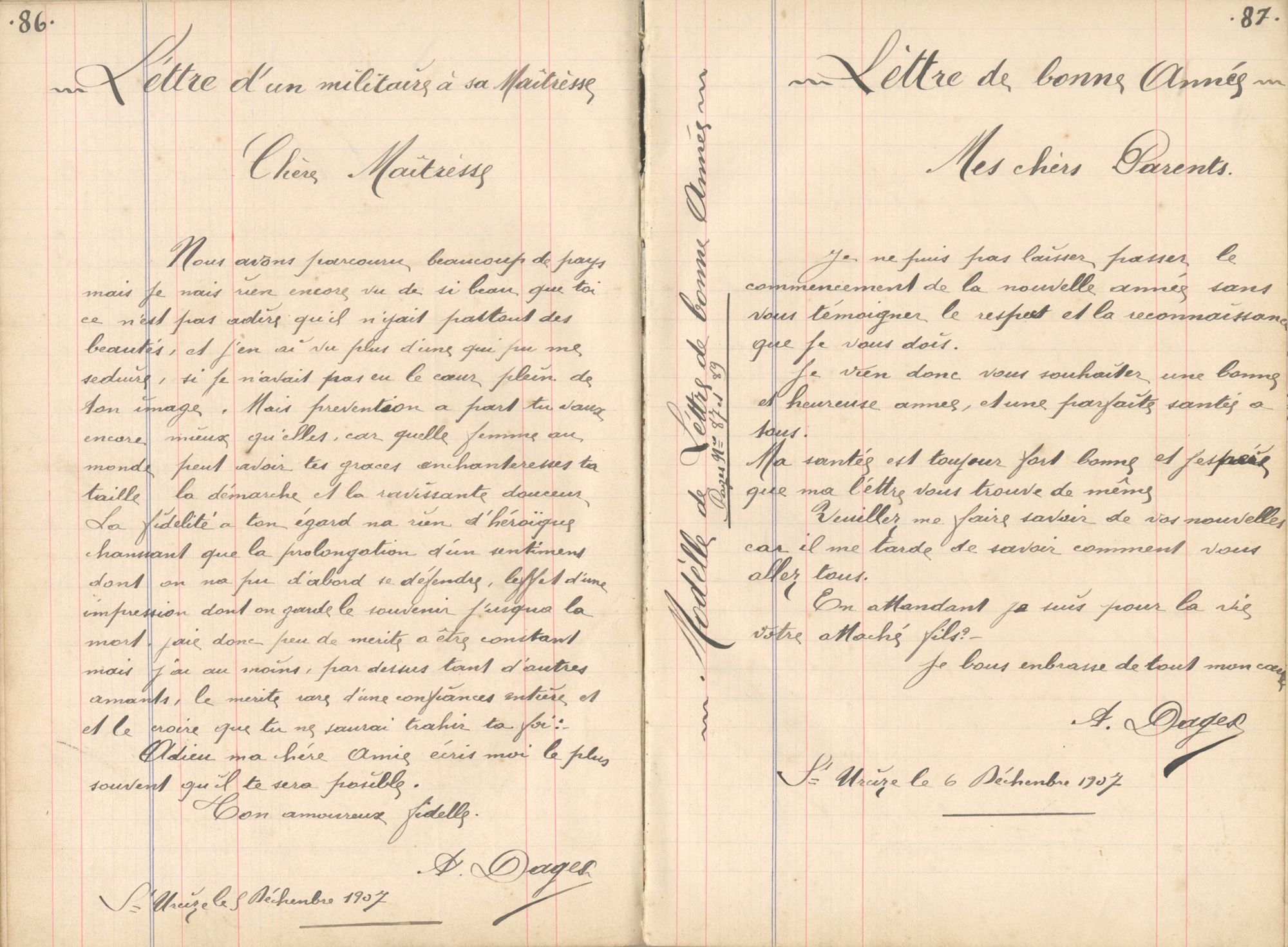 Des pages 58 à 101, Alexandre Dages a ainsi recopié différents modèles de lettres, documents ou contrats utiles à la vie quotidienne : « police entre un propriétaire et un ouvrier », « certificat du maitre envers son domestique », « testament », « bail à maison », « quittance », « lettre de change »… On y trouve aussi des lettres au caractère plus intime comme cette timide « lettre de déclaration d’amour » : « Mademoiselle. J’ai combattu longtemps la plus honorable et la plus respectueuse passion qui jamais est rempli le cœur d’un homme. Souvent j’ai voulu vous la déclarer de vive voix, plus souvent encore j’ai tenté de vous écrire. Mais je n’ai jamais pu trouver assez de courage pour accomplir mon dessein [sic] ». Suivie de près par une lettre bien plus assurée « d’un militaire à sa maîtresse » : « Nous avons parcouru beaucoup de pays mais je n’ai rien encore vu de si beau que toi, ce n’est pas à dire qu’il n’y ait partout des beautés, et j’en ai vu plus d’une qui put me séduire, si je n’avais pas eu le cœur plein de ton image ». Viennent ensuite des modèles de lettres d’amitié, de bonne année ou encore de condoléances.