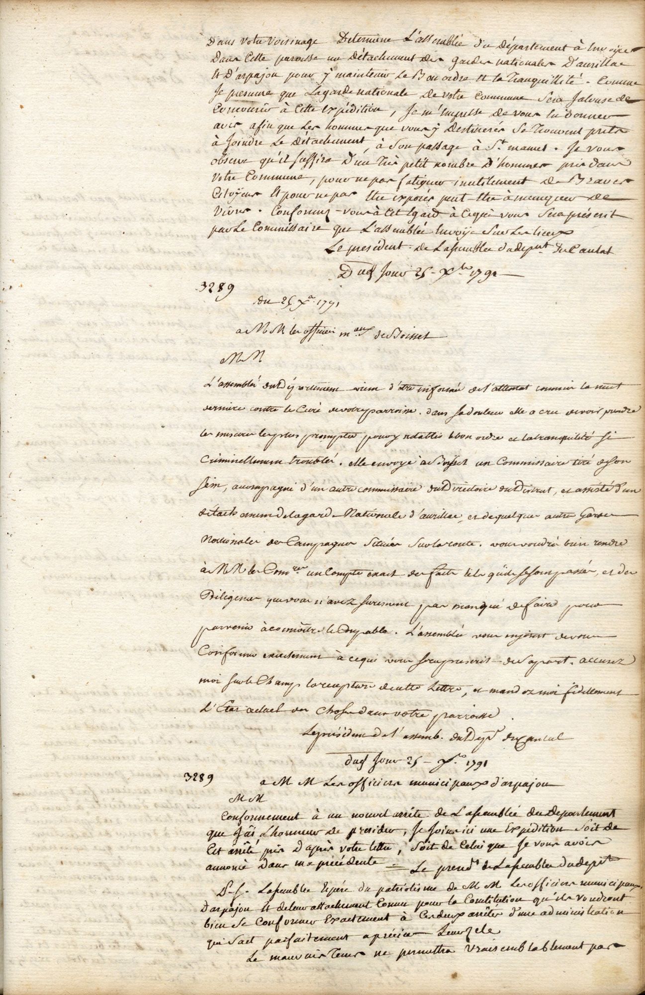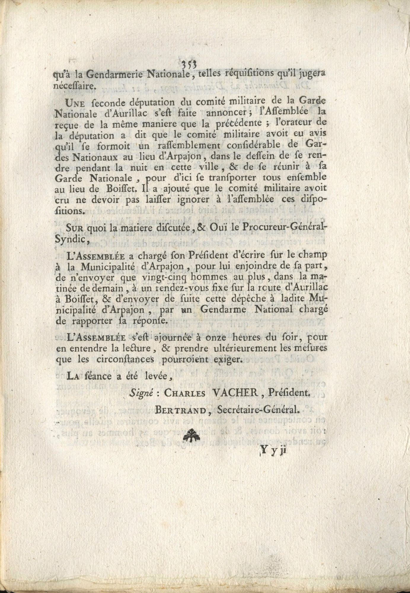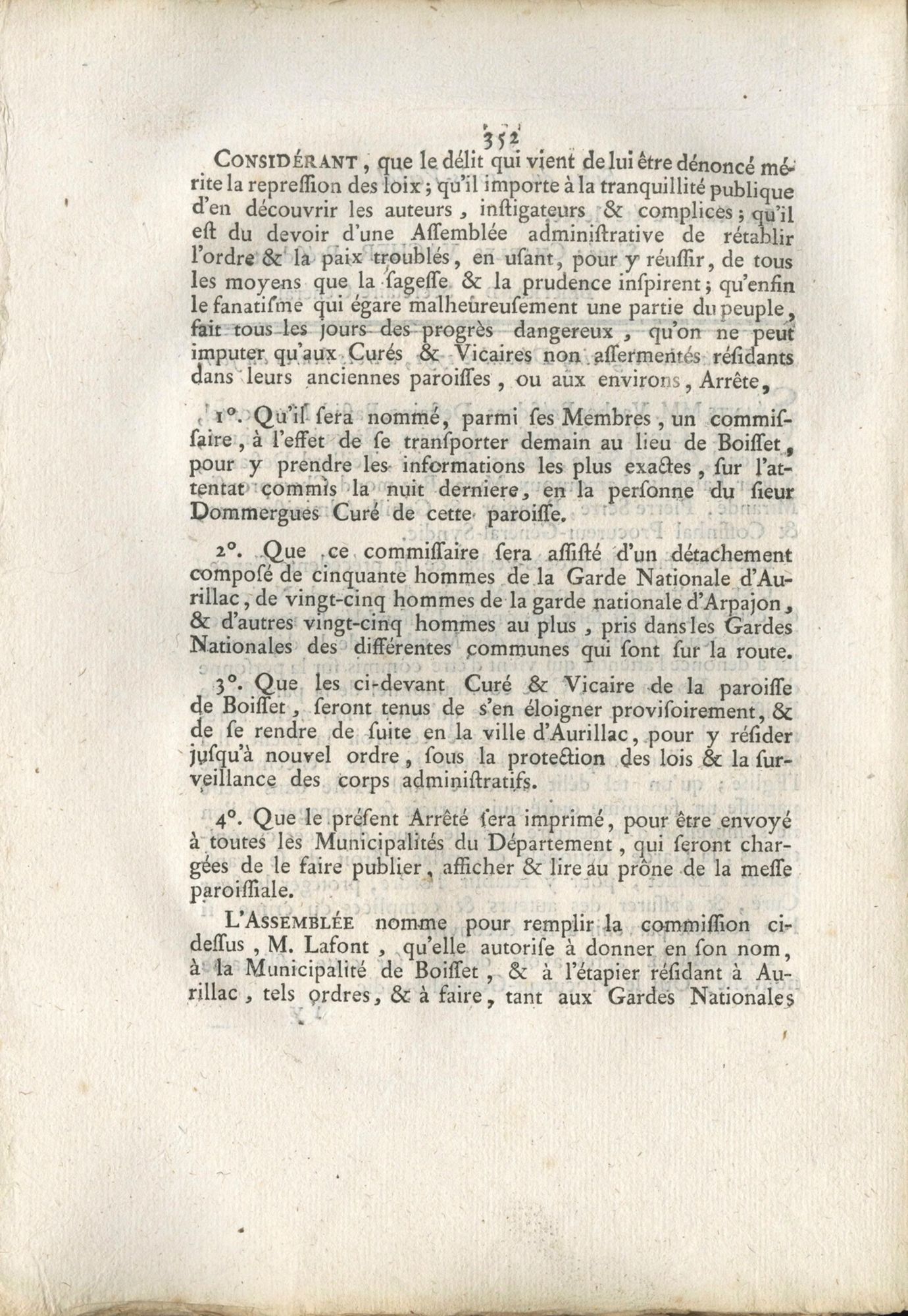 Suite à sa prestation de serment, Pierre Dommergues est nommé curé de la paroisse de Boisset par l’Assemblée électorale du district d’Aurillac le 2 mai 1791. Il entre assez rapidement en conflit avec l’abbé Rieu, prêtre réfractaire, l’empêchant de célébrer la messe en l’église paroissiale en lui refusant l’accès à la sacristie. Le 29 octobre 1791, les administrateurs du district d’Aurillac le rappellent à l’ordre, la loi du 13 mai 1791 stipulant que « le défaut de prestation de serment ne pourra être opposé à aucun prêtre se présentant dans une église paroissiale seulement pour y dire la messe[3] ». Les choses s’enveniment, jusqu’à cette nuit de Noël, où Pierre Dommergues est victime d’un coup de feu en pleine messe. Pour les représentants de l’assemblée départementale, l’origine de cet attentat ne fait aucun doute : « Un tel délit annonce qu’il existe dans cette paroisse un fanatisme outré qui pourrait se propager si l’on ne s’empressait d’en détruire la cause […] qu’on ne peut l’imputer qu’aux curés et vicaires non assermentés résidant dans leurs anciennes paroisses ou aux environs ». Considérant qu’il est « du devoir d’une assemblée administrative de rétablir l’ordre et la paix troublés », ils arrêtent : « qu’il sera nommé, parmi les membres, un commissaire, à l’effet de se transporter demain au lieu de Boisset, pour y prendre les informations les plus exactes, sur l’attentat commis la nuit dernière », « que ce commissaire sera assisté d’un détachement de cinquante hommes de la garde nationale d’Aurillac, de vingt-cinq hommes de la garde nationale d’Arpajon, et d’autres vingt-cinq hommes au plus, pris dans les gardes nationales des différentes communes qui sont sur la route » et « que les ci-devant curé et vicaire de la paroisse de Boisset, seront tenus de s’en éloigner provisoirement ». Une nouvelle députation de la garde nationale d’Aurillac informe alors l’assemblée que les gardes nationaux d’Arpajon se sont déjà rassemblés en nombre « dans le dessein de se rendre pendant la nuit en cette ville, et de se réunir à sa Garde Nationale, pour d’ici se transporter tous ensemble au lieu de Boisset ». L’Assemblée souhaitant éviter une escalade de violence, écrit immédiatement aux officiers municipaux d’Arpajon. Si elle remercie la garde nationale de son « zèle » et « accepte avec empressement son assistance », elle leur demande, avec la plus grande diplomatie, de n’envoyer que vingt-cinq hommes au plus « pour ne pas fatiguer inutilement nos braves frères d’armes et pour ne pas exposer le détachement à manquer de vivres[4] ».