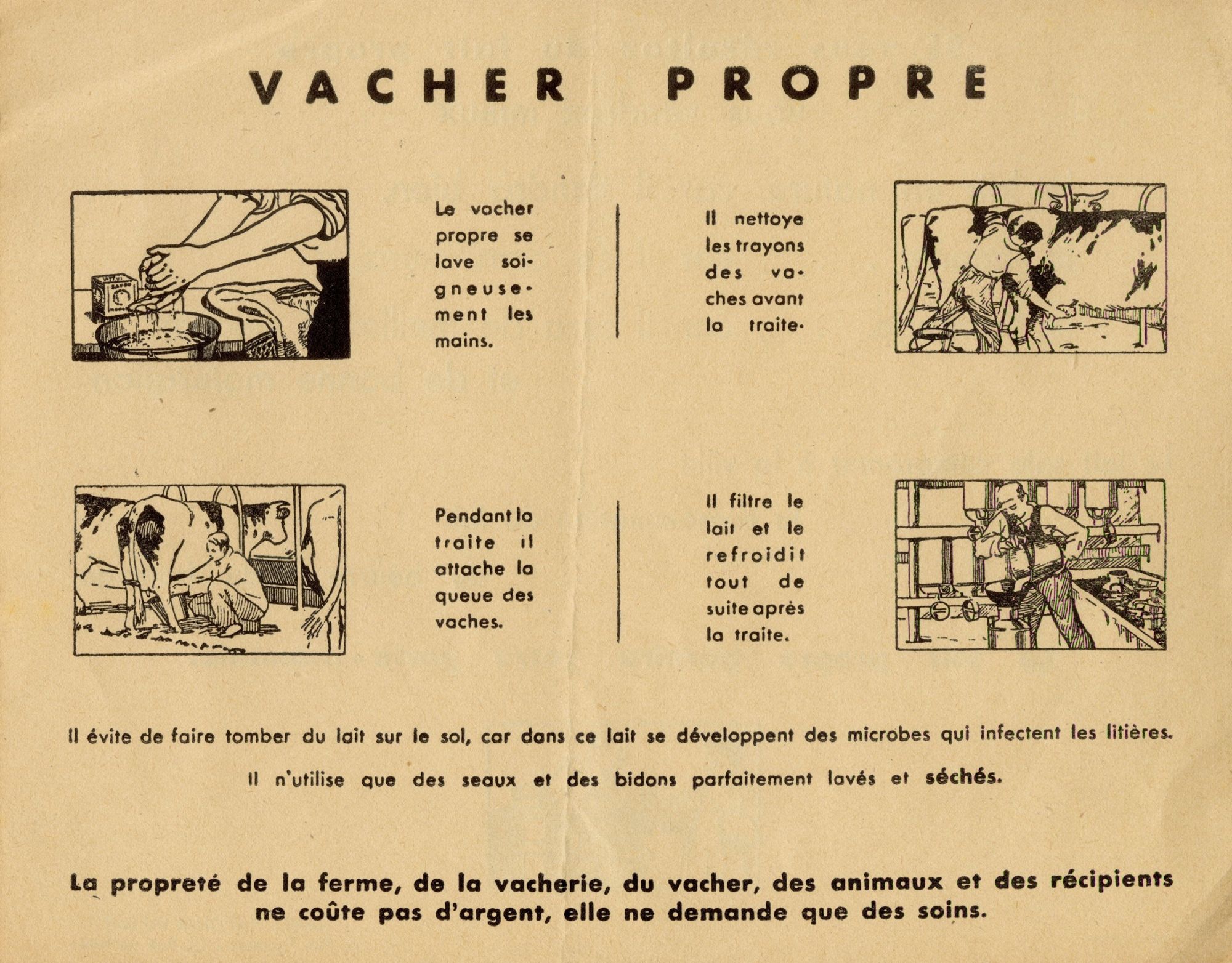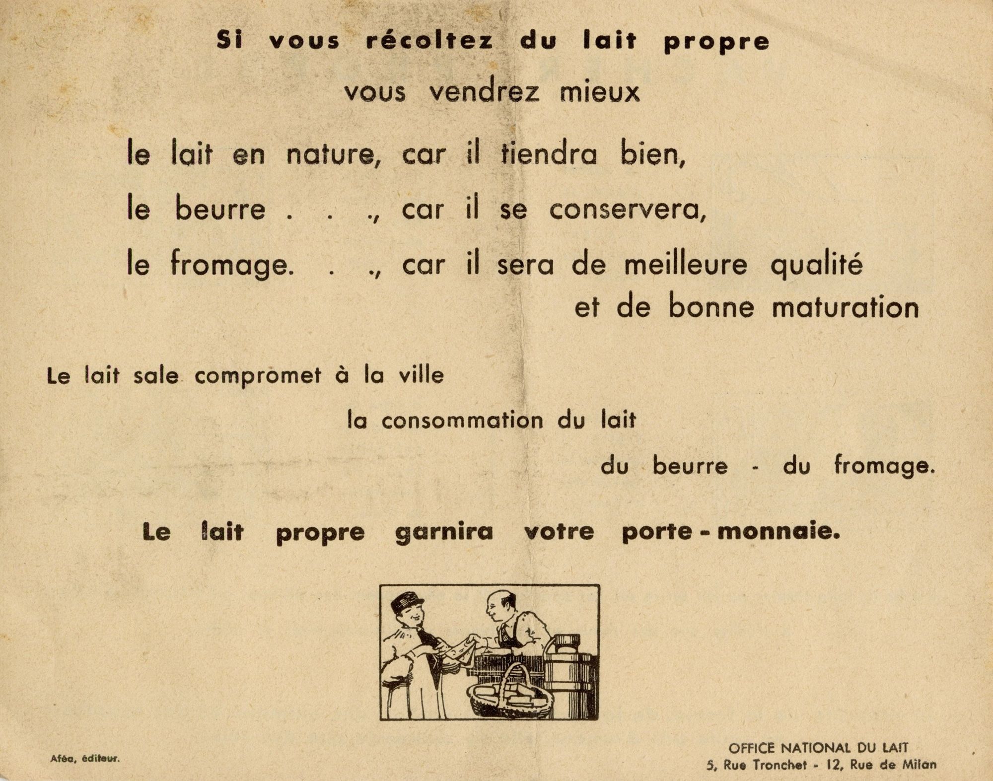 Paradoxalement, il n’est ici nullement question de santé publique, la plaquette présentant l’amélioration de la qualité du lait sous l’angle du développement économique de la filière et, surtout, de profits à espérer. Il est en effet rappelé aux producteurs que « le lait sale compromet à la ville la consommation du lait, du beurre, du fromage » tandis qu’un « lait propre garnira votre porte-monnaie » !