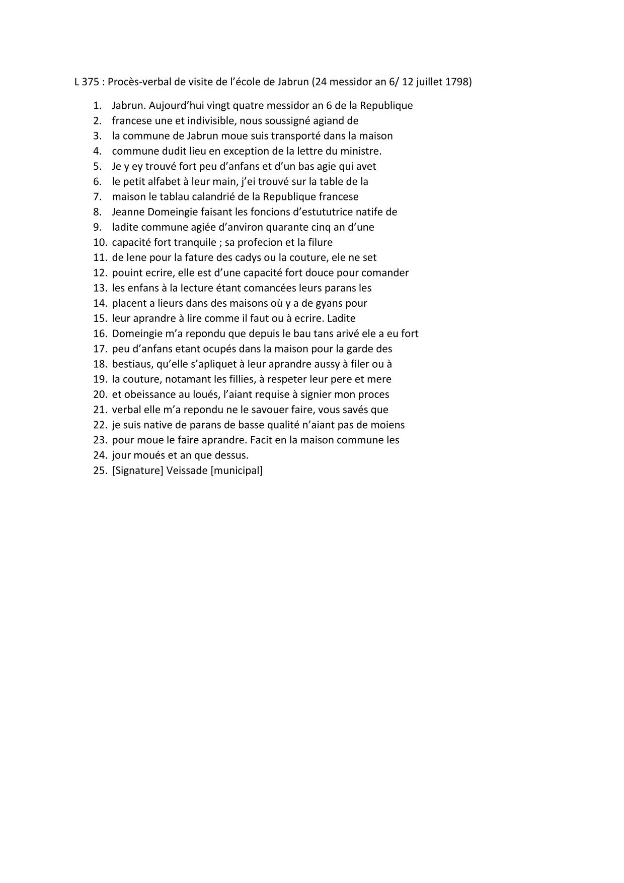 L’école de Jabrun n’est pas un cas isolé. La pénurie d’instituteurs oblige l’administration à faire des concessions et l’enseignement primaire public doit faire face à la concurrence des « écoles privées ». Comme le signale l’agent Veissade à propos des élèves de Jeanne Domeingie : « la lecture étant comancées leurs parans les placent a lieurs dans des maisons où y a de gyans pour leur aprandre à lire comme il faut ou à écrire ». Si cette école a le mérite d’exister, l’écart est grand entre les ambitions affichées par les révolutionnaires et la réalité du terrain.
