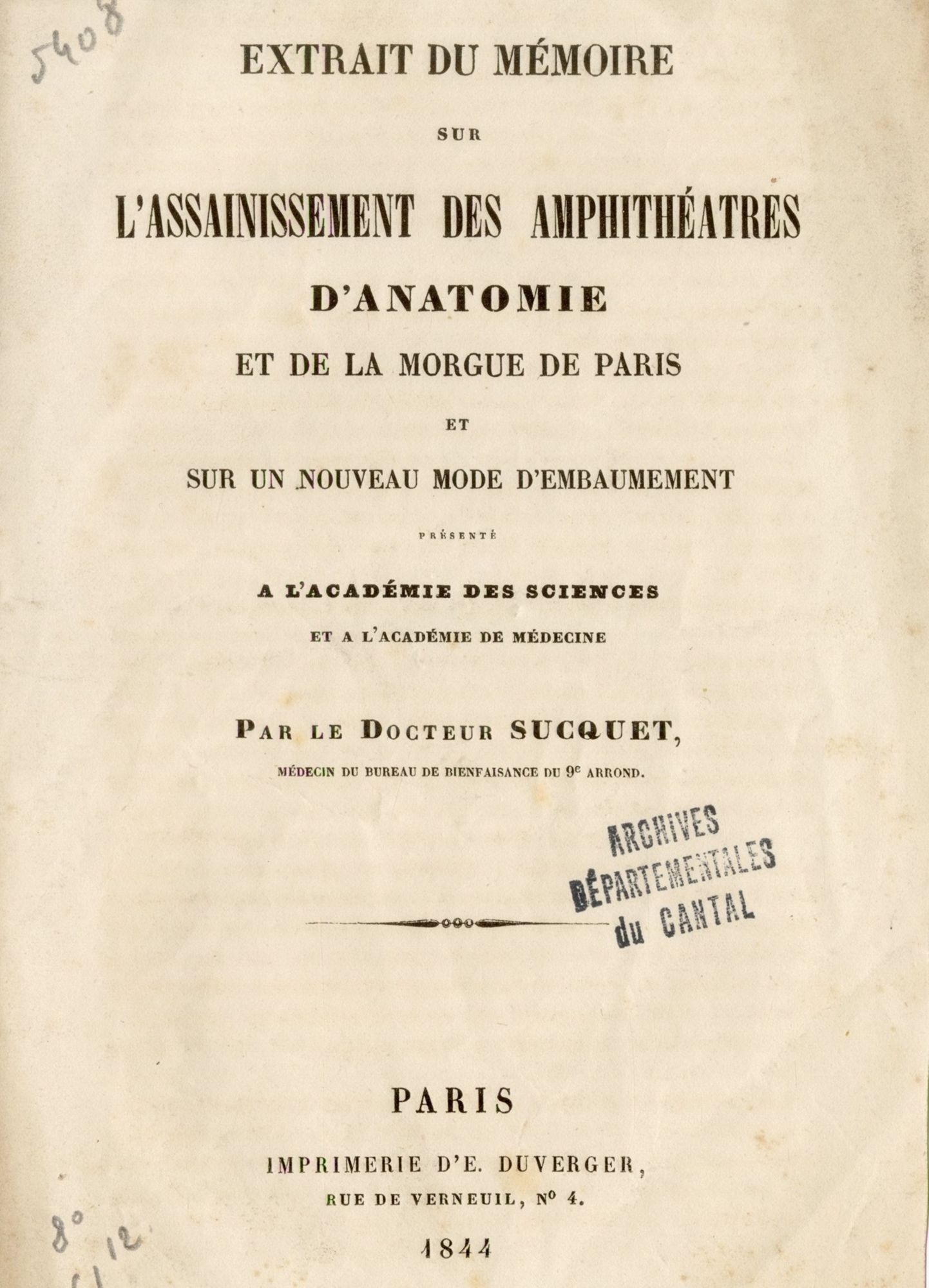 Le 15 août 1884, les obsèques du docteur Sucquet, « une de nos gloires médicales », furent célébrées en l’église Notre-Dame-aux-Neiges d’Aurillac en présence d’une « foule nombreuse »[1]. Illustre en son temps, son souvenir s’est peu à peu effacé et c’est au hasard d’une recherche que l’on redécouvre aujourd’hui ses travaux. La bibliothèque des Archives départementales, forte de plusieurs milliers d’ouvrages, conserve quelques-unes de ses publications. Le Docteur Sucquet, de son véritable nom Jean-Pierre Boissié, est né rue des Dames à Aurillac, le 6 novembre 1812, fils naturel de Marie Boissié, âgée de 21 ans. Nous ne savons rien de sa jeunesse si ce n’est qu’il semble avoir été adopté. En 1837, il dédicace sa thèse soutenue à la faculté de médecine de Paris sous le nom de Boissié-Sucquet d’Aurillac : « A celle qui m’a servi de mère. Affection d’un fils. B. Sucquet »[2]. Après ses études, il s’installe à Paris et poursuit ses travaux de recherche, tout d’abord dans le domaine de l’hygiène publique. Il travaille ainsi à l’assainissement des eaux ou encore à la conservation des corps dans les écoles de chirurgie. C’est au cours de ces recherches qu’il va s’intéresser au domaine bien particulier de l’embaumement, pour devenir un des fondateurs des techniques modernes appelées aujourd’hui thanatopraxie.