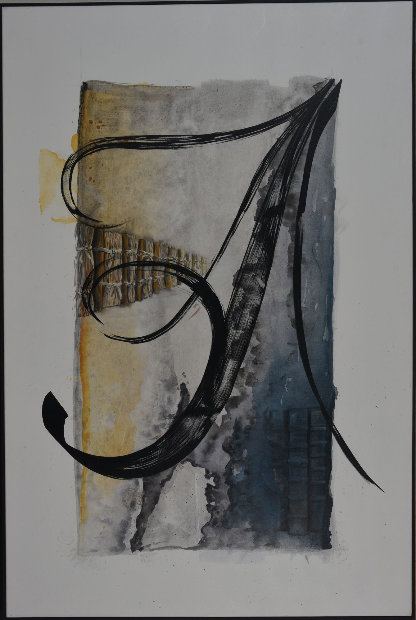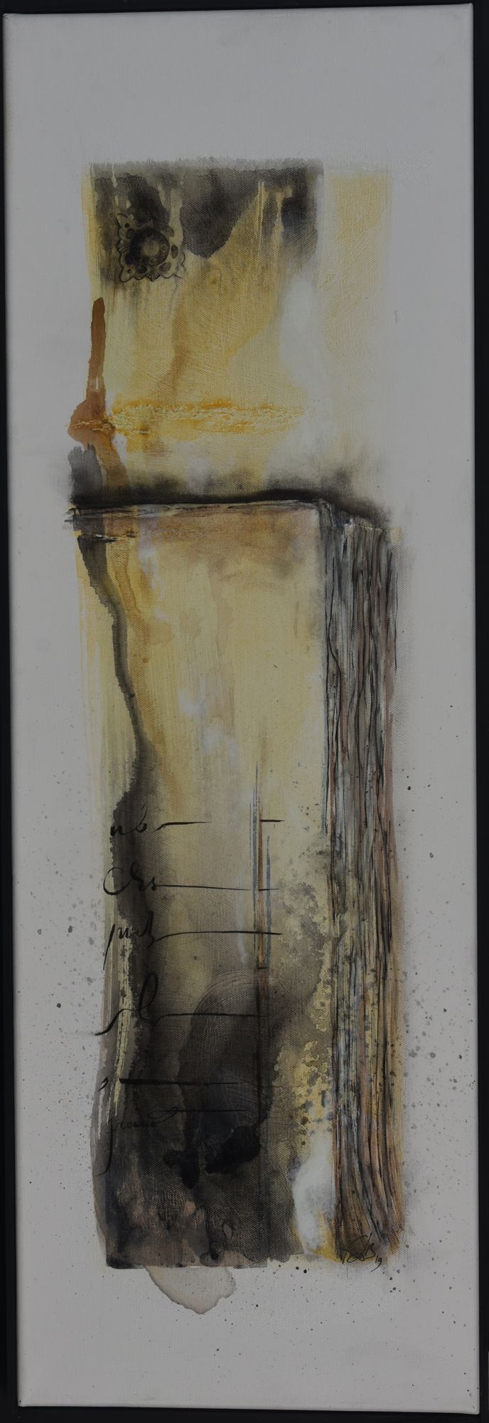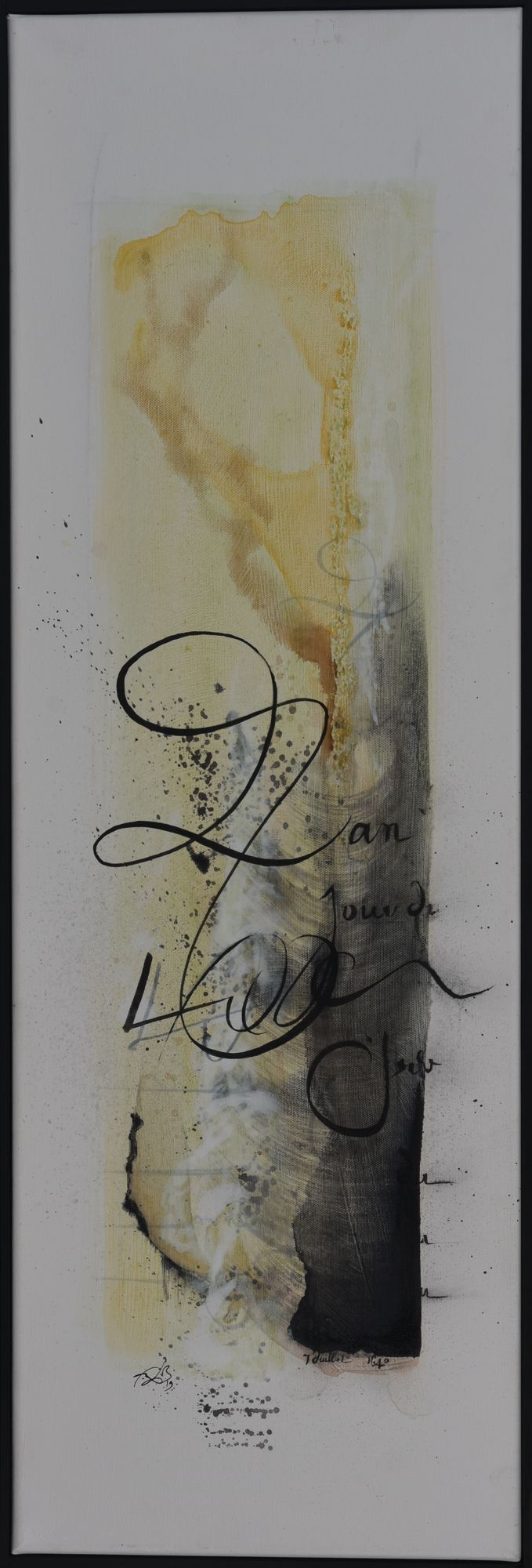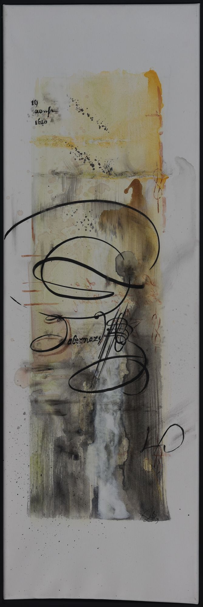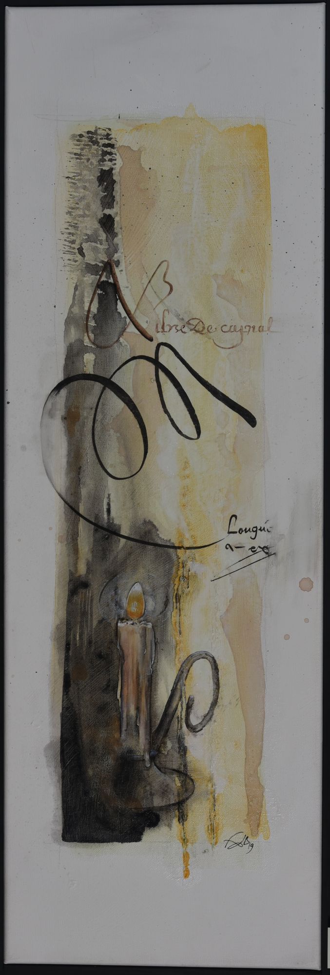 Pour ce projet d’exposition aux Archives départementale, elle compose avec les deux, figuratif et abstrait. Séduite par la calligraphie, art auquel elle ne s’était jamais confrontée, FabB s’est laissée imprégner du sujet pendant de longs mois avant de tenter de retrouver le geste de nos ancêtres. Les quinze toiles sont toutes peintes à l’acrylique, avec une technique d’aquarelle pour les fonds.