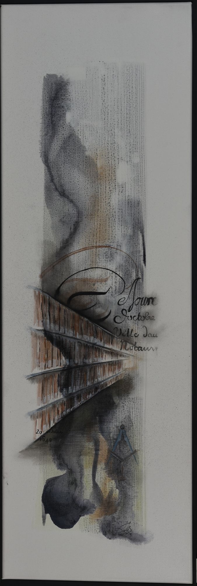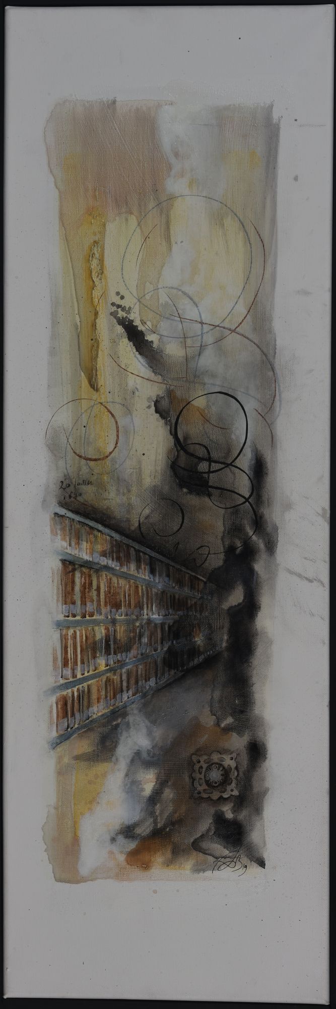 C’est ce geste, délié, envoûtant, qui a séduit FabB au point de s’imposer à son pinceau. Fascinée par ces courbes, elle a accepté la carte blanche que lui ont offerte les Archives : reproduire sur toiles sa découverte des documents. Les travées de registres dans les magasins, les initiales exubérantes des minutes notariales, les chiffres d’une date, les clous sur la couverture d’un ouvrage, mais aussi les décors d’insignes maçonniques ou l’étoile d’un blason : dans ses tableaux se mêlent et s’entremêlent, comme dans un rêve, les images à l’identique ou refaçonnées d’époques et de lieux divers. Dans ses tableaux se subliment les détails à l’origine purement administratifs ou fonctionnels en un doux éloge de ce qui fonde l’acte comme l’art : le geste du créateur.