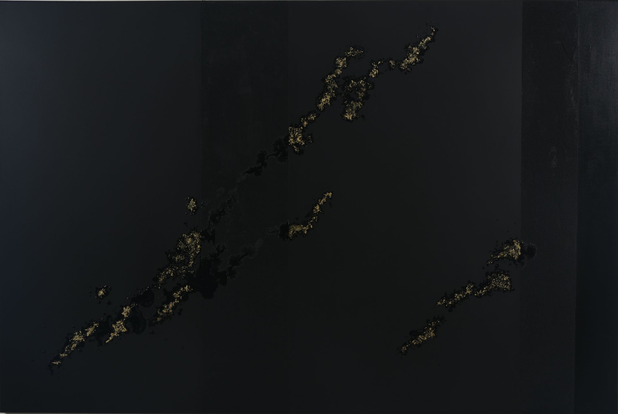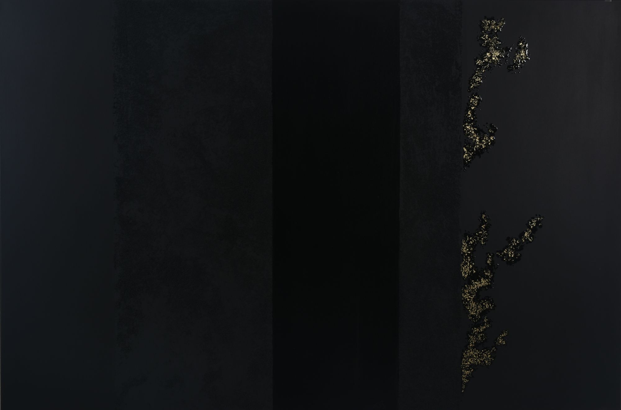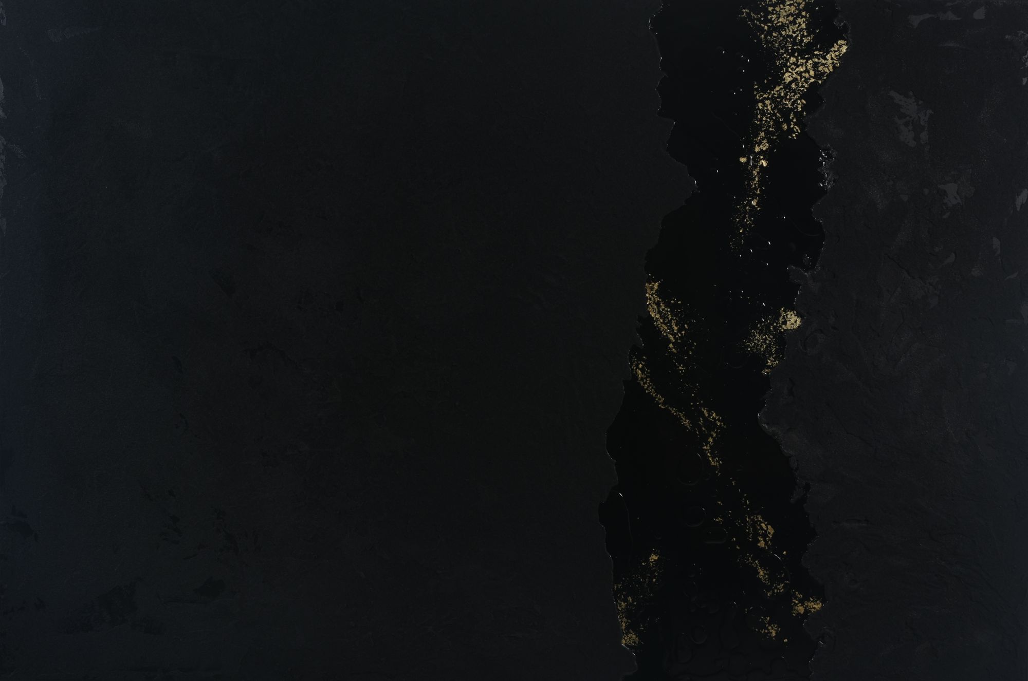 A la suite de la série « Authentique » se trouvent quatre tableaux réalisés pour l’occasion mais dans la continuité d’un projet commencé il y a quatre ans, une autre exposition intitulée « Le noir est une couleur ». Une longue série de tableaux grand format, mêlant différentes techniques, a vu le jour depuis que l’idée a germé dans l’esprit de FabB de momentanément laisser de côté la couleur et de ne travailler que le noir, réduit à des textures, des brillances, des mats. Impossible bien sûr de nier l’héritage de Pierre Soulages. Mais loin de toute copie, FabB crée son propre cheminement, fabrique ses propres textures et joint à la peinture acrylique de la résine, parfois du tissu, souvent de la feuille d’or. Les reliefs, minuscules rugosités ou crevasses plus tranchées, déclinent le noir sous toutes ses nuances, puis laissent la place à un effet de miroir qui tour à tour s’abîme sur lui-même et resplendit. Les poussières d’or s’étirent, se cachent, s’enlisent ou s’envolent, tandis que les textures ponctuent leurs élans. Approchez-vous : la lumière se déplace elle aussi et fait jouer ombres et reflets. Le tableau s’anime, il devient vivant.