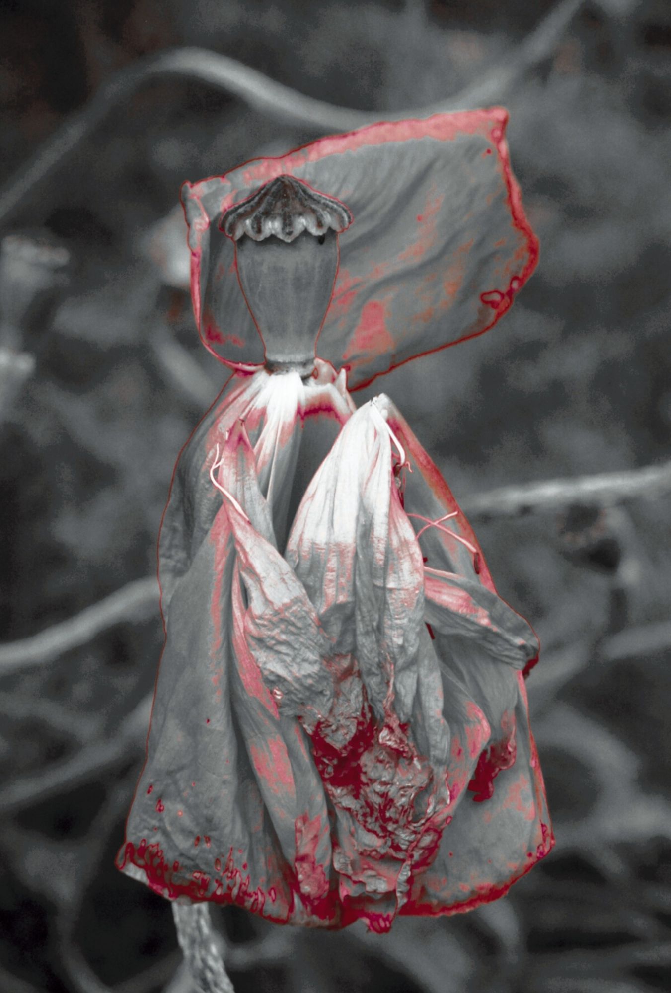 Gilbert Delrieu est un photographe de l’imaginaire. A l’instar d’un héros de mythe, simple mortel ayant surpris au détour d’une clairière nymphes ou farfadets inconscients de sa présence, il a saisi sur le vif les marionnettes qui s’égayaient dans son jardin, après la pluie. Suite à une grosse averse, raconte-t-il, il aurait découvert ses coquelicots tout juste éclos en piteux état, malmenés par le mauvais temps et tristement dépourvus de leur fière corolle. Toutefois, il ne lui aura fallu qu’un coup d’œil pour découvrir, sous cette façade désolée, le monde merveilleux qui prenait vie. Juchés sur leur tige, les pistils devinrent subitement de petites têtes couronnées, vêtues de robes, capes et autres habits de fête, apparaissant au gré des avaries du vent les uns mélancoliques, les autres enjoués, d’autres encore pris dans un jeu de séduction. Chacun affiche sa personnalité, chacun raconte son histoire, pour peu que l’on écoute son imagination.
