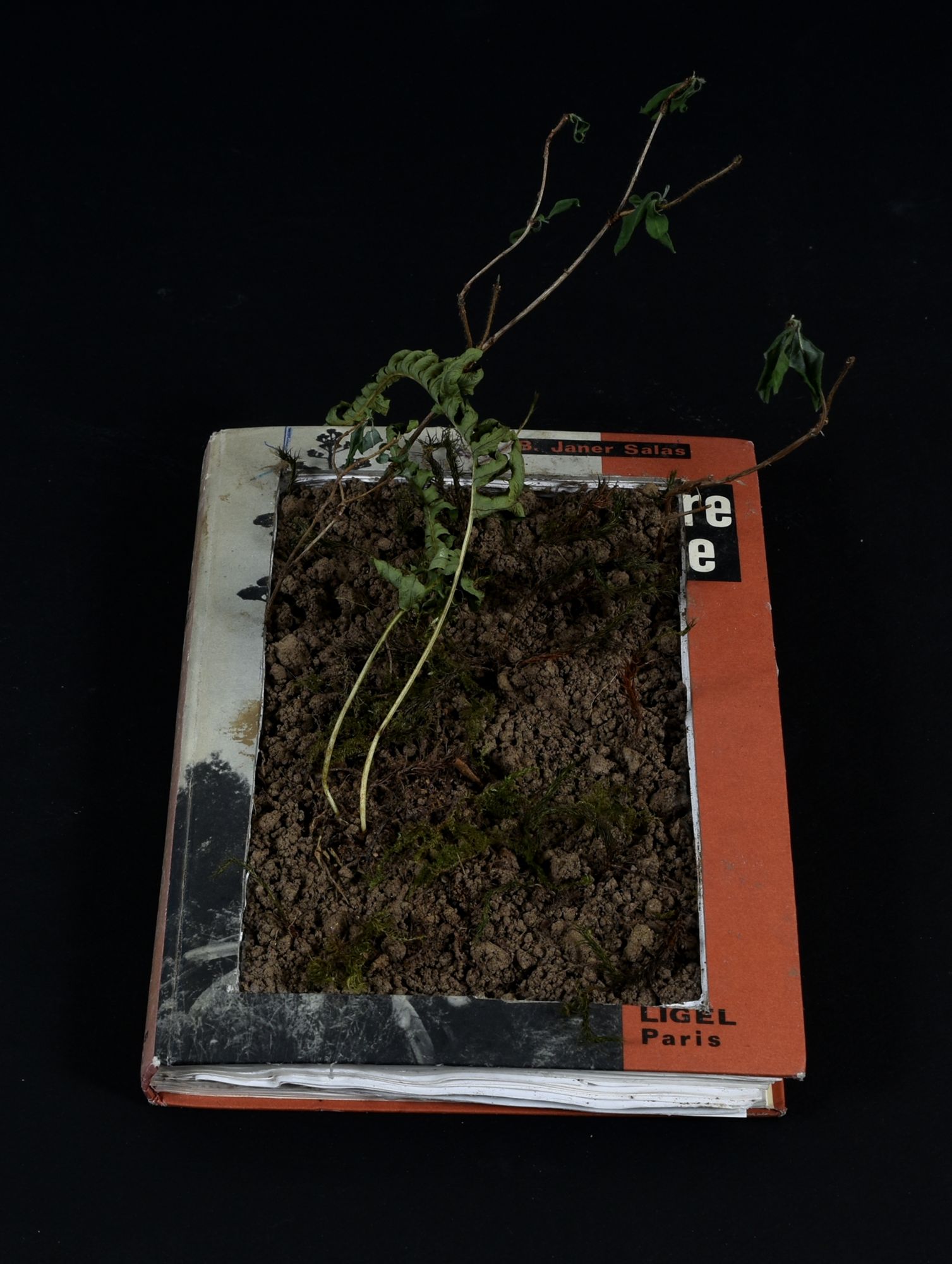 Ma production se présente sous la forme d’un livre fermé, creusé, dans lequel une plante a trouvé place. Pour autant un livre n’a pas pour vocation de rester fermé sur une étagère de bibliothèque.