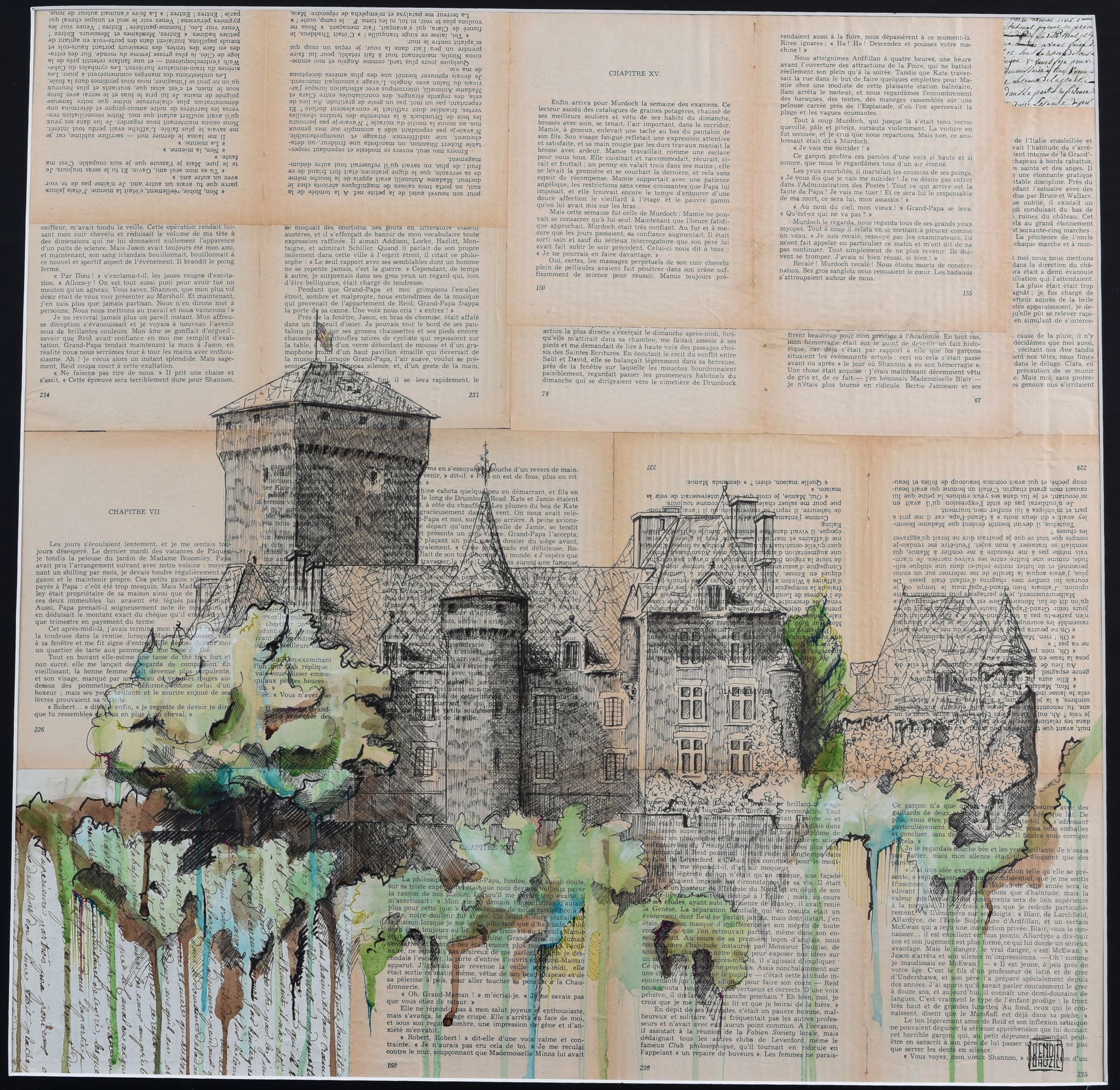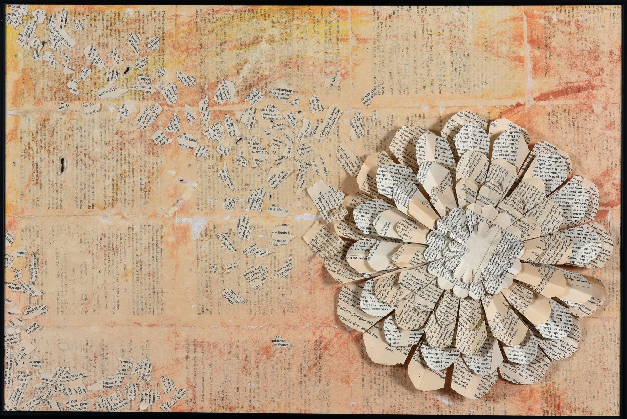 Ce travail est réalisé à partir de feuilles issues d'un roman oublié, abandonné. Le traitement plastique de ce fond accentue le côté ancien, l'idée de vécu. Sur celui-ci, j'ai réalisé une fleur dans un traitement différent, l'idée d'une vie passée est moins présente bien que le papier soit un peu jauni.