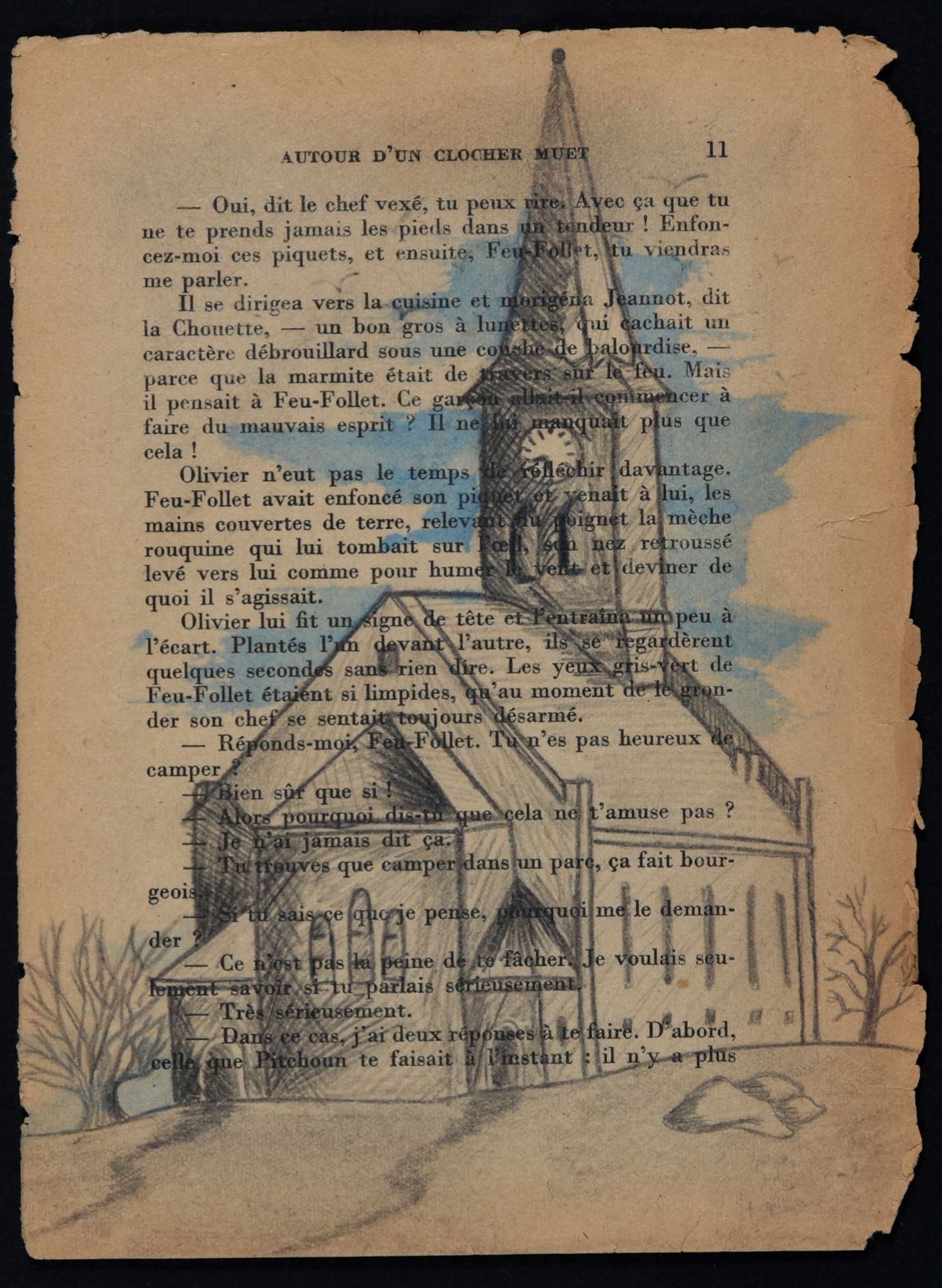 Mon travail est une illustration du thème présent dans le livre que j'ai choisi d'investir. La châsse de saint-Agapit est un ouvrage traitant du scoutisme et du christianisme. C'est alors tout naturellement que j'ai décidé de représenter une église de campagne.