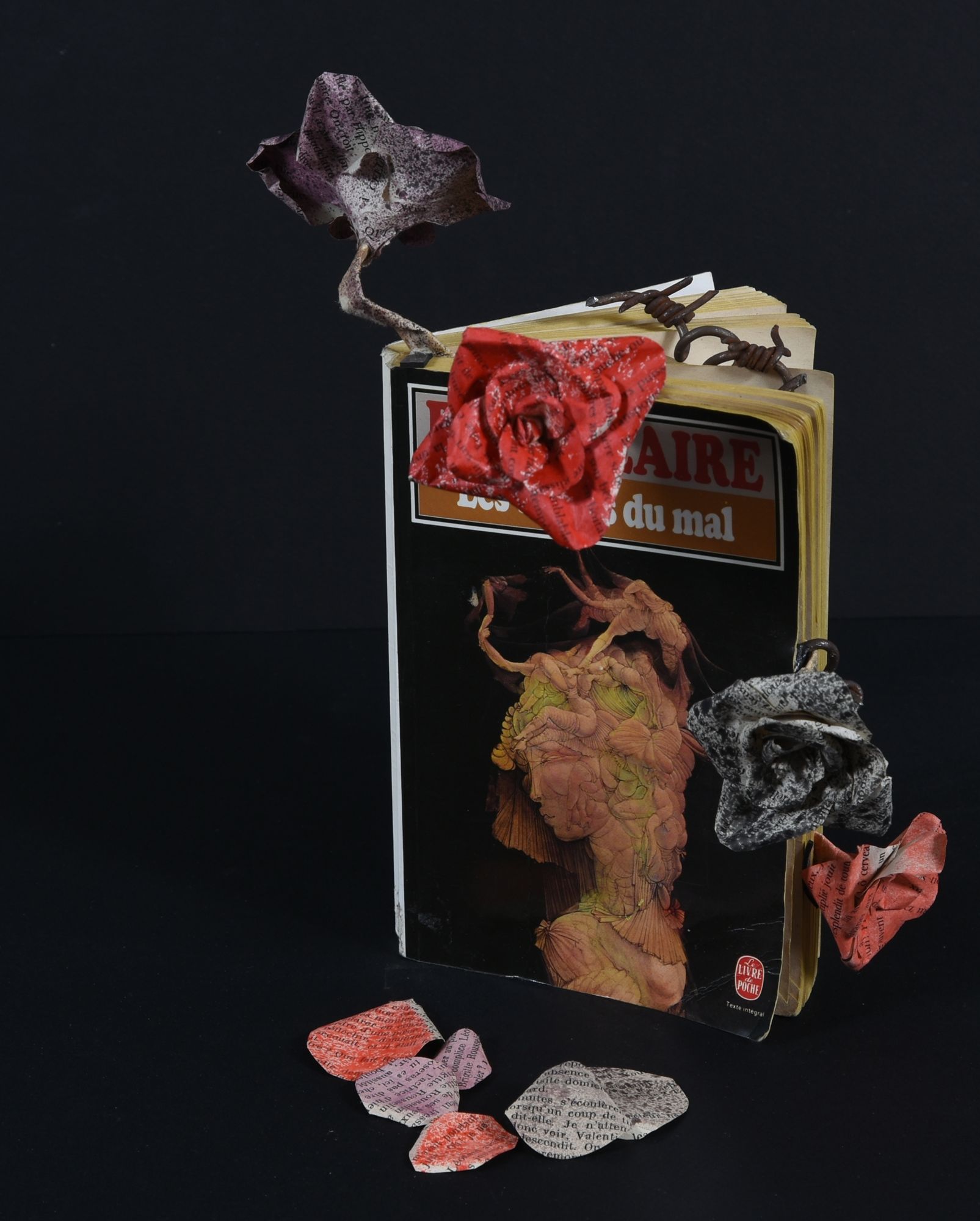 Fleurs rouges et roses souffrant de l’étreinte du barbelé qui jaillit du cœur du livre, côtoient les fleurs les plus ténébreuses, déjà plongées dans une longue et lente agonie. Pétales parsemés au pied de l’ouvrage, le sommeil éternel est proche.