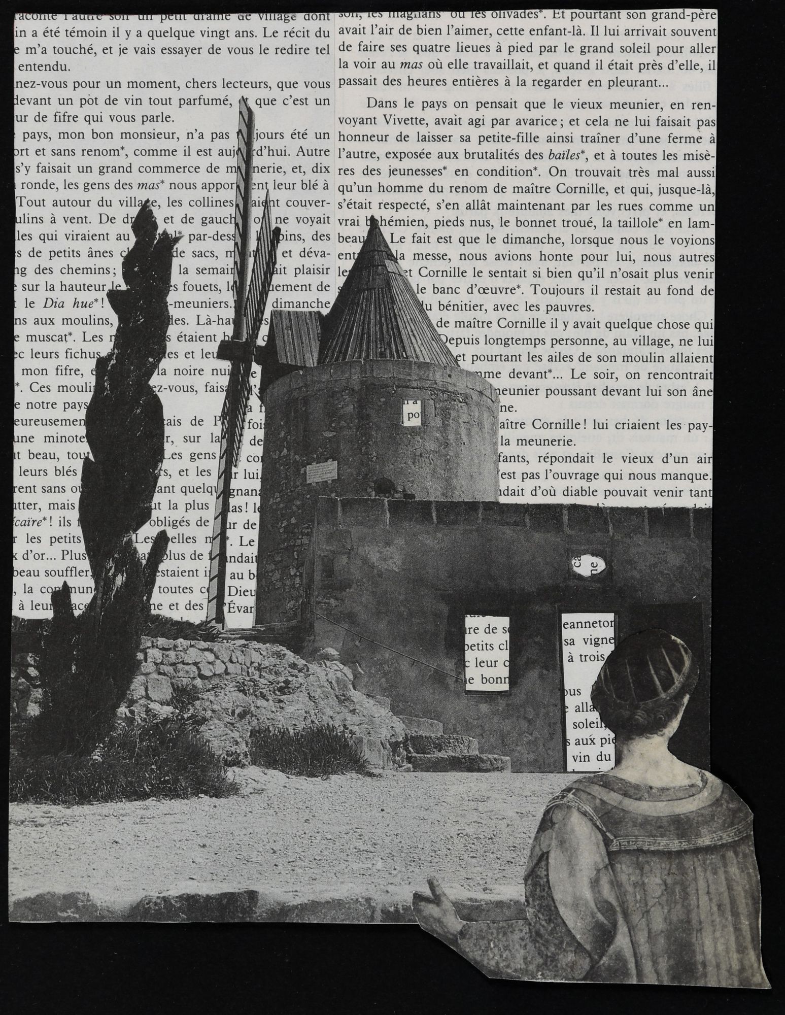 C’est sur les mots de Daudet que l’image trouve sa place, sur ce ciel lettré. C’est dans ces lignes que se cachent le meunier et son secret. Cette jeune fille apporterait-elle avec elle les gens du village, et l’espoir dans les yeux du vieux minotier ?