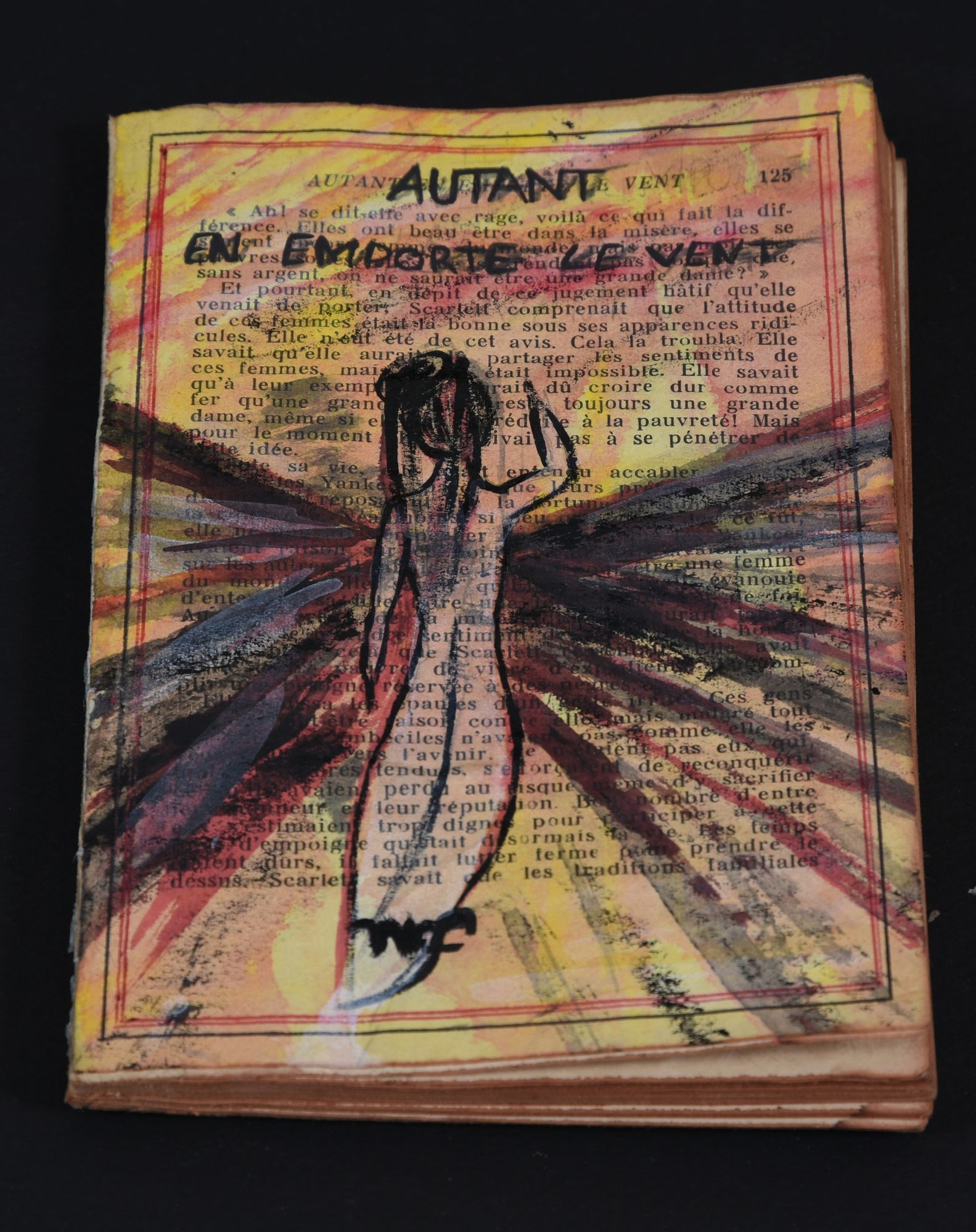 Les pages de l’ouvrage qui en sont extraites, sont usées, abimées, et détentrices d’une histoire, d’un vécu.