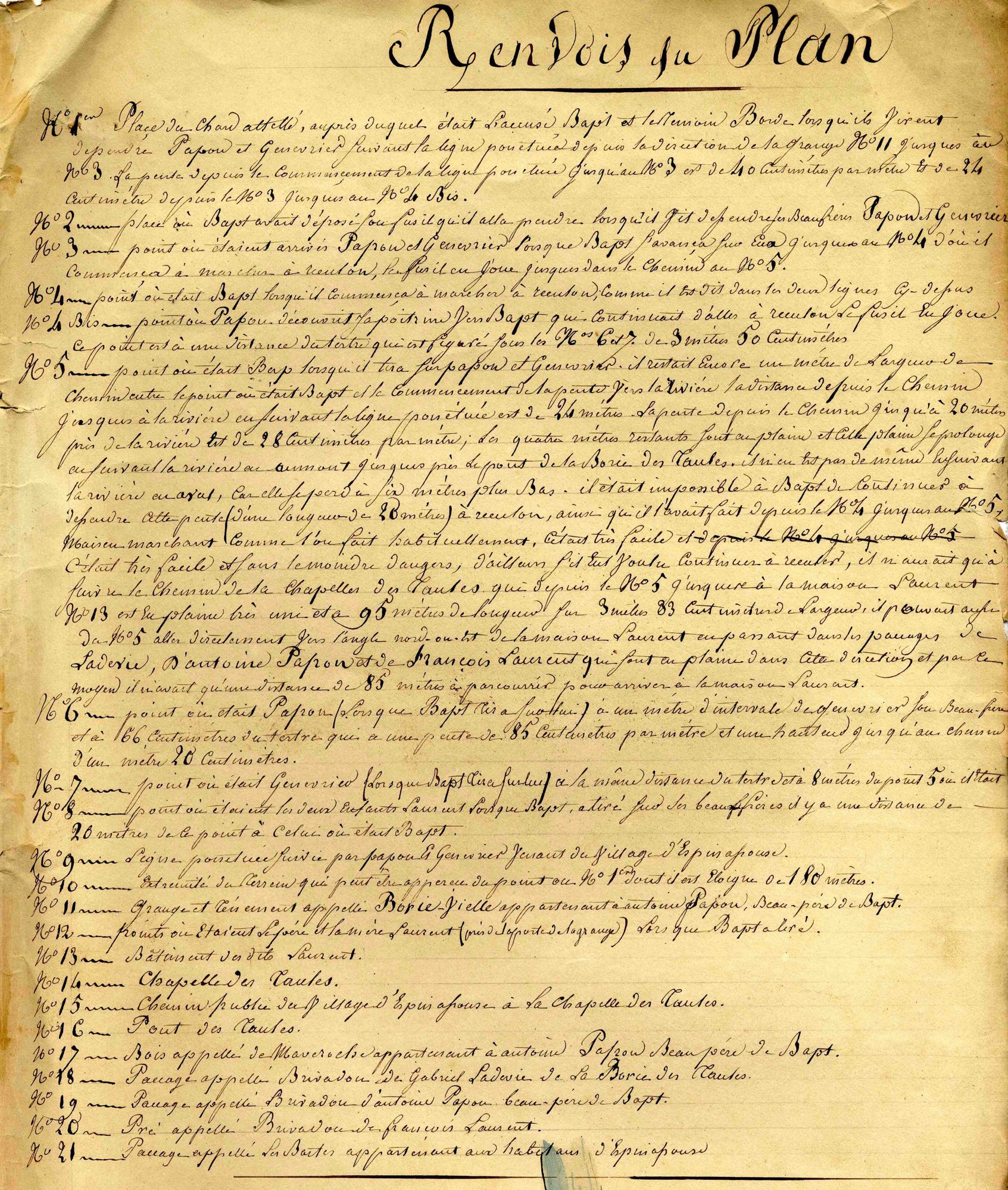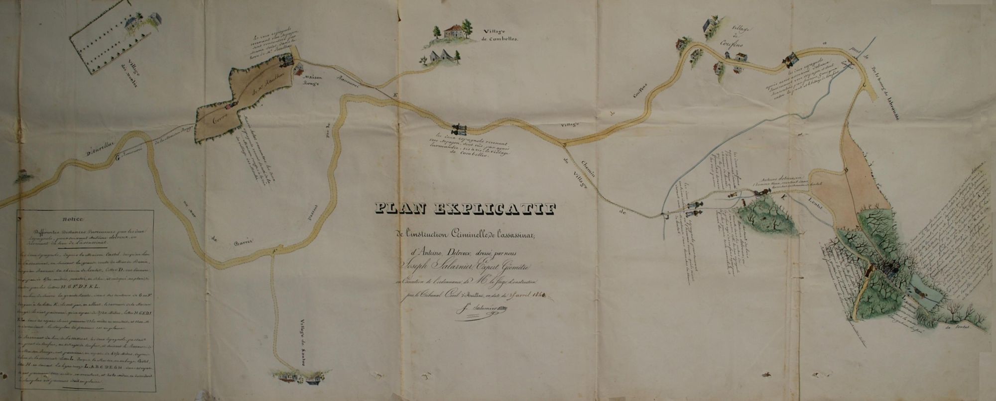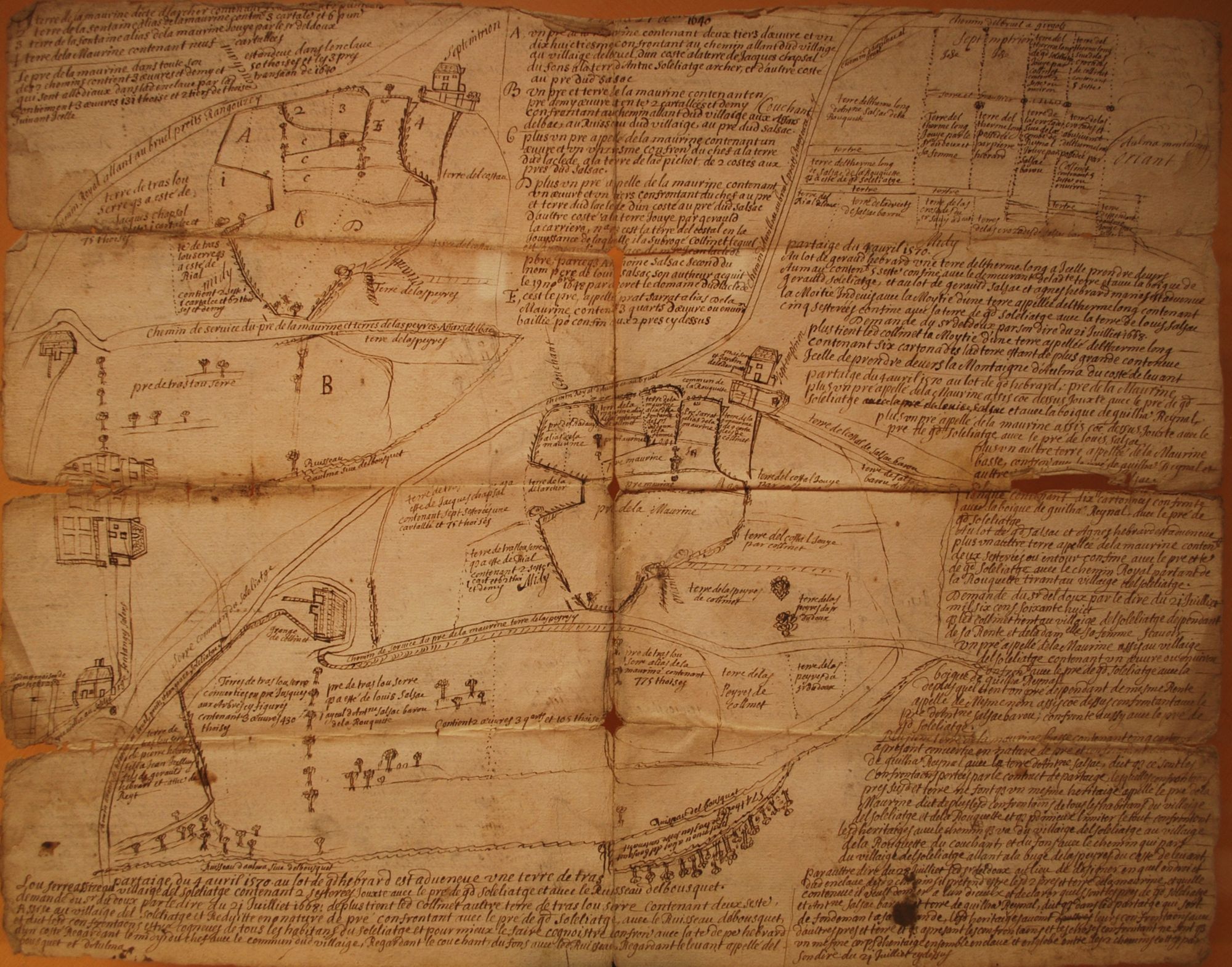 On ne sait quelle affaire judiciaire conduisit à lever ce plan, qui détaille les propriétaires, (laïques, ecclésiastiques ou « habitants », c’est-à-dire les actuels biens de section), ainsi que la nature de chaque parcelle (terre, buge, repastils, pré, bois, broussier, hort à chanvre, jardin, bois chatanial). Les conventions indiquent à la fois les parcelles de chaque propriétaire (trait) et la nature de culture de chaque parcelle ou fraction de parcelle (couleur). Le cadastre napoléonien commencera par des plans par nature de culture, puis passa aux parcelles ; on aurait pu imaginer un système mixte, permettant de voir comme ici d’un seul coup d’œil les deux types d’informations.