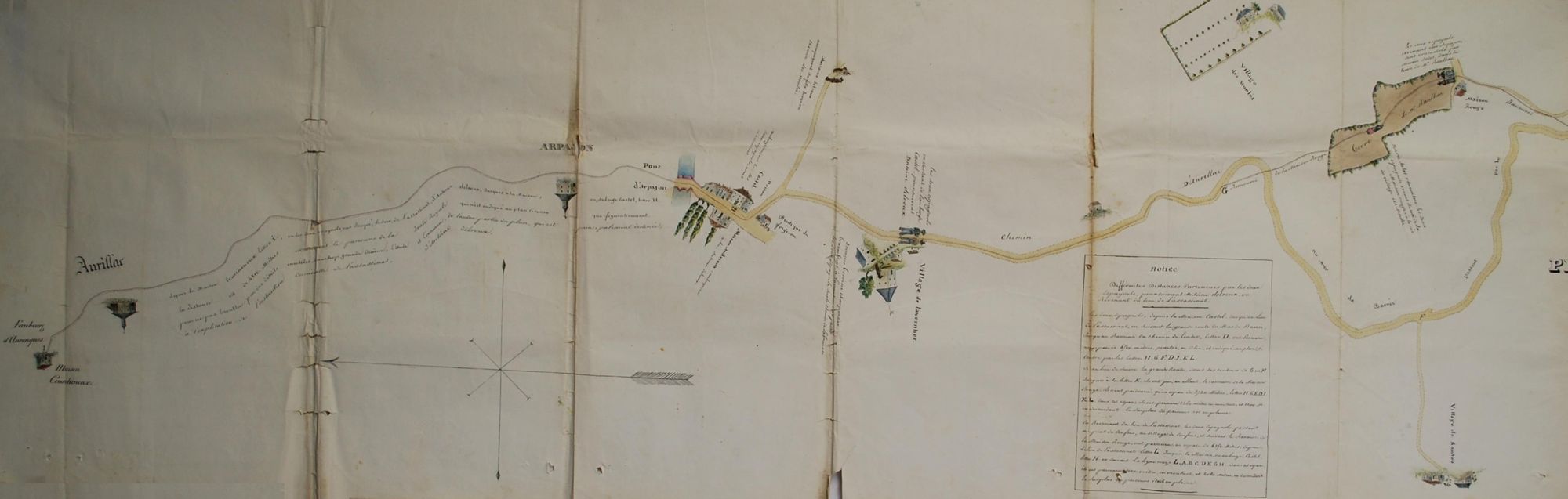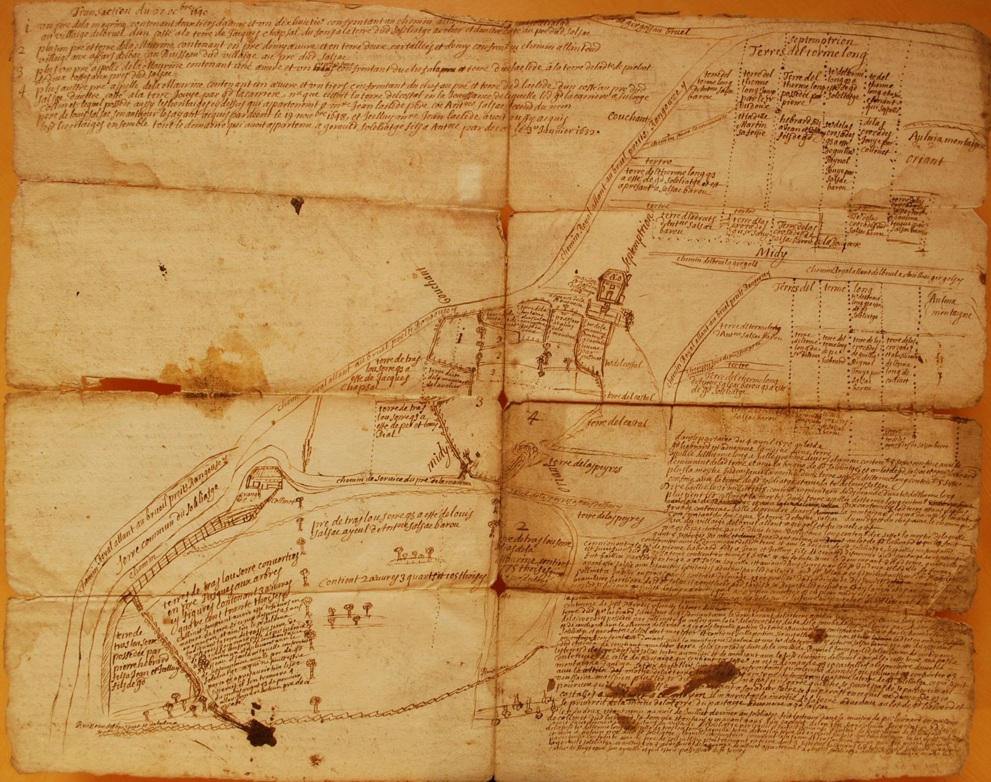 Ce plan double (recto verso), le plus ancien de l’exposition, provient du chartrier d’Anjony, fonds d’archives exceptionnel, notamment pour la connaissance des cantons de Saint-Cernin, de Salers, de Jussac et d’Aurillac IV.