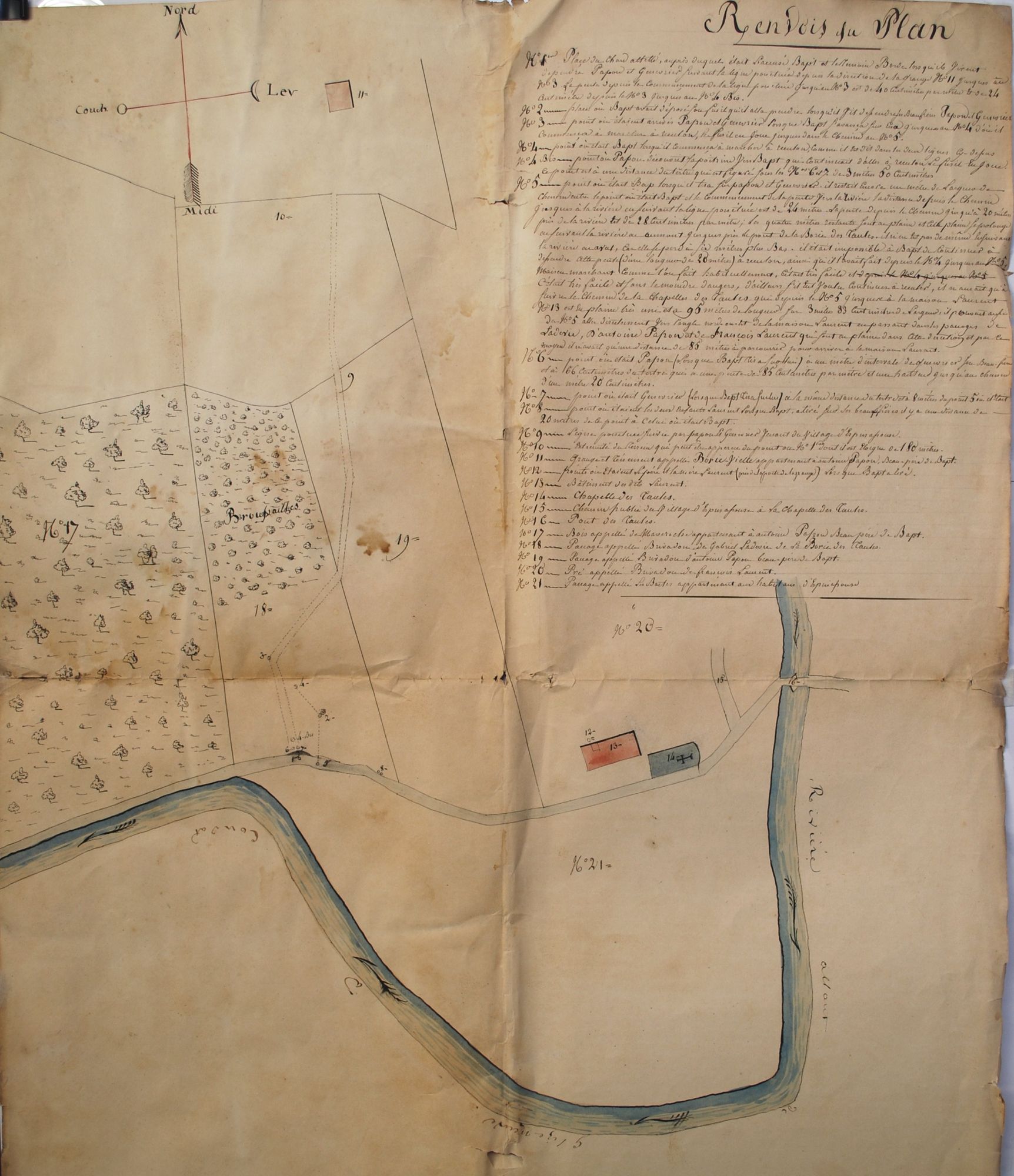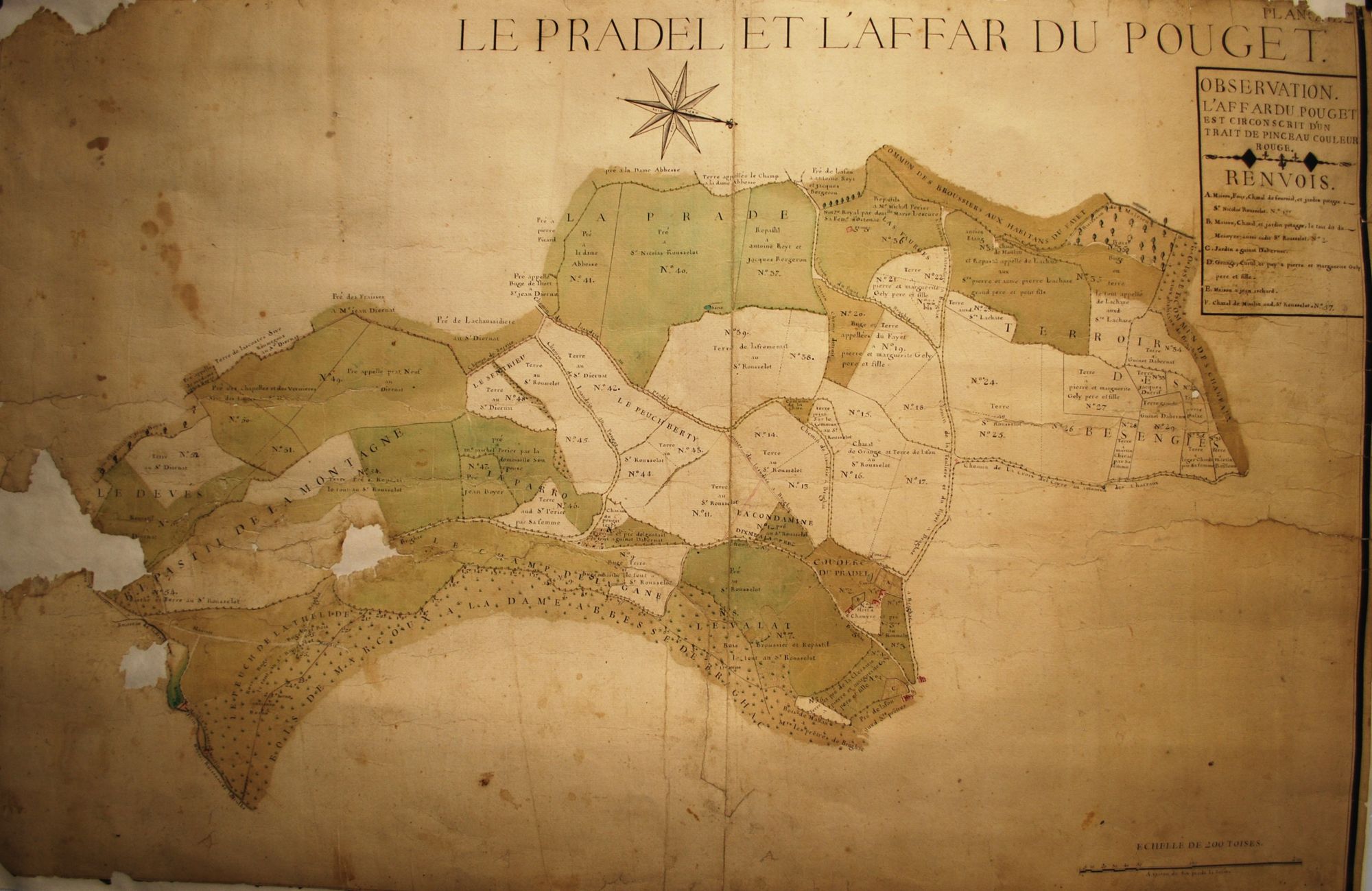 Isolé dans les dossiers d’affaires communales versés par la préfecture, qui ne commencent normalement qu’en 1800, ce splendide plan du village du Pradel et de l’affar du Pouget à Brageac remonte aux dernières années de l’Ancien Régime. Postérieur à 1760 (car il mentionne le notaire Michel Périer, dont les lettres de provisions d’office datent de cette année-là), il est forcément antérieur à 1790, année où « la dame abbesse » (de l’abbaye bénédictine) et « MM. les prêtres » (c’est-à-dire les prêtres filleuls) de Brageac virent leurs biens confisqués et vendus nationalement : il date donc du 3etiers du xviiie siècle. Plan cadastral avant la lettre, il montre le savoir-faire des arpenteurs d’Ancien Régime, sur lequel s’appuya sous l’Empire l’administration du cadastre ; au reste, comme plus tard sur le cadastre « napoléonien », les maisons sont colorées en rose.