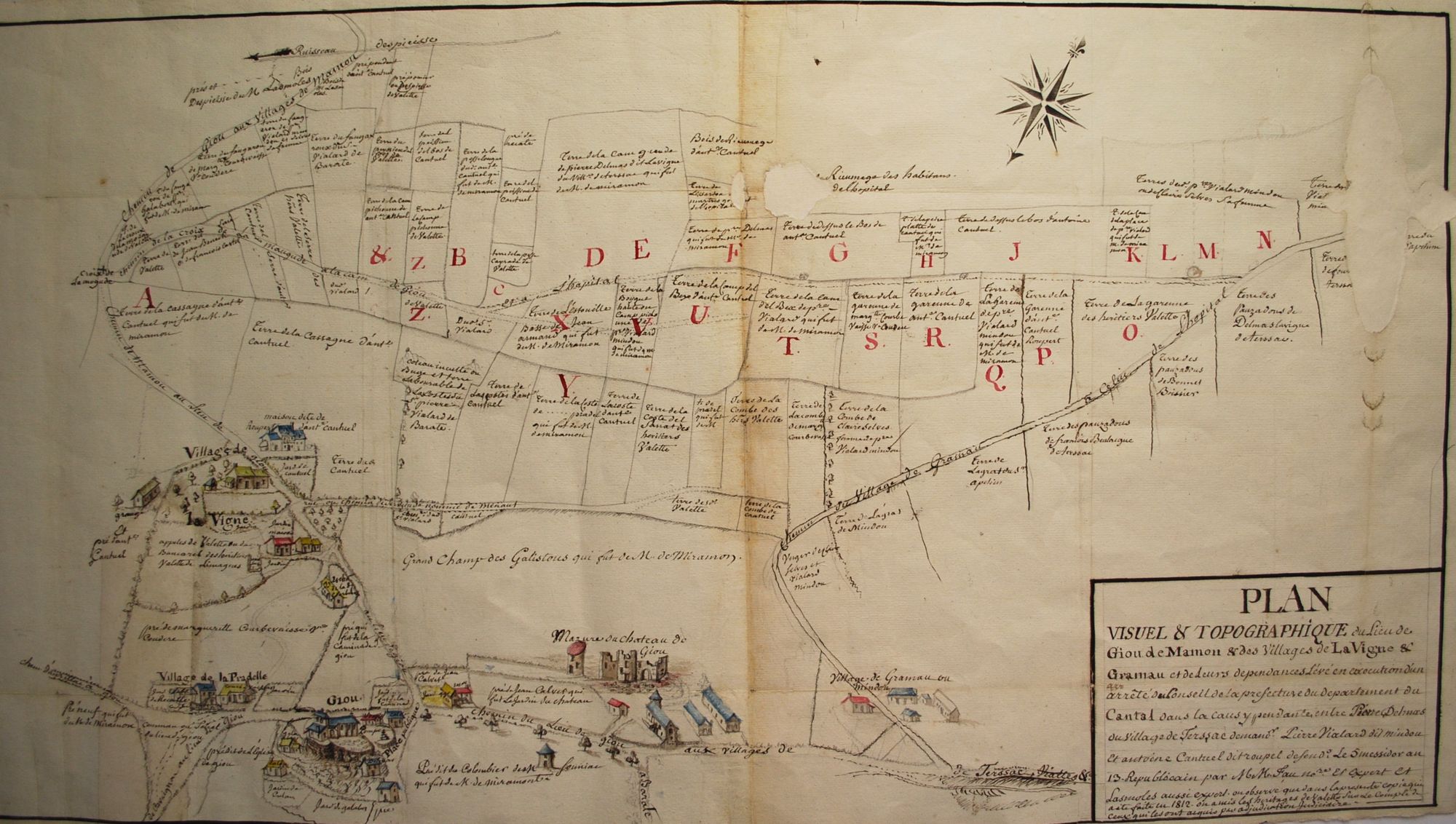 Jeanne Chassang, veuve de Jean Andrieu laboureur au Fayet (commune de Saint-Flour) et Jacques Fay (ou Fahy), négociant à Saint-Flour, s’opposent devant le bailliage de Saint-Flour. Le négociant revendique des terres détenues par la veuve. Il faut y voir clair. Un plan est donc établi par les experts de chacune des parties : Guillaume Vidalenc, notaire et expert féodiste (c’est-à-dire spécialiste des fiefs) demeurant à Cézens ; Jean-François Pachins, notaire et expert féodiste à Mur-de-Barrez. Les deux experts examinent aussi les « reconnaissances » féodales faites par les parties (ou leurs prédecesseurs) à leurs seigneurs en 1622, 1626, 1753 et 1755. Ils en concluent que c’est la veuve qui a raison. Cela nous vaut un plan « pré-cadastral » de ces parcelles, soigneusement dénommées et accolées au ruisseau de la Graveyre.