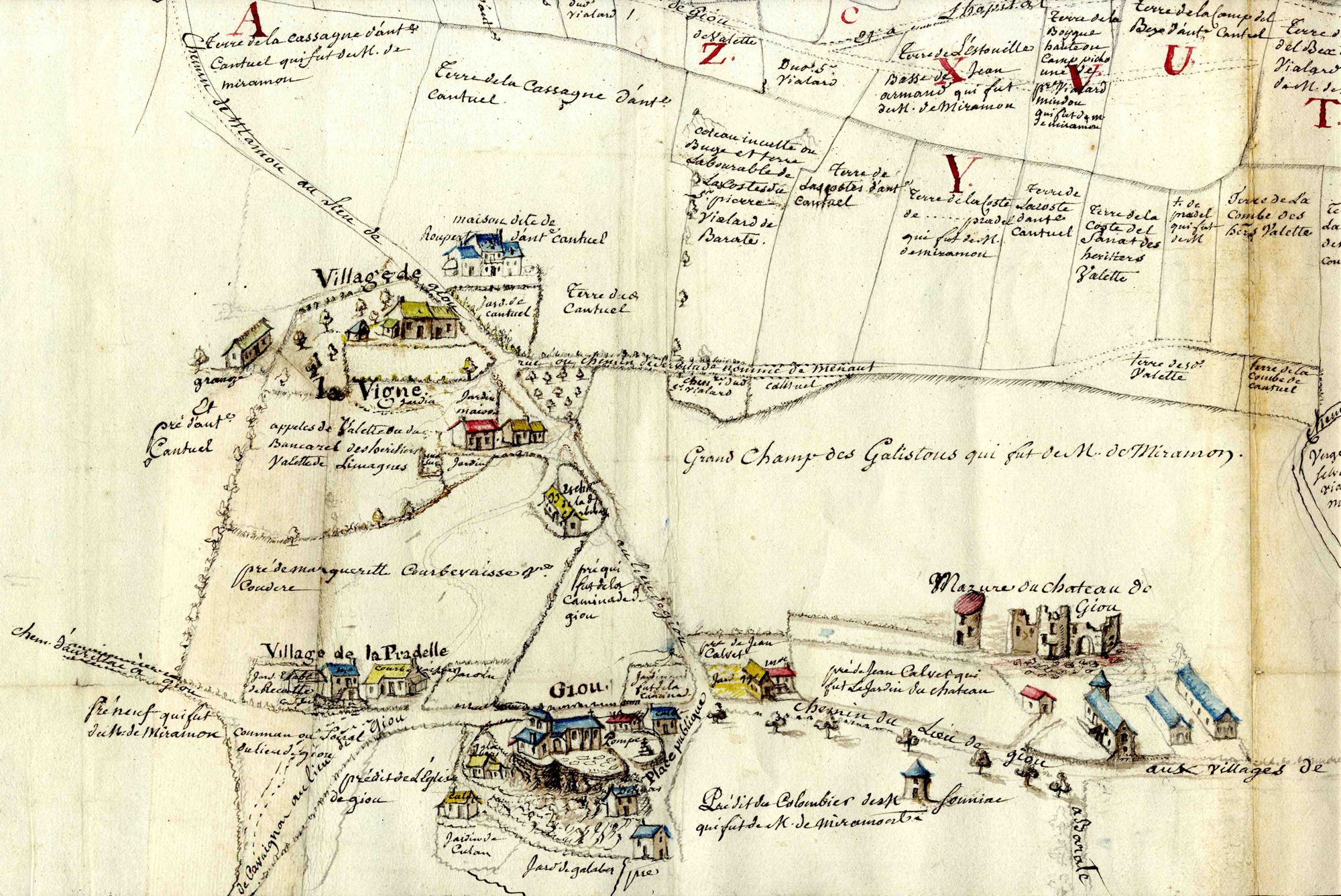 Levé an l’an XIII par le notaire Fau et l’expert Lasmoles, ce plan fut copié en 1812, non sans que le nom des nouveaux propriétaires ne remplace ceux de 1805. C’est un mélange de plan cadastral, pour les parcelles, et de vue cavalière, pour les maisons. Pour ces dernières, dont la physionomie est bien détaillée, on peut distinguer les couvertures en chaume (jaunes), en tuiles (rouges) et en lauzes (bleues). L’église a déjà sa physionomie caractéristique ; le château de Giou est en ruines. Il est précisé, pour bien des parcelles et pour le colombier, outre le nom du propriétaire, le fait qu’elles aient été acquises par lui comme bien national confisqué à la famille de Miramon, qui avait en effet beaucoup de terres à Giou sous l’Ancien Régime. À la faveur du procès entre Pierre Delmas, d’une part, Pierre Vialard dit Mindou et Antoine Cantuel dit Roupel, jugé par le Conseil de préfecture, on découvre une représentation unique de Giou sous le Premier Empire.