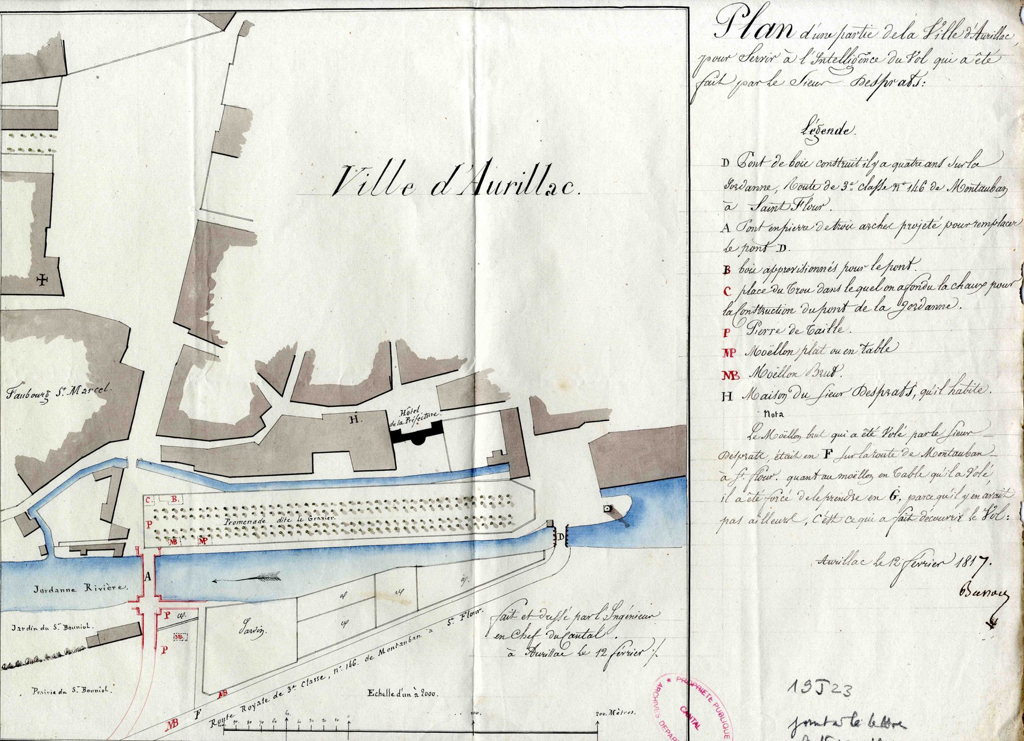 Ce plan adressé le 16 janvier 1818 à Jean-Charles Vacher de Tournemine, président du tribunal de Mauriac, a été levé le 12 février 1817 pour servir à l’intelligence du vol de moellon qui a été commis par le sieur Desprats, domicilié rue du Rieu, dans la même maison que son neveu, ingénieur de l’arrondissement d’Aurillac. En 1817, le futur pont Bourbon est en chantier. Sur la rive gauche de la Jordanne (aujourd’hui le début de l’avenue Aristide Briand) sont stockés pierre de taille et moellon brut ; la seule maison de cette rive, construite à la fin XVIIIe siècle, existe toujours. Sur la rive droite, au bout du Gravier, sont stockés du bois, de la pierre de taille, du moellon brut et du moellon plat ou en table ; on a fondu de la chaux dans un trou pour la construction du pont. Ce pont Bourbon va doubler avantageusement le pont rouge reconstruit en bois en 1813. Le vol de l’oncle est aggravé de la concussion du neveu ; l’ingénieur en chef du Cantal, mis à la retraite d’office pour avoir dénoncé cette corruption, expose la chose au président du tribunal de Mauriac et député du Cantal, en désespoir de cause…