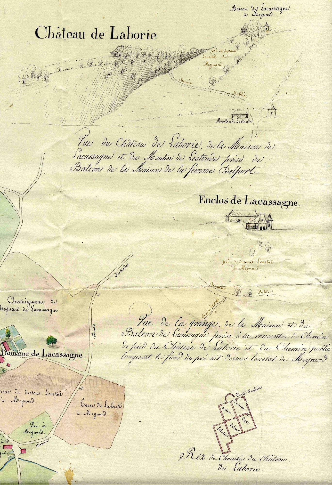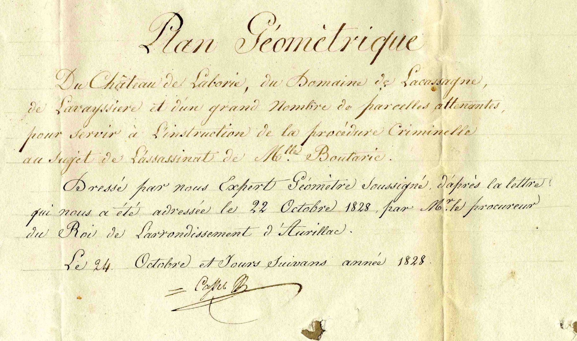 Dans la matinée du 24 juin 1827 des domestiques découvrent le corps, presque décapité, de Françoise de Boutaric qui réside, avec son frère Jean-Benoît, au château de Laborie aux abords immédiats de Maurs en face du hameau de Lacassagne ; ces lieux sont représentés ici avec élégance par le dessin de Casses, l’expert. La châtelaine, en charge de la gestion du domaine, était connue pour une âpreté certaine dans les affaires et un non moins évident amour des louis et autres napoléons. L'assassin a fracturé les armoires, dérobant d'importantes sommes, jamais retrouvées, et dont on dit qu'elles demeurent enfouies aux abords du ruisseau de Lestrade. Vu l'importance sociale de la victime, les efforts de la gendarmerie ne se limitent pas à la mise en mouvement de la brigade de Maurs mais de l'ensemble de celles du sud du Cantal. Il faut presque trois mois pour que la maréchaussée, après s'être fourvoyée sur les pistes les plus diverses – des scieurs de long de l'Aveyron, un journalier éconduit et même un garde des bois du domaine qui, de fait, en organisait le pillage – s'intéresse à Gérard Meynard résidant à quelques dizaines de mètres du château ! Le juge Verniols met rapidement en évidence l'antagonisme de classe les opposant mais là encore, en dehors d'évidentes présomptions, aucune preuve réelle ne se fait jour. C'est au terme d'un long procès du 18 au 23 novembre 1828, où interviennent deux des plus talentueux avocats d'assises du département, que Gérard Meynard est condamné à la peine capitale. Il est exécuté "à une heure de relevée" sur la place d'Armes sanfloraine le 31 janvier 1829.