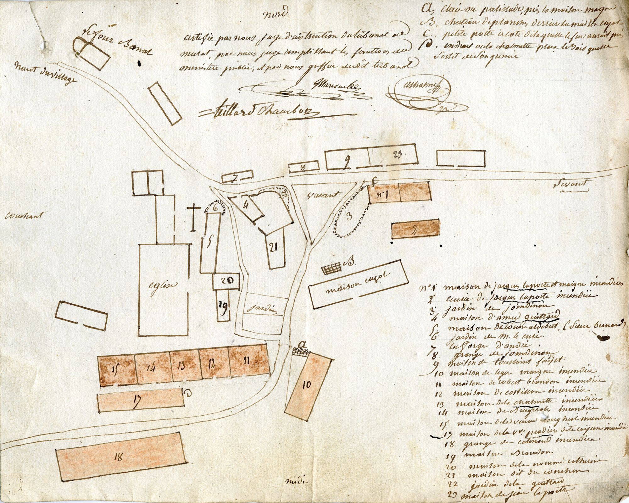 Les maisons coloriées en rouge feu, sur le plan, sont celles qui furent incendiées. Moins soigné mais plus détaillé qu’un plan cadastral, ce document montre les palissades, tas de bois, et autres jardinets.