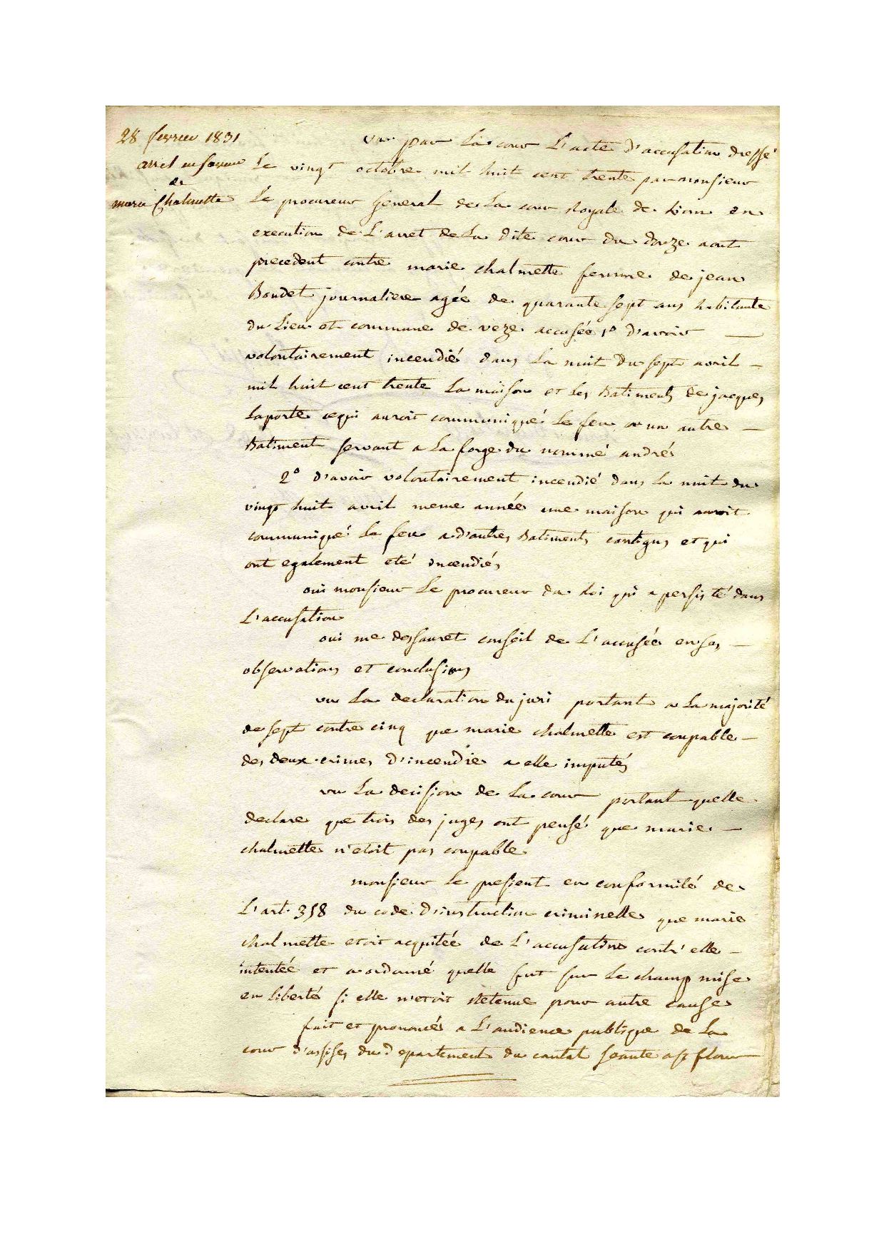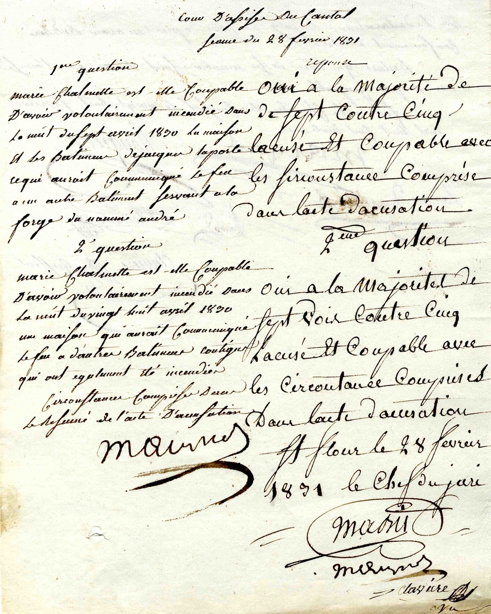Dans les deux nuits du 7 au 8 et du 28 au 29 avril 1830, deux incendies éclatent au bourg de Vèze, à chaque fois vers les 11 h du soir. Le premier, dans la nuit du jeudi saint, consume deux maisons ; le second, huit bâtiments, dont la demeure de l'accusée, et cause la mort de deux femmes. Tout avait commencé par le vol d'une paire de besaces et de quelques chemises au desservant de la paroisse. Parmi les suspects, une journalière du lieu, Marie Chalmette, se défend, accusant, à son tour, les membres de la famille Laporte, singulièrement le gendre Chastang. Celui-ci, exaspéré de ces accusations, affirme qu'il va demander l'aide, non des gendarmes d'Allanche, mais d'un devin. En réponse à cette affirmation, la maison Laporte et un bâtiment contigu brûlent. Alors qu'aux présomptions de vol s'ajoutent désormais celles d'incendie, Marie Chalmette s'évertue, aux dires de l'accusation, à les dévier sur une de ses tantes, habitante du lieu. Le second feu ne fait que renforcer les soupçons sur la journalière qui est déférée devant la justice. Il faut tout le talent de Me Dessauret et la bizarrerie de l’article 351 du Code d’instruction criminelle de 1808 pour la faire relaxer le 28 février 1831.