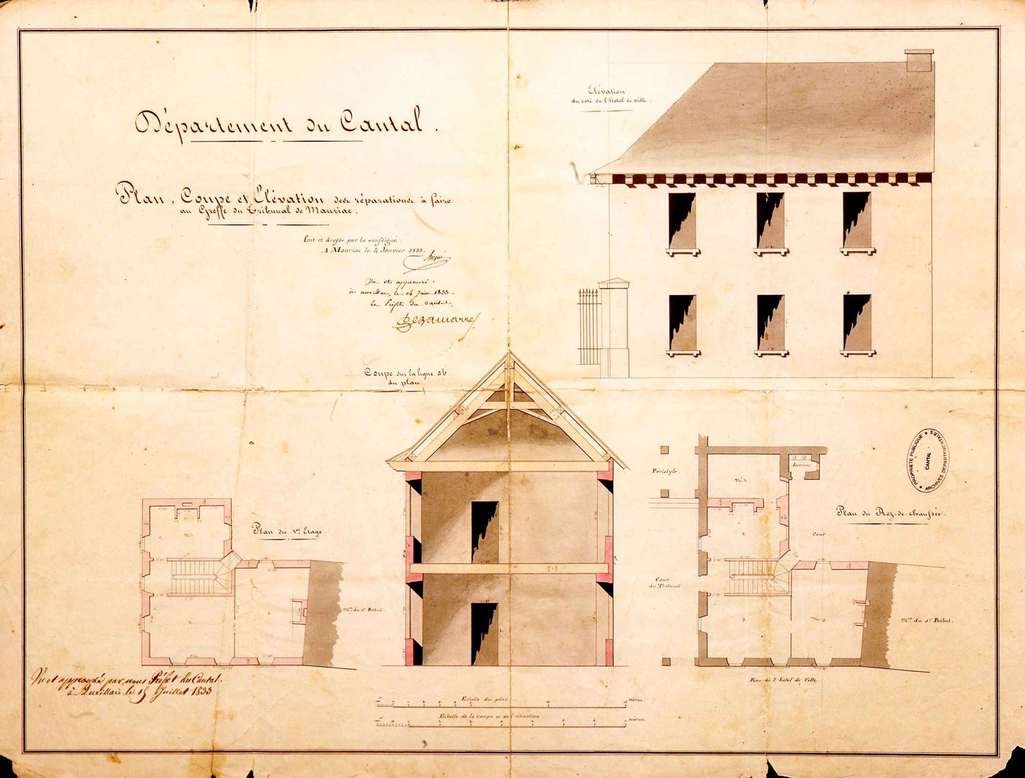 Plan, coupe et élévation des réparations à faire au greffe du tribunal de Mauriac (1833)