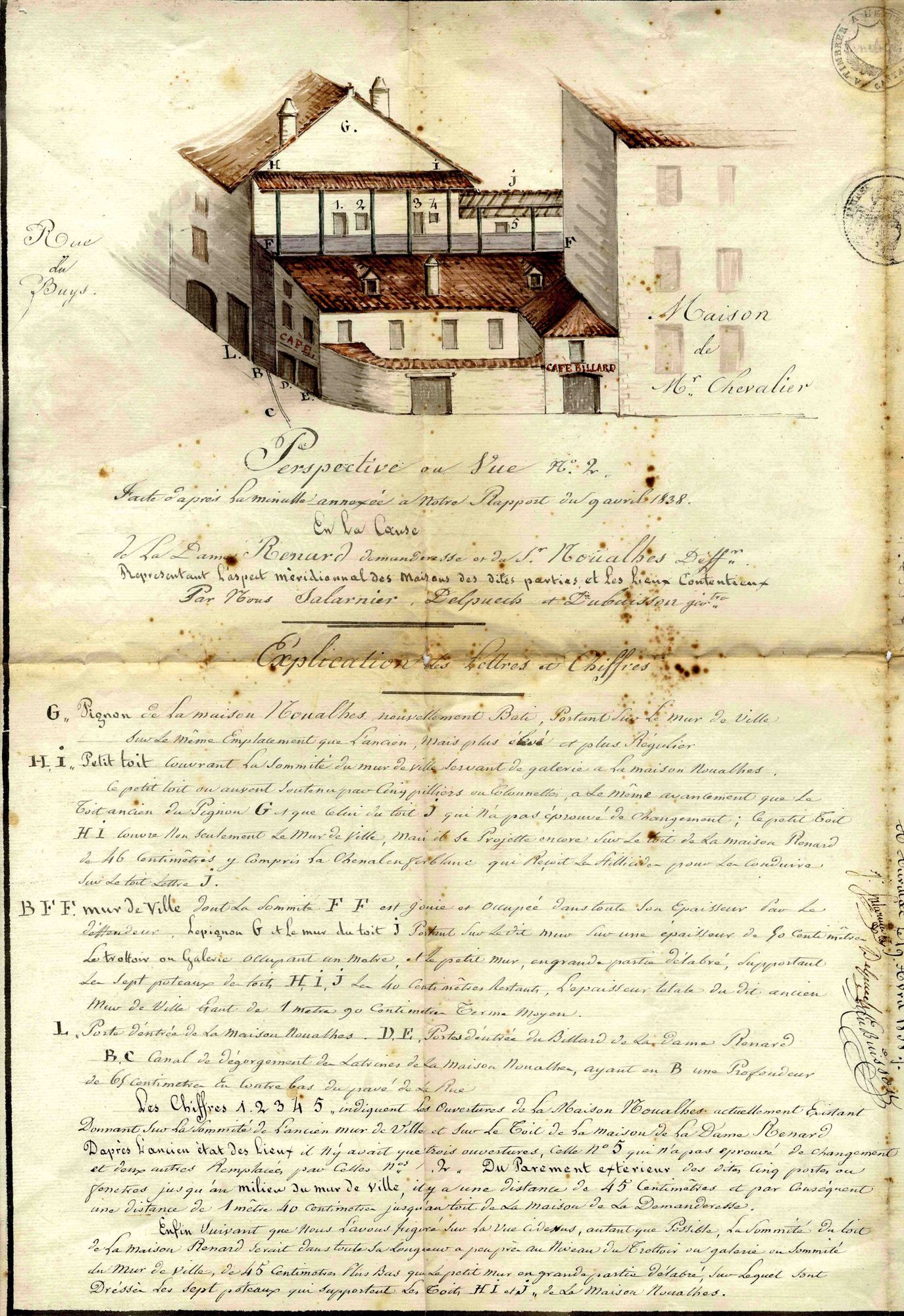 Même si le plan paraît boiteux, puisque la muraille, dirigée « du levant au couchant », semble orthogonale à la rue du Buis qui est quant à elle orientée est-ouest, cette affaire malodorante donne une vue de ce coin de rue. La maison Noualhes, boulangerie construite vers 1835, dresse toujours son pignon triangulaire au 4, rue du Buis. Le « Gerbert », après avoir été un temps le salon de thé le « De Noailles », perpétue la tradition du café-billard Renard. Quant à la maison Chevalier, c’est aujourd’hui un local de bureaux des assurances Axa.