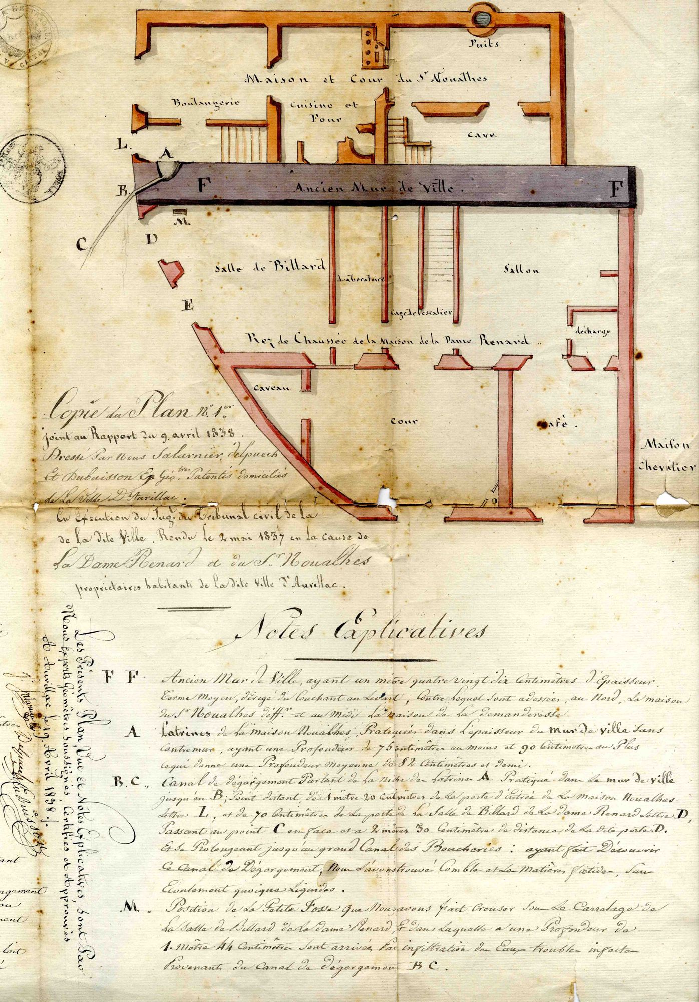 Jusqu’aux années 1880, point d’assainissement à Aurillac : les latrines « dégorgent » où elles peuvent. Le sieur Noalhes a appuyé sa maison rue du Buis, « nouvellement » construite, sur « l’ancien mur de ville » (1,80 mètres d’épaisseur). Il a creusé ses latrines dans ce mur, avec une profondeur moyenne de 82 cm. Puis les « matières fétides » devraient dégorger dans un canal situé dans la rue. Mais elles stagnent et s’infiltrent dans la « maison Renard », où elles « infectent » la salle dans laquelle ce cafetier a son billard. C’est ce qui, ajouté aux incursions des Noualhes qui utilisent le sommet du mur de ville comme balcon et suplombent ainsi la maison Renard, est l’objet du litige.