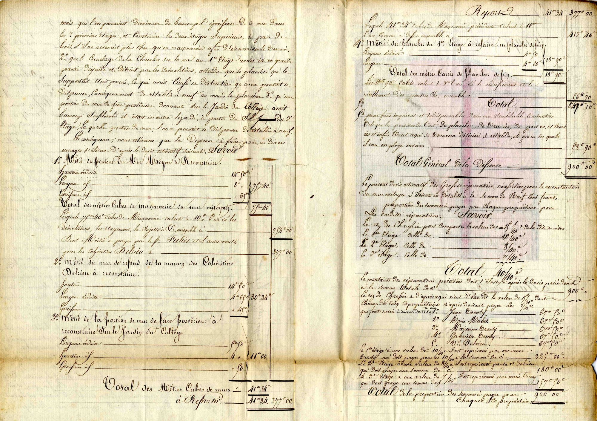 Gabriel Marie Lacaze, architecte voyer de la ville, dresse la coupe d’une maison réputée insalubre de la rue du Monastère à Aurillac, dont l’arrière donne sur le jardin du collège. En calculant « avec plus de précision les grosses réparations que peut entrainer pour l’intérieur de la maison Delrieu la démolition et reconstruction du mur mitoyen et déterminer la part contributive dans les dépenses à faire », Lacaze fait le plan du rez-de-chaussée et la coupe de la maison. La partie colorée en rose est celle qui doit être refaite.