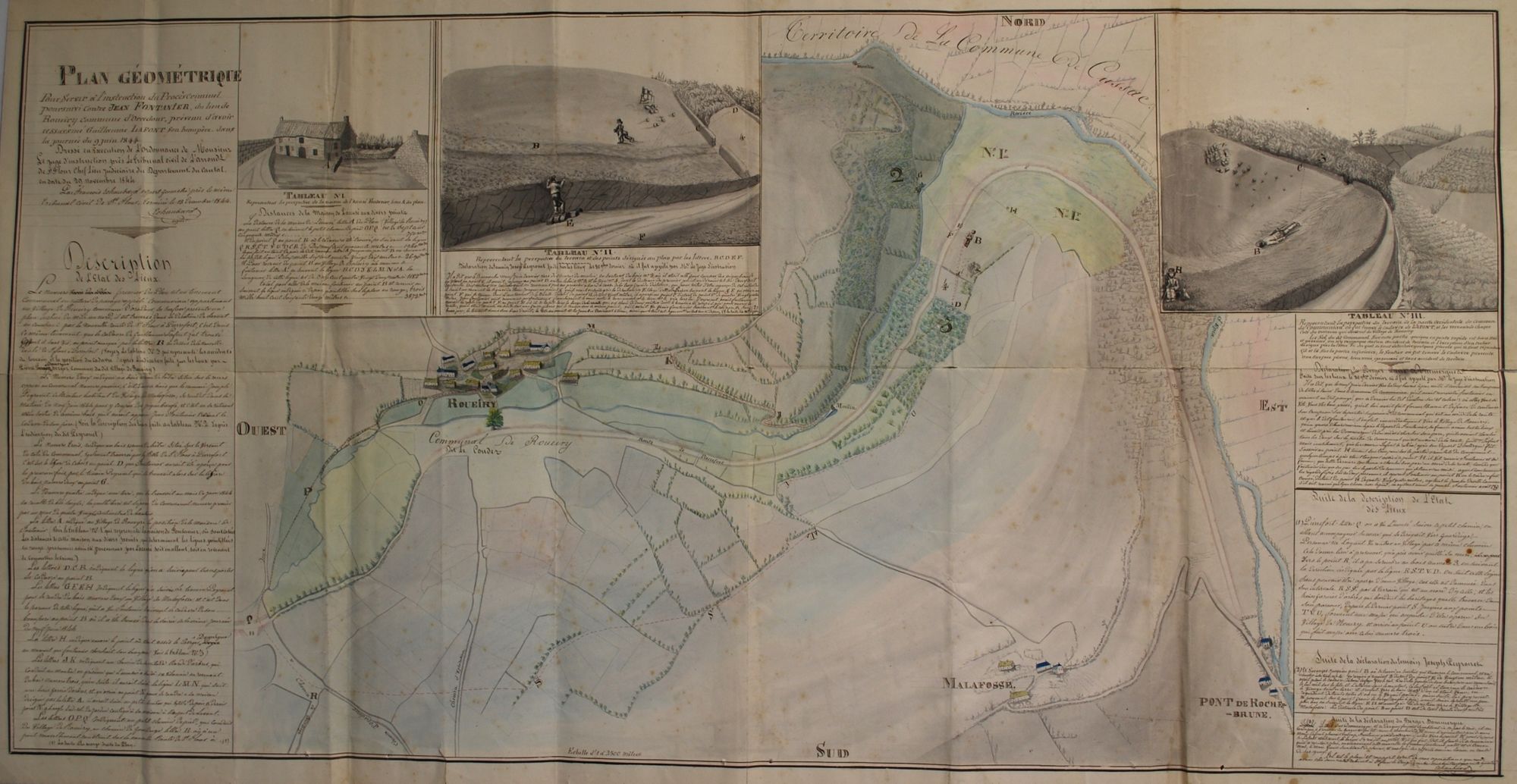 Le plan dressé par Calvinhac donne le détail des canaux, rigoles, aqueducs, rivière et autres rases, avec une grande précision qui dit d’elle-même la centralité de la question de l’eau dans l’agro-pastoralisme cantalien.
