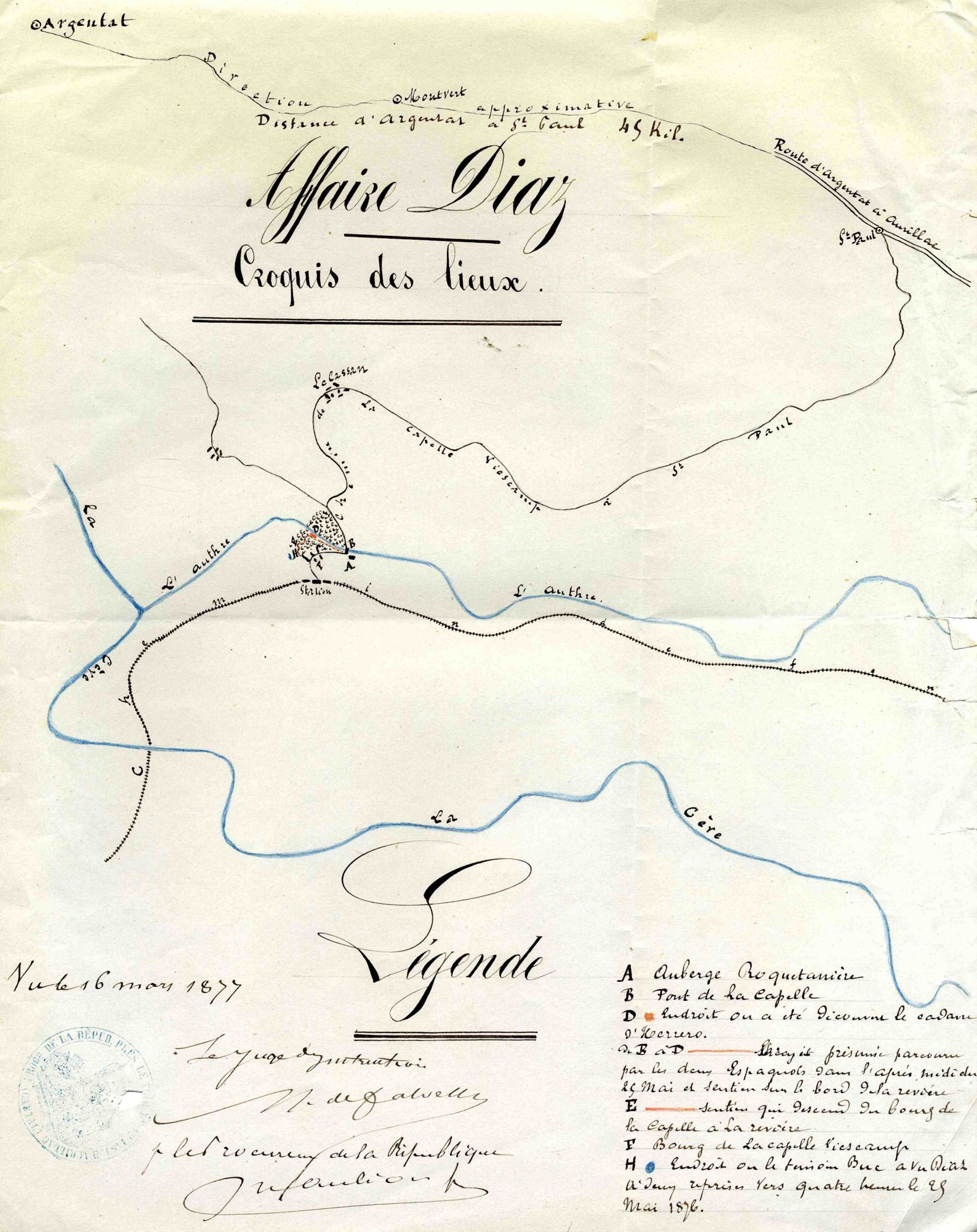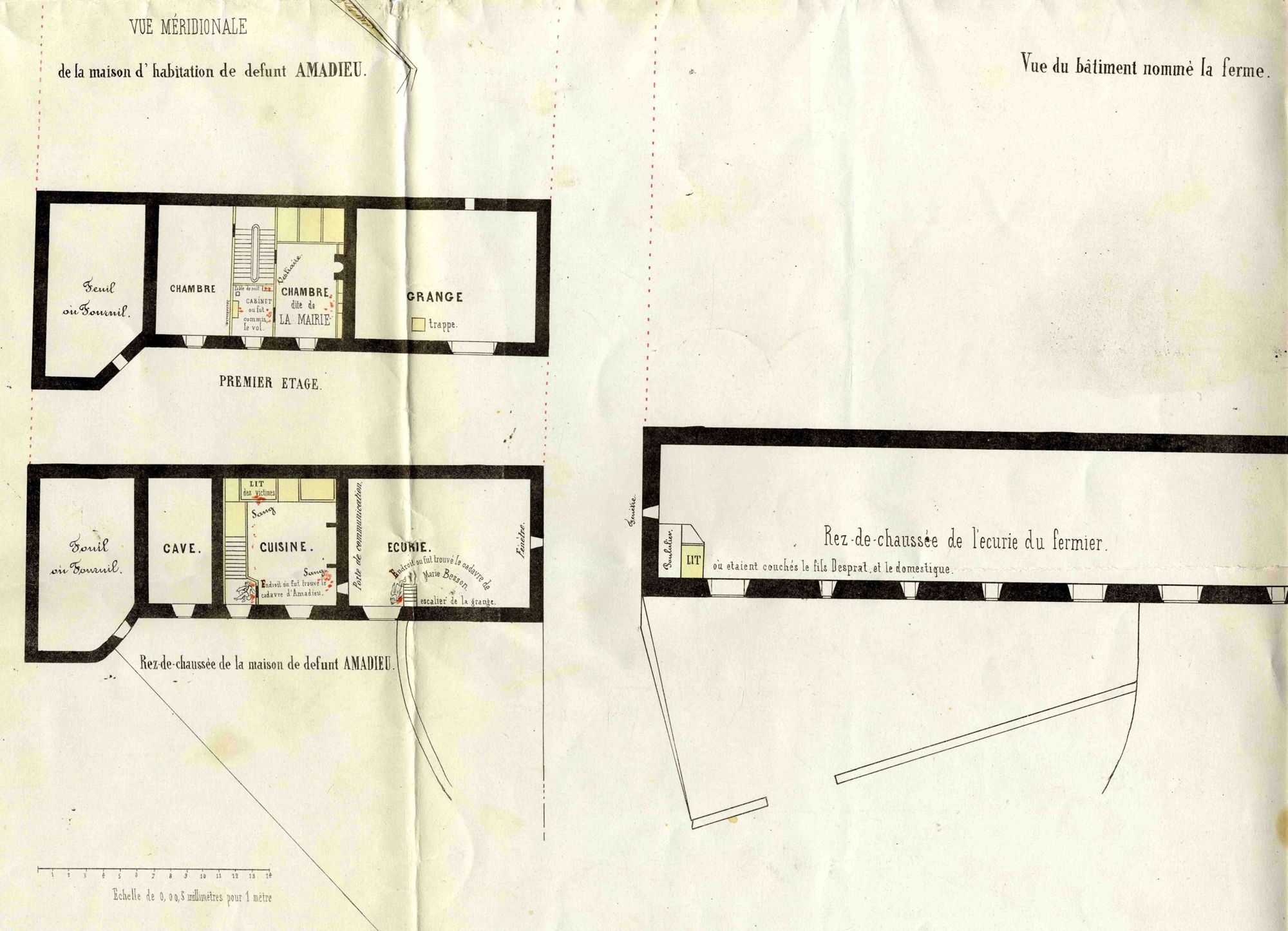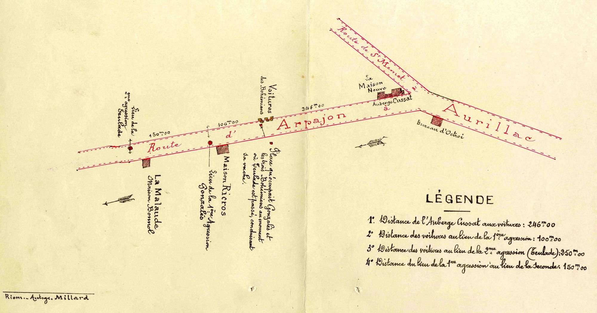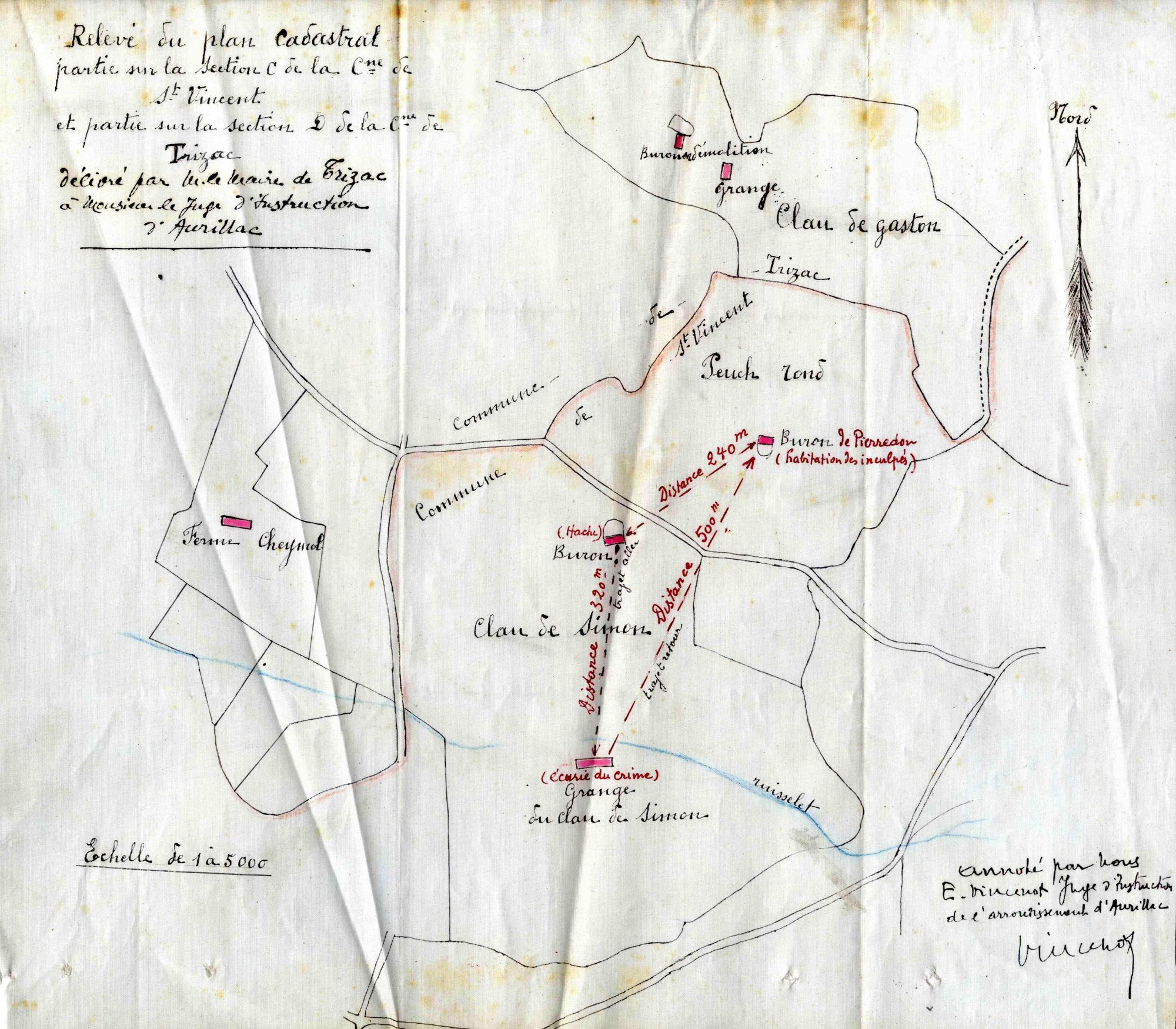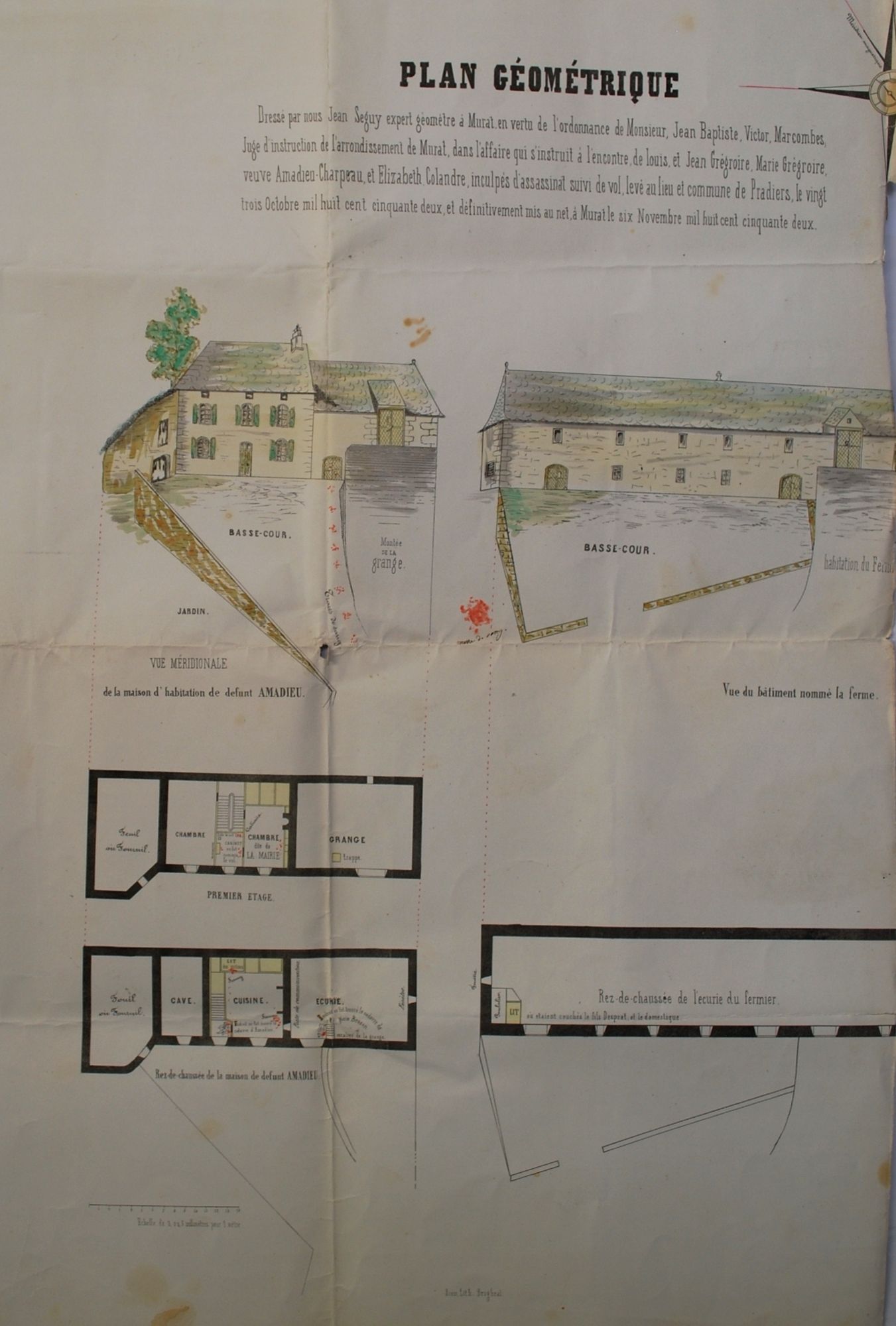 Le plan, dressé par Jean Seguy, expert géomètre à Murat, a été lithographié à Riom par Brugheat, puis mis en couleur, ce qui permet de matérialiser les taches de sang.