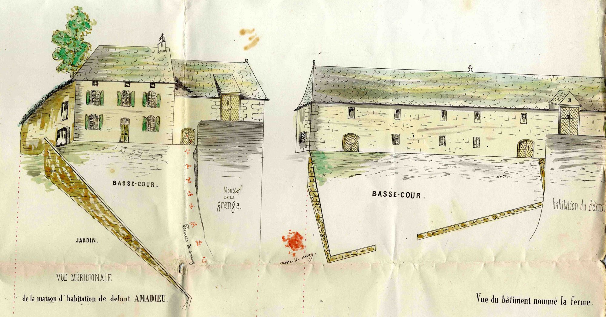 Anne Vialard, veuve de Jean-Paul Compans, possède le pré de la Clède ou Joignal (A) ; elle prétend pouvoir l’arroser en prenant, du vendredi matin au lundi matin, les eaux du pré voisin et supérieur des Uttes, appartenant à Dejou, juge de paix, et à sa femme née Daudin. Calvinhac, l’expert, relève que ces prés n’en formaient jadis qu’un seul, appartenant sous l’Ancien Régime à Pagès des Uttes (alias des Huttes), procureur du Roi au bailliage de Vic, mais qu’il a été scindé par vente en 1760. En 1761 eut lieu le partage des eaux à peu près tel que le soutient la veuve Compans. Mais les sources et les eaux ont changé, car Daudin, le père de Mme Dejou, a drainé le pré des Uttes pour alimenter un moulin à farine (F).