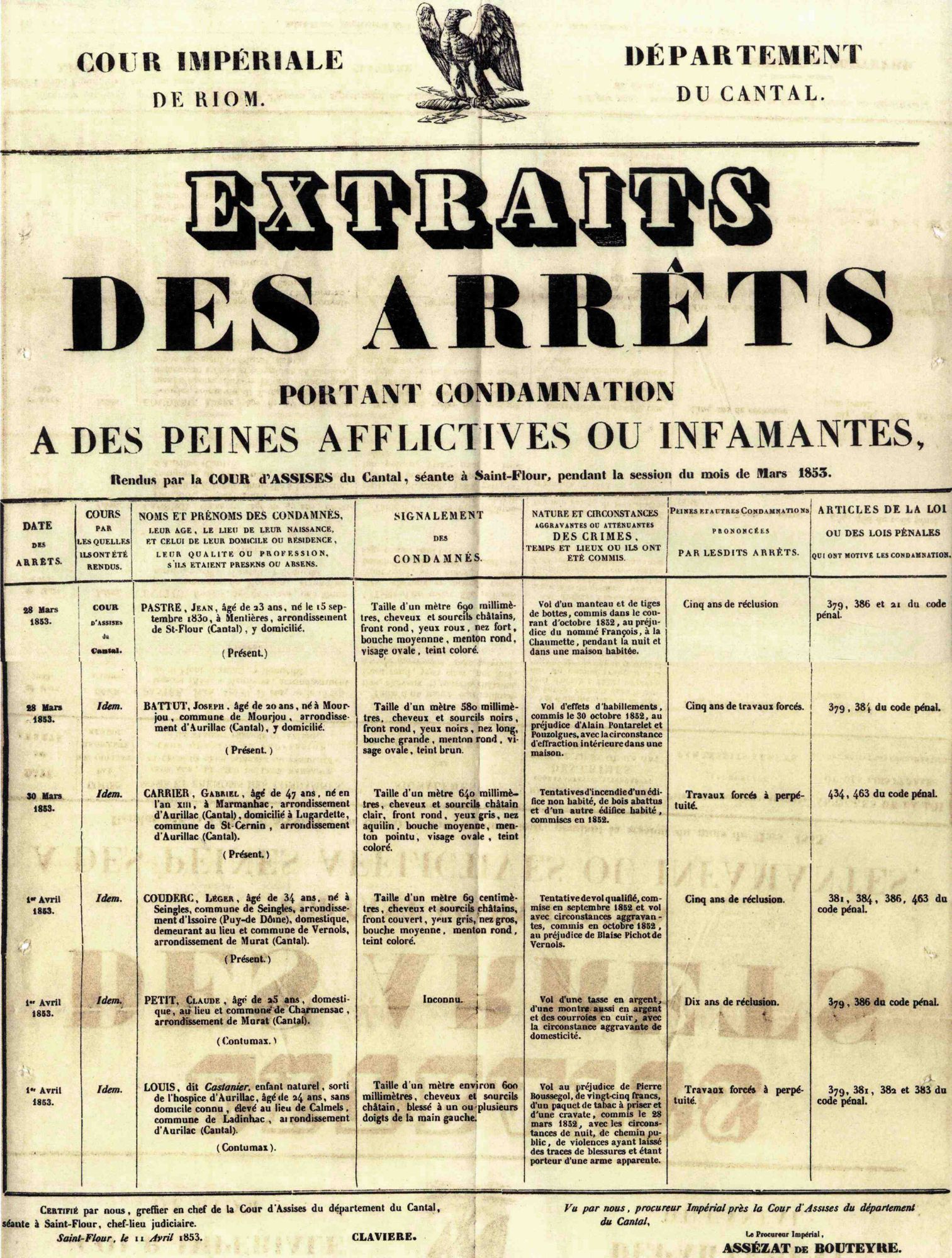 La peine de ces six hommes va de cinq ans (travaux forcés ou réclusion) à la perpétuité. La peine la plus grave touche Louis, dit Castanier, enfant naturel sorti de l’hospice d’Aurillac, qui a volé 25 francs, du tabac et une cravate, mais dont le larcin est aggravé par les circonstances : la nuit, sur un chemin public, avec violence et une arme apparente.
