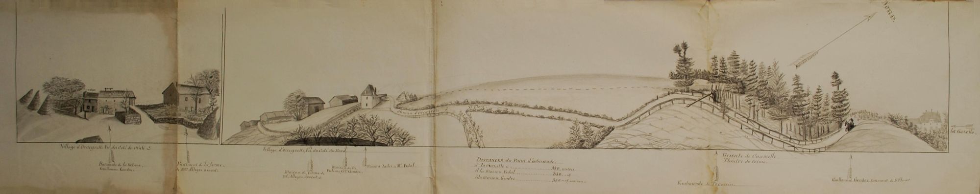 Le dessin détaille la couverture des maisons : lauze en bleu et paille en jaune. Les petits croquis panoramiques permettent de se faire une idée des accidents du relief.
