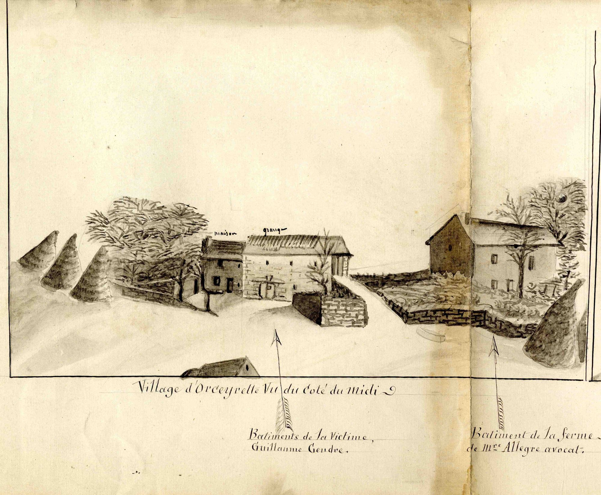 Le chemin de Saint-Flour à Orceyrettes, qu’aurait dû suivre Gendre si l’on ne lui avait pas tendu une embuscade, est représenté tout au long. Le village d’Orceyrettes (Anglards-de-Saint-Flour) est représenté en gris, mais de manière réaliste.