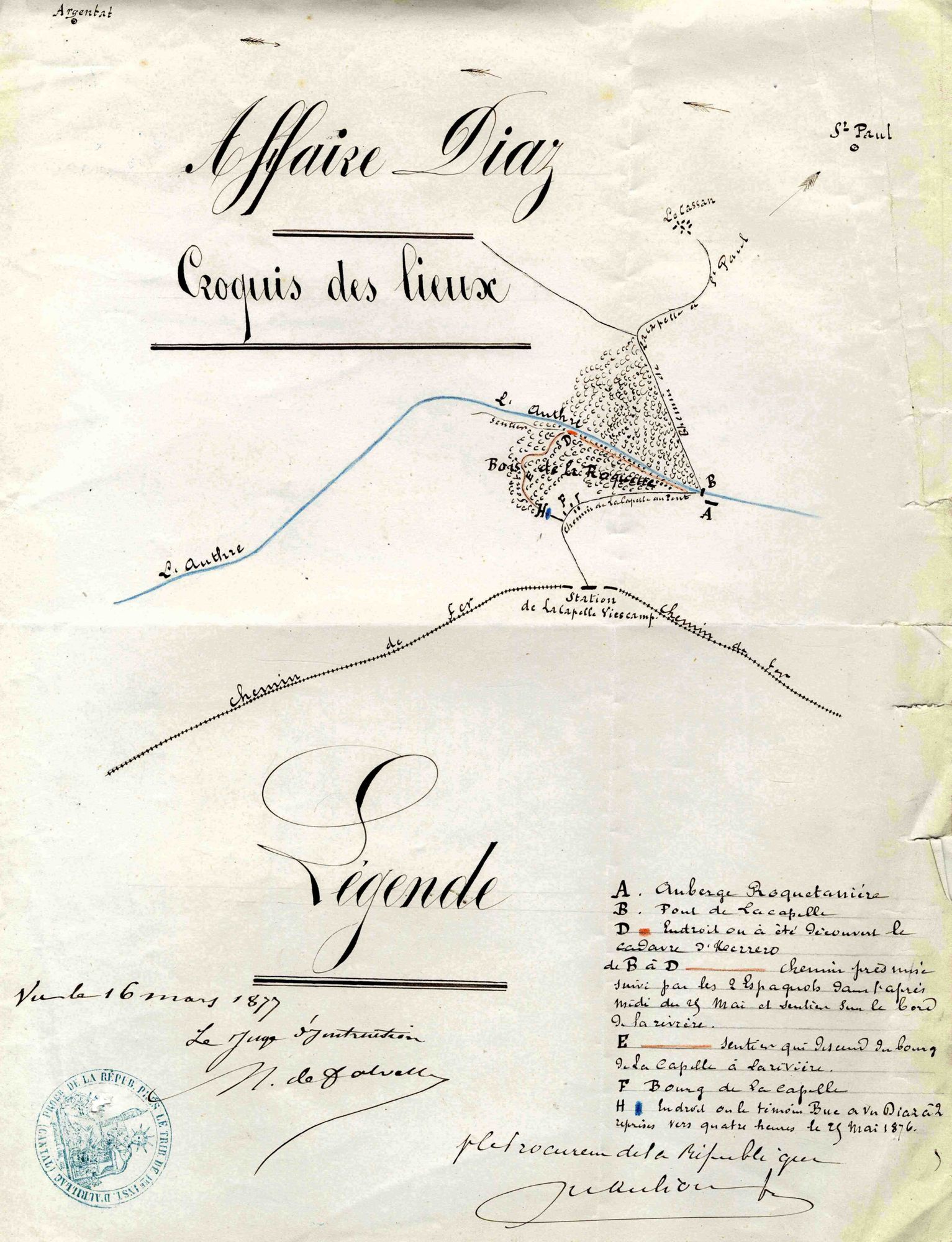 Le plan, précis mais succinct, montre que le crime s’est déroulé non loin de la station ferroviaire, alors nouvelle, de la Lacapelle-Viescamp.