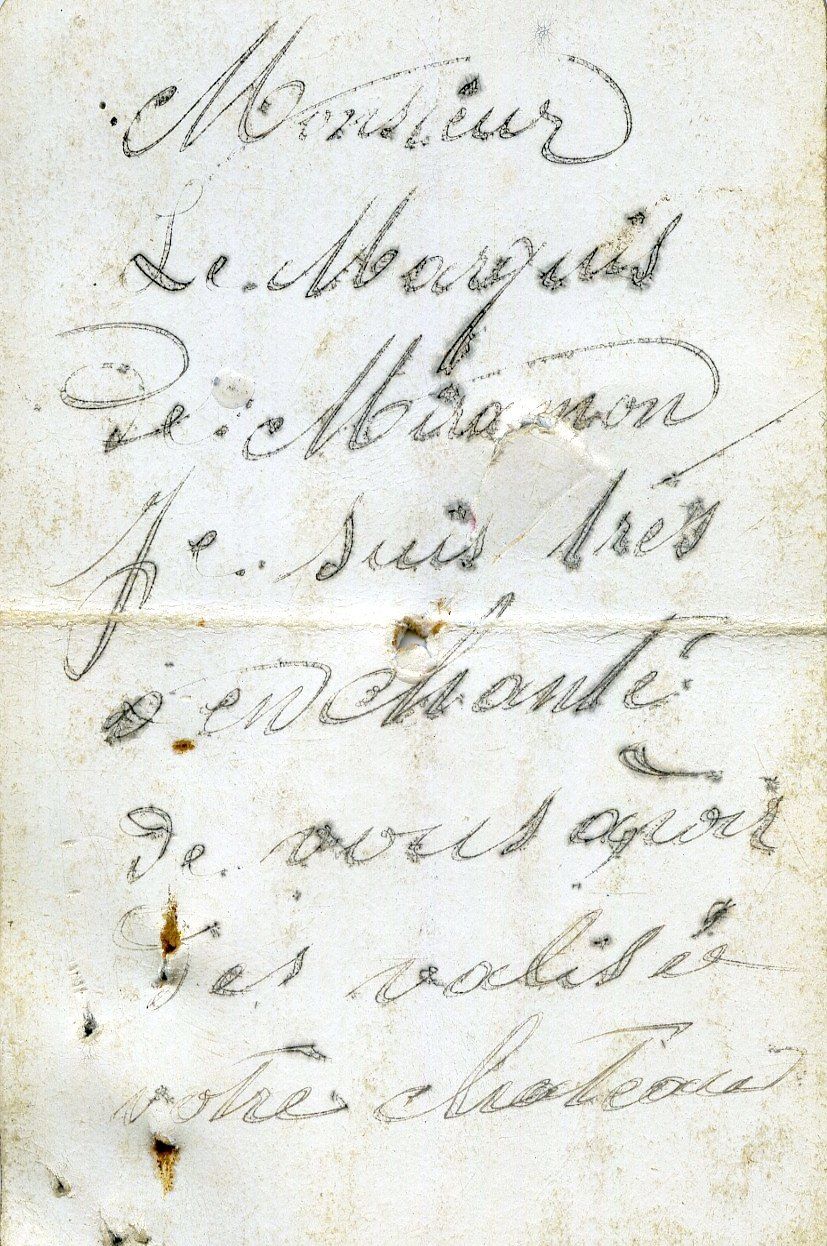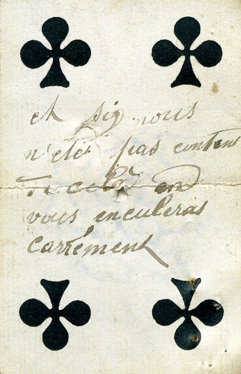 Le 4 de trèfle porte une apostille, explicite malgré son orthographe phonétique : « Monsieur le Marquis de Miramon, je suis tres enchanté de vous avoir des valisée votre château. Et si vous n’etes pas contant de cela on vous enculeras carrément ».