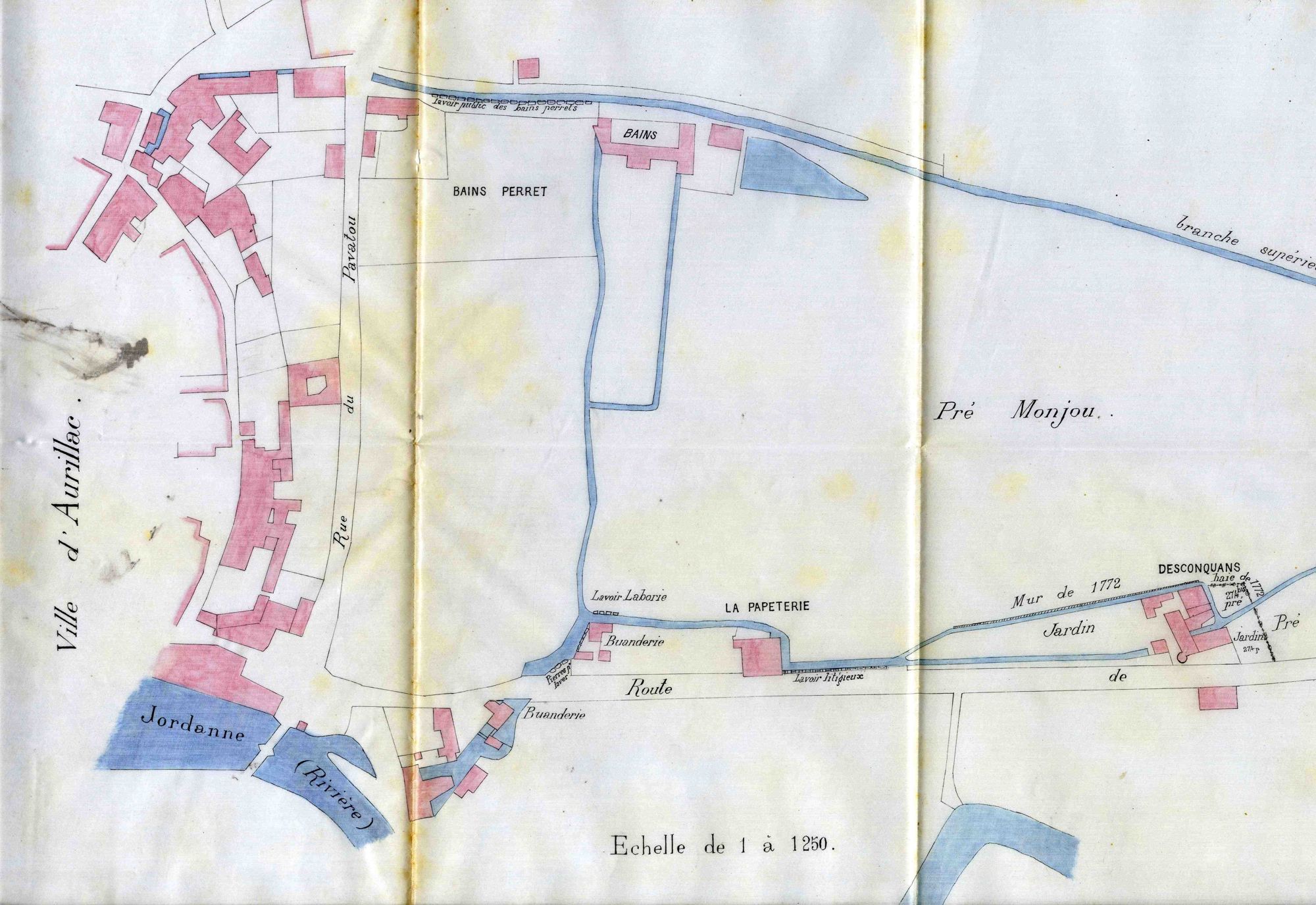 Le plan, qui montre la physionomie des quartiers nord d’Aurillac (bains Perret, lavoirs, buanderies, papeterie, moulins, usines), est accompagné d’un reportage photographique sur les lavoirs de la ville, alors dans des stades d’aménagement divers : pierres plates systématiquement posées au bord de l’eau, plantation de piquets.