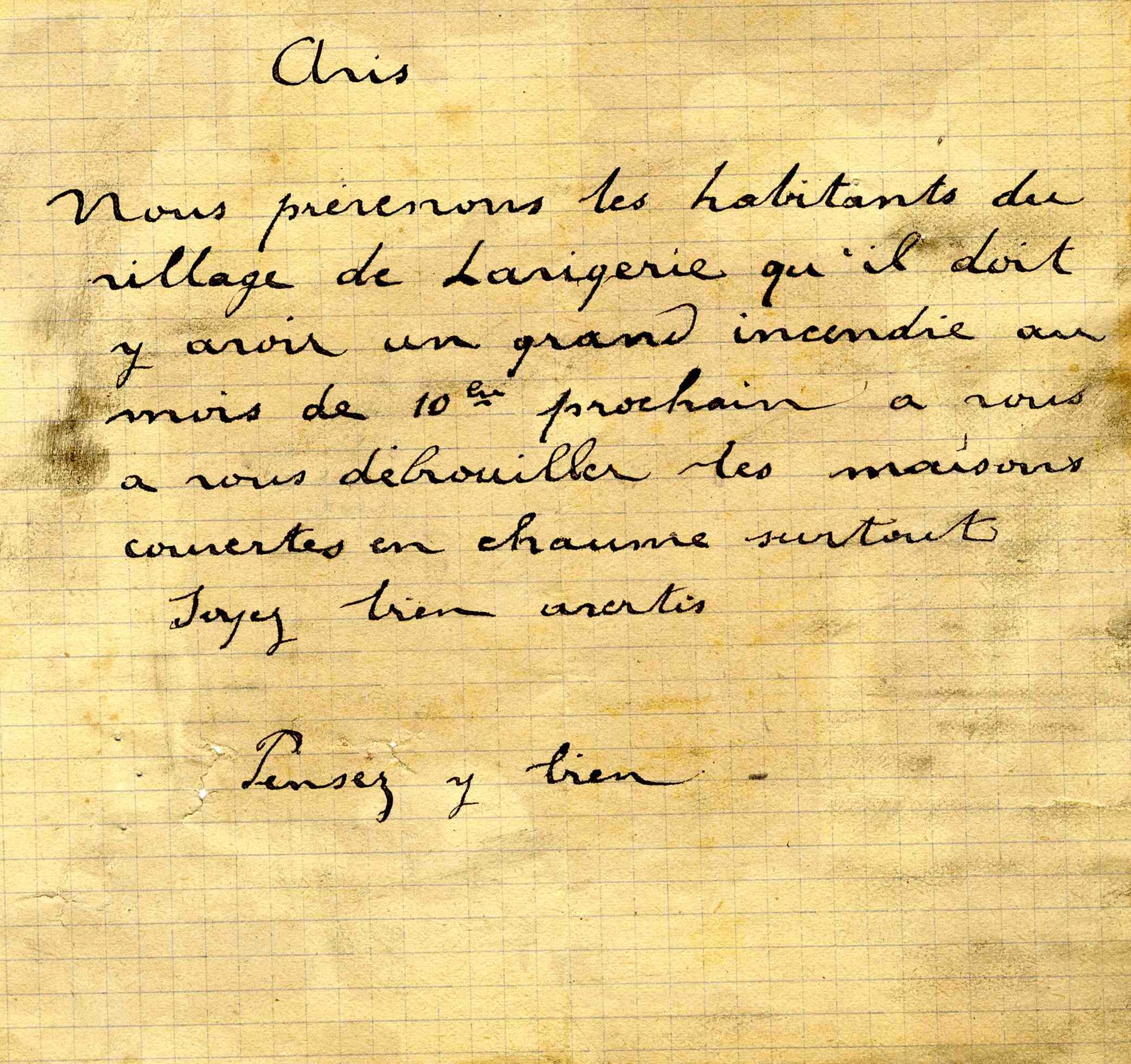 Nous prevenons les habitants du village de Lavigerie qu’il doit y avoir un grand incendie au mois de décembre prochain a vous a vous débrouiller les maisons couvertes en chaume surtout.