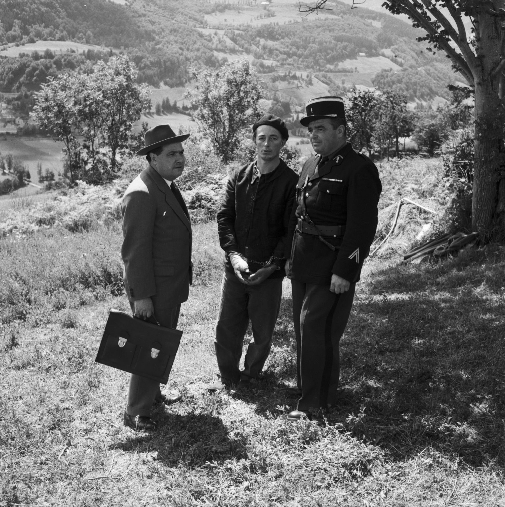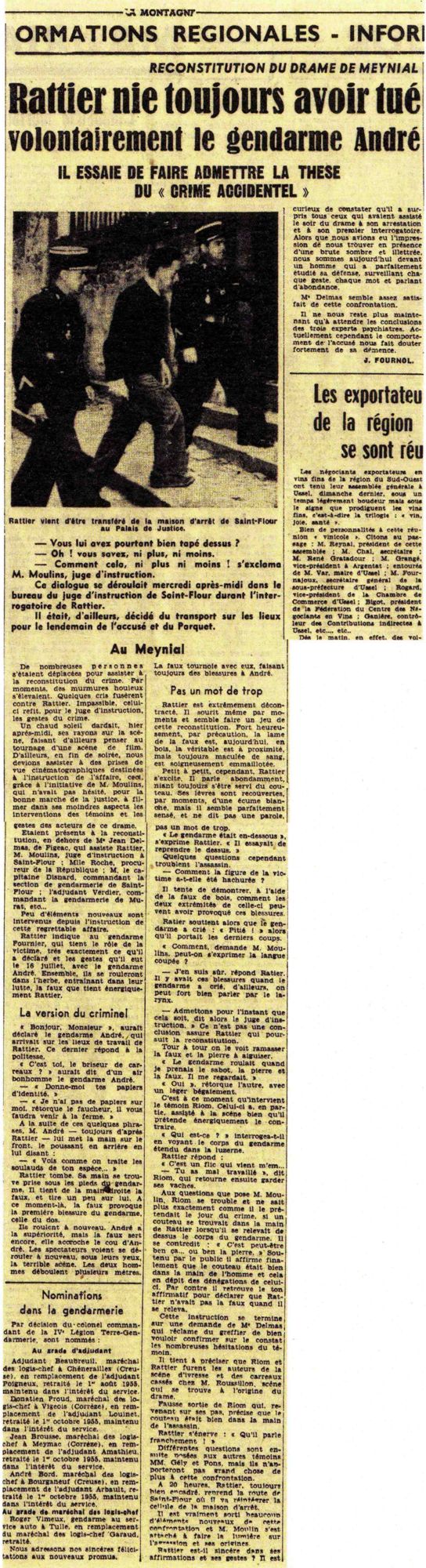 Le 16 juillet 1956, le gendarme André tombe sous le coup de la faux et du couteau de Rattier, qu’il était venu interpeller. La veille, Rattier, âgé de 32 ans avait, sous l’emprise de l’alcool, brisé les vitres du café du Meynial de Laveissière. Début août, le juge d’instruction Moulins dirige les opérations de reconstitution, qui seront même filmées, sous un splendide soleil d’été. La lame de la faux a été remplacée par une lame de bois. L’inculpé, main bandée car il s’est blessé trois semaines plus tôt en accomplissant son forfait, a le cheveu en bataille lorsqu’il quitte son béret basque. Jugé irresponsable, il est interné à vie à l’hôpital psychiatrique d’Aurillac.