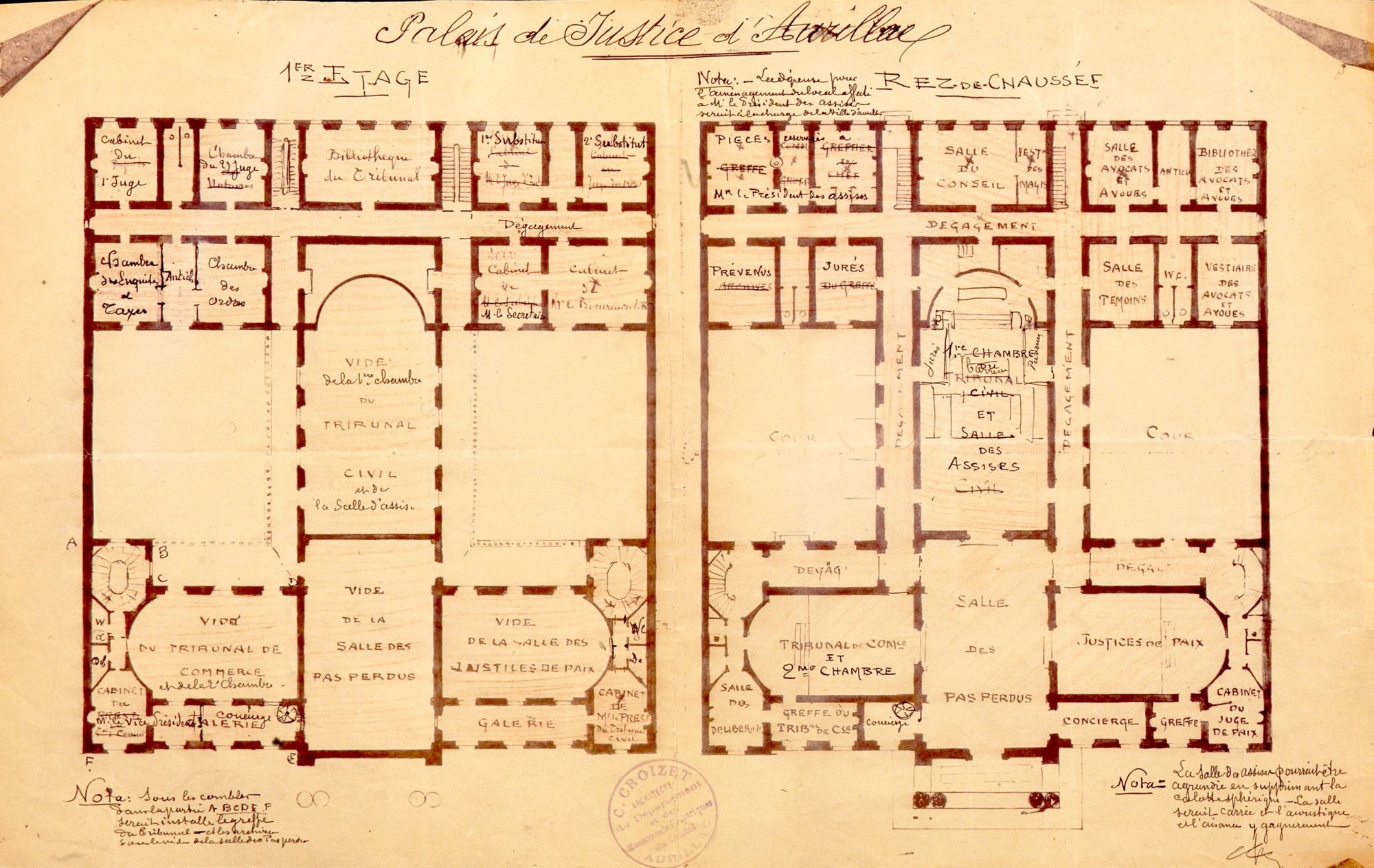Le palais de justice d’Aurillac fut inauguré en 1872. Si la juridiction se trouve toujours dans les mêmes locaux, l’affectation de certaines pièces a quant à elle changé. Ce plan modifié en 1958 raconte l’histoire de la juridiction. Au rez-de-chaussée, l’espace s’organise autour de la salle des pas perdus et de la salle d’audience ; de part et d’autre se trouvent les salles du tribunal de commerce et des justices de paix (Aurillac nord et Aurillac sud) ; derrière elle se trouve la chambre du conseil, flanquée du greffe et de ses archives, d’un côté, des locaux des avocats et avoués (supprimés en 1975 pour les tribunaux de grande instance) de l’autre. Au premier étage, on peut remarquer que le cabinet du procureur est plus grand que celui du président du tribunal civil ou de commerce.
