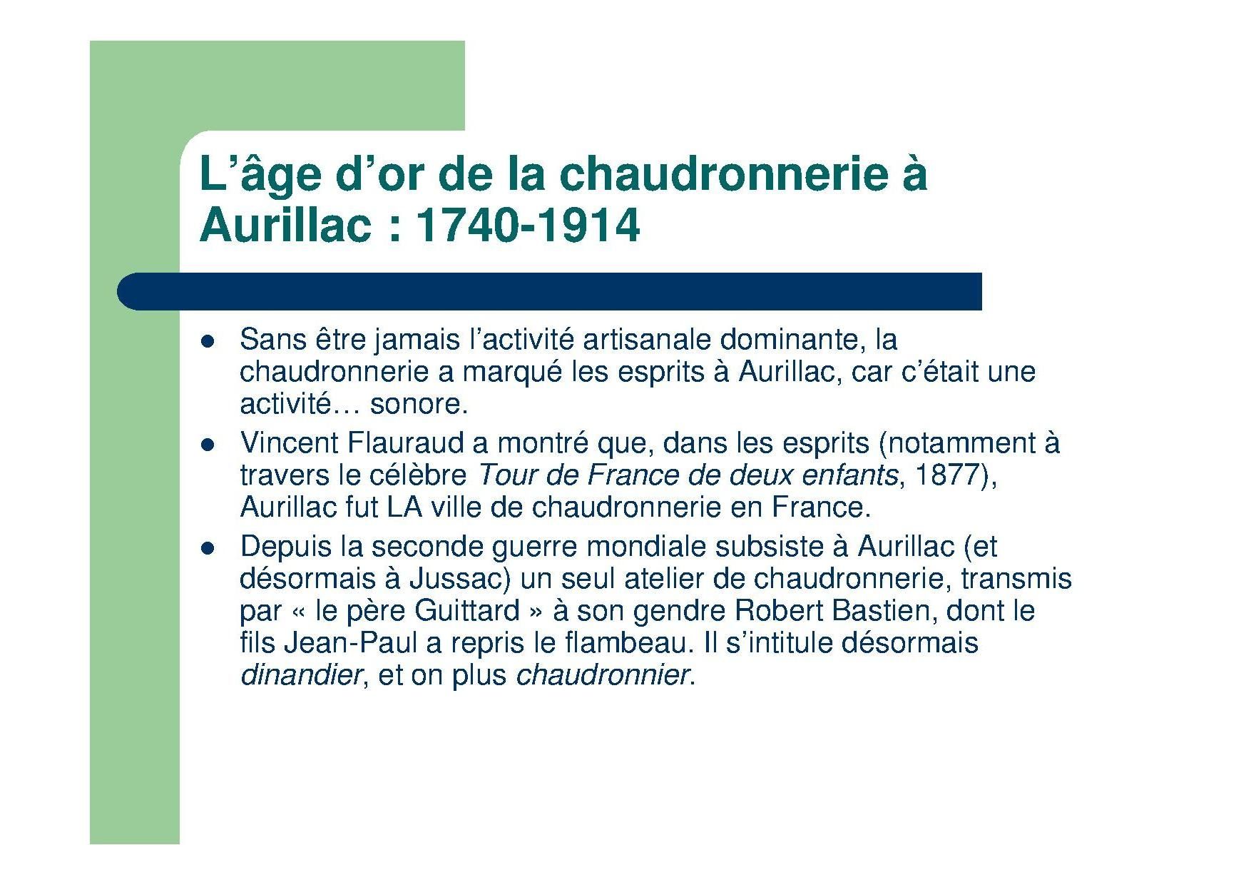 Vincent Flauraud a montré que, dans les esprits (notamment à travers le célèbre Tour de France de deux enfants, 1877), Aurillac fut la ville de chaudronnerie en France.