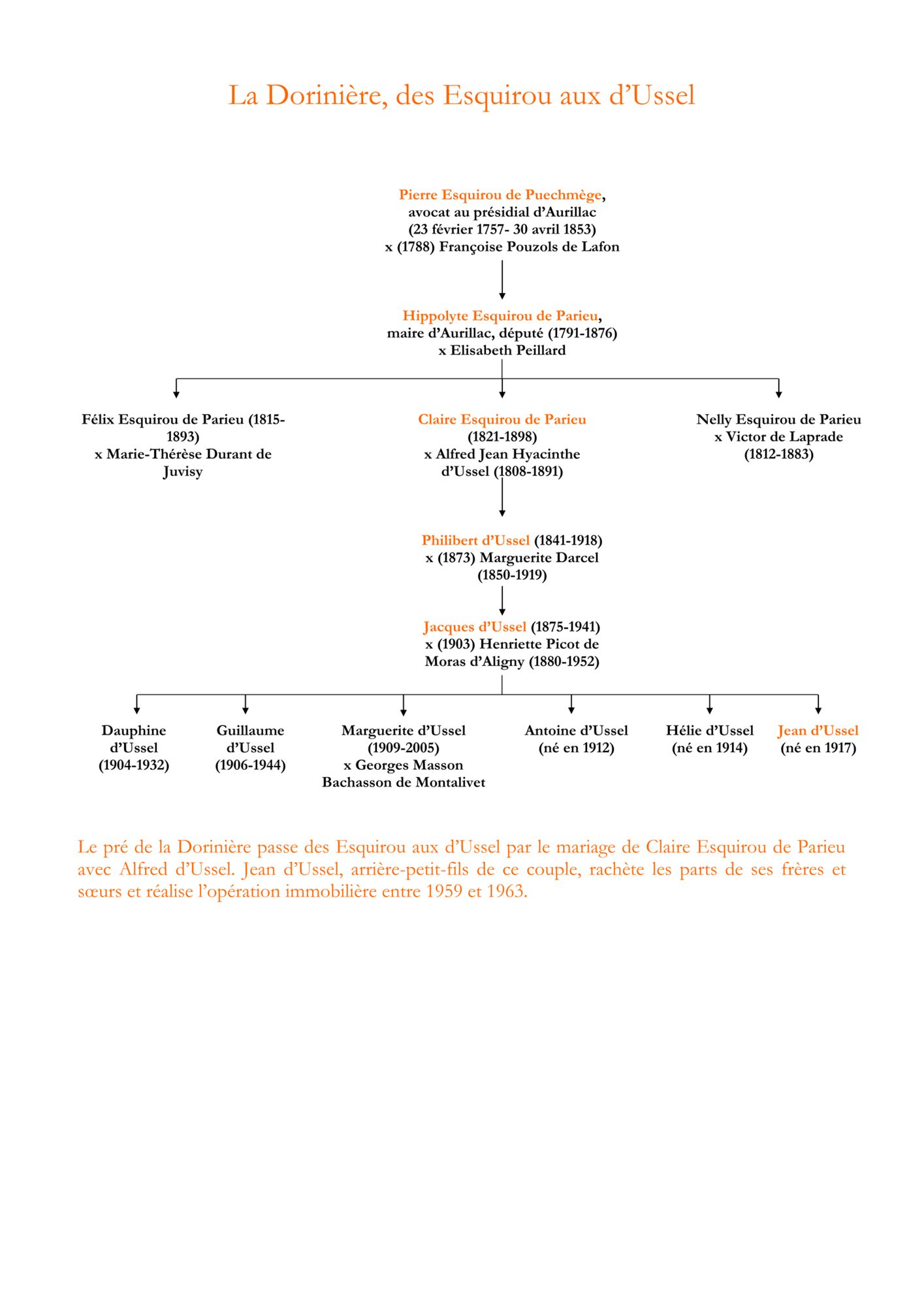 Le comte d’Ussel était mort le 7 décembre 1941 à Lyon. Le 6 avril 1943 est déclarée la partie cantalienne de sa succession. Il s’agit de trois prés situés dans la partie méridionale d’Aurillac : Soulery (16 hectares, non loin de l’usine Matière), Berthou (10 hectares ; parcelles vendues en 1950 – vente assortie d’un don important – où seront érigés l’église et l’institution Saint-Joseph) et les 4 hectares de la Dorinière. Ces prés deviennent indivis entre les cinq enfants : Guillaume, Marguerite, Antoine, Hélie et Jean, dont la filiation est expliquée par la généalogie.